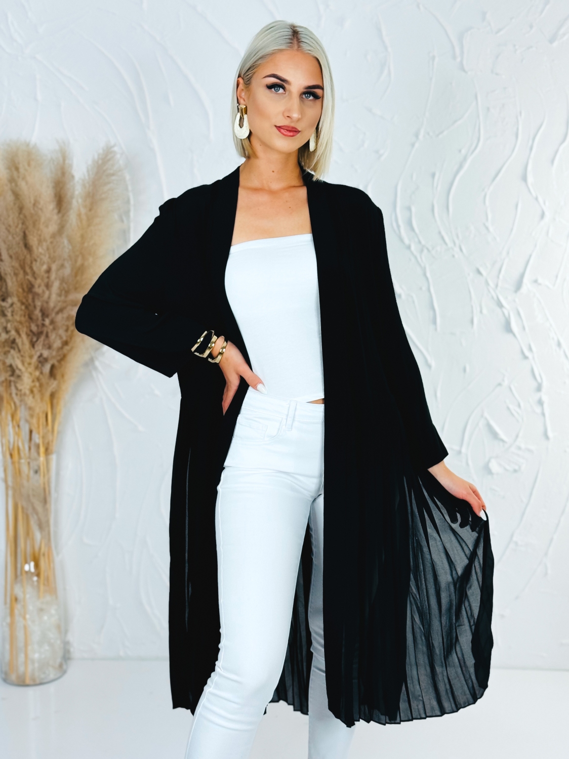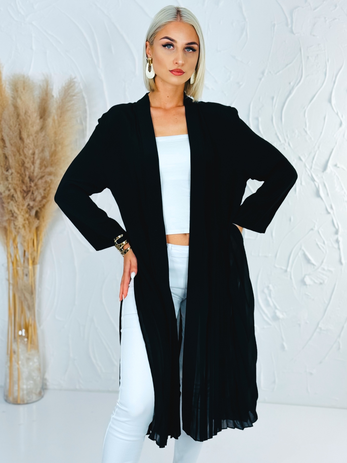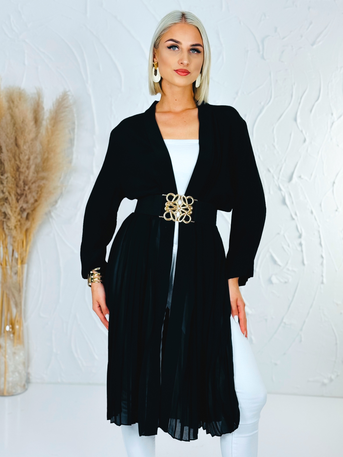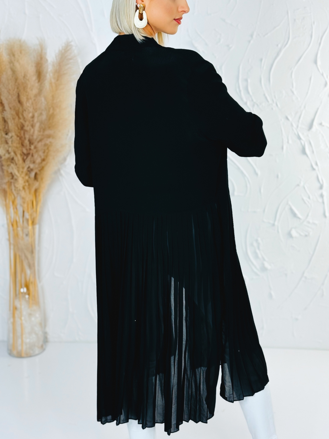 Opasok nie je súčasťou prehozu, ale je možné si ho u nás dokúpiť, vďaka čomu si vieš vzhľad prispôsobiť podľa vlastného štýlu. Dámsky elegantný čierny prehoz s plisovanou spodnou časťou je štýlový a nadčasový kúsok, ktorý dodá každému outfitu ženskosť a eleganciu. Plisovaná spodná časť vytvára jemný a vzdušný efekt pri chôdzi, čo pôsobí veľmi elegantne a zároveň moderne. Čierna farba zabezpečuje univerzálne využitie a jednoduché kombinovanie s rôznymi kúskami v šatníku, či už ide o šaty, nohavice alebo sukne. Prehoz je vhodný na spoločenské príležitosti, do práce aj na bežné nosenie, keď chceš pôsobiť upravene a štýlovo. Jeho voľnejší strih poskytuje pohodlie a zároveň zachováva elegantnú siluetu. Vďaka svojmu dizajnu je ideálnou voľbou pre ženy, ktoré preferujú kombináciu jednoduchosti, elegancie a moderného vzhľadu.