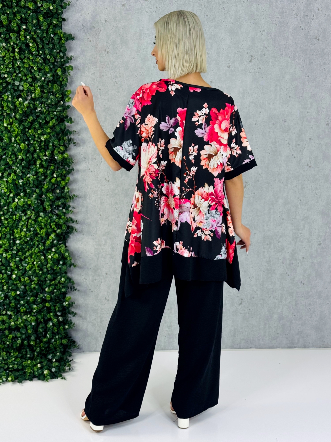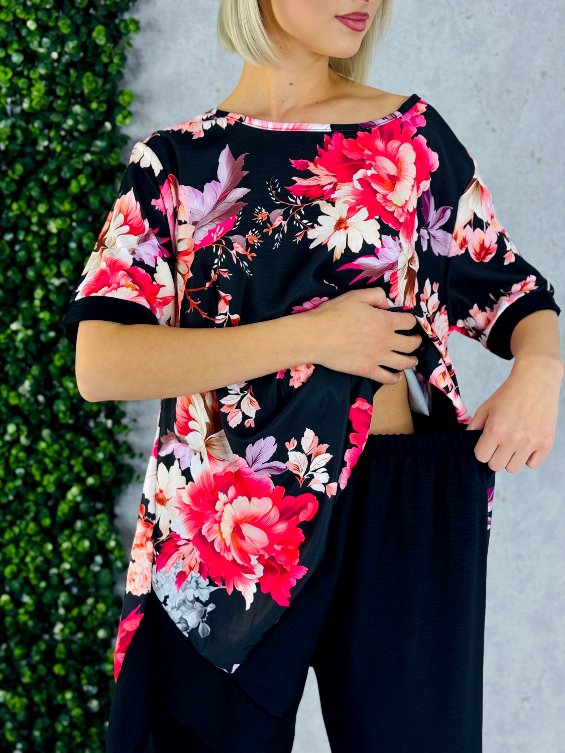 Tento dámsky komplet v modernom oversize strihu je ideálnou voľbou pre ženy, ktoré milujú pohodlie bez kompromisov v štýle. Voľne padnúce široké nohavice s elastickou gumičkou v páse sa dokonale prispôsobia postave, neobmedzujú pohyb a zároveň vytvárajú elegantnú, uvoľnenú siluetu. Vďaka vzdušnému materiálu sú ideálne na každodenné nosenie, ale aj na teplejšie dni, keď oceníš ich ľahkosť a priedušnosť. Vrchný diel tvorí štýlová blúzka s krátkym rukávom, ktorá zaujme jemným kvetinovým vzorom. Ten dodáva celému outfitu ženskosť, sviežosť a romantický nádych. Oversize strih blúzky perfektne ladí s nohavicami a vytvára harmonický, trendy komplet, ktorý pôsobí nenútene, no zároveň veľmi vkusne. Komplet je skvelou voľbou na rôzne príležitosti – či už ideš na prechádzku mestom, stretnutie s kamarátkami alebo si chceš dopriať pohodlný, no štýlový outfit do práce. Jednoducho ho skombinuješ s teniskami pre ležérny look alebo sandálmi pre elegantnejší dojem. Tento outfit je dôkazom toho, že aj pohodlné kúsky môžu byť krásne, ženské a moderné zároveň.
