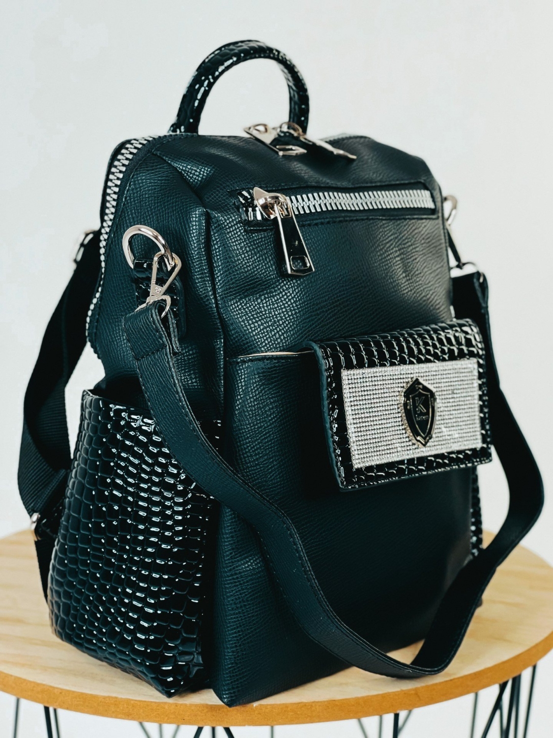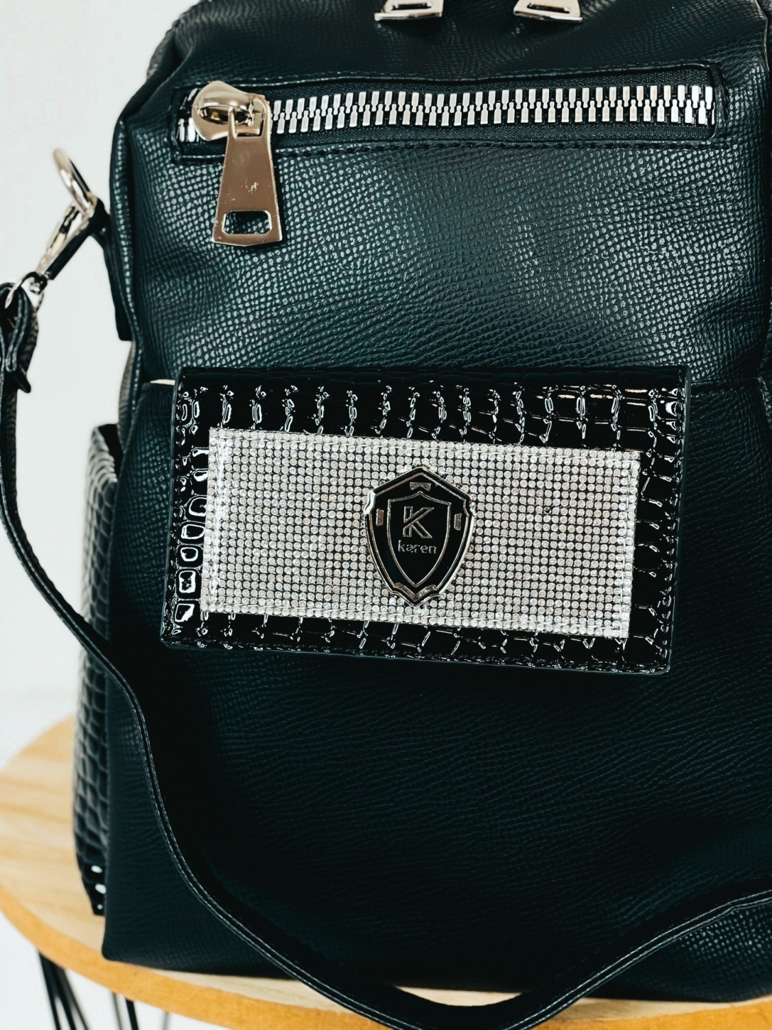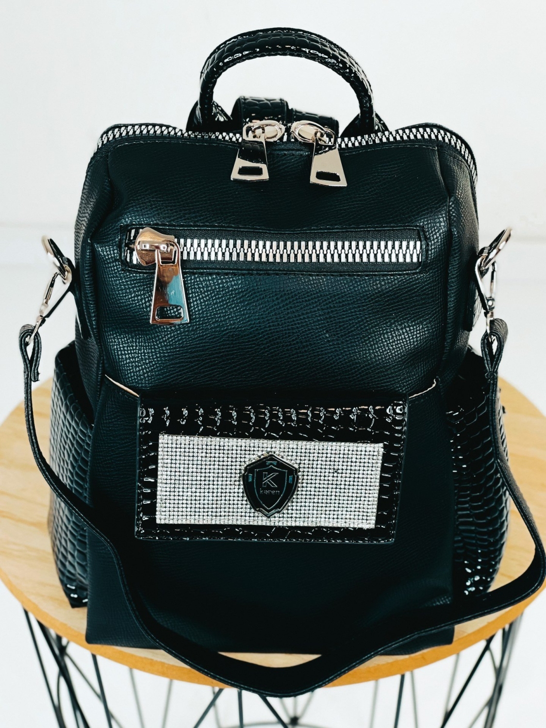 Dámsky trendový vak v čiernej farbe s predným vreckom na zips K. Vrecko v prednej časti je zdobené kamienkami. Skvelý dizajn, ktorý okmažite zaujme Vaše okolie. Nadčasovosť a klasika. Vrecka na oboch stranách. Vak je vyrobený z kvalitného a pevného materiálu s dostatočným priestorom vo vnútri. Dokombinujte ich napríklad džínsami, teniskami a mikinou a trendy mladistvý vzhľad je na svete. Praktický doplnok Vášho outfitu. Ihneď si ho zamilujete a bude Váš každodenný spoločník. Navrhnutý podľa najnovších trendov.