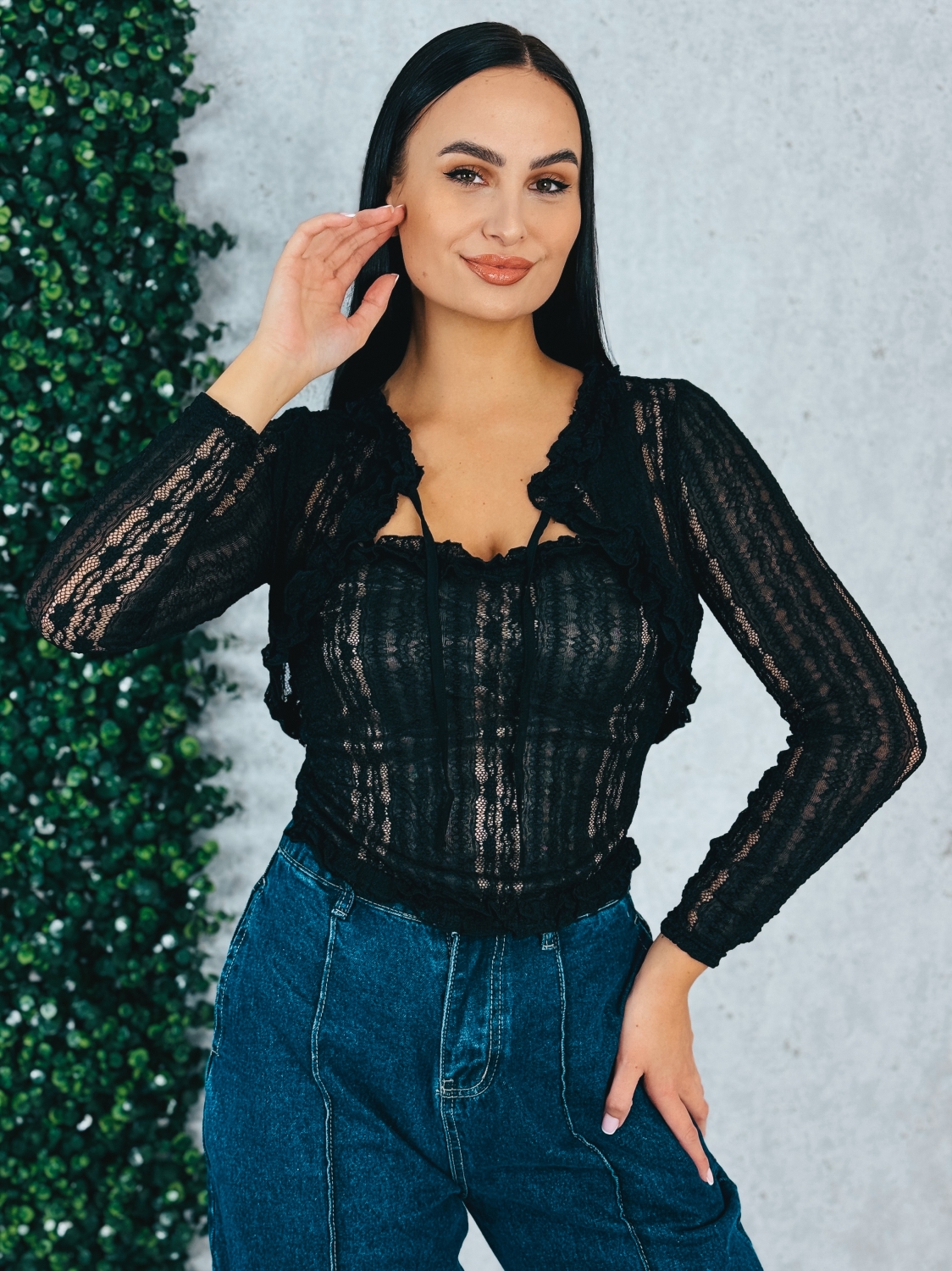 Zahaľ sa do nežnosti s naším Roromantickým kompletom, ktorý spája ženskosť, eleganciu a jemnú zmyselnosť v jednom kúsku. Tento nádherný čipkovaný set v krásnom odtieni je stelesnením romantiky – ideálny na večerné stretnutie, fotenie, ale aj bežný deň, keď chceš pôsobiť výnimočne. Vrchný diel má ľahko priliehavý strih, ktorý krásne zvýrazní siluetu, volánikové detaily na dekolte a rukávoch dodávajú outfitu jemný retro nádych. Priehľadné čipkované rukávy pôsobia sofistikovane, zatiaľ čo tenké ramienka a mašličky podčiarkujú ženskosť celého modelu. Materiál je jemný, priedušný a elastický, takže sa prispôsobí tvojmu telu a zabezpečí maximálne pohodlie počas celého dňa. Skombinuj ho s džínsami pre ležérny romantický look alebo s elegantnou sukňou na večerné príležitosti. Tento komplet nie je len oblečenie – je to výpoveď tvojho štýlu, sebavedomia a jemnosti.