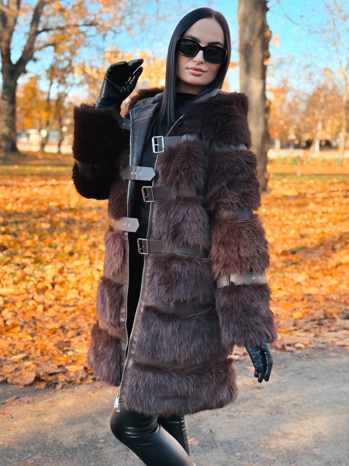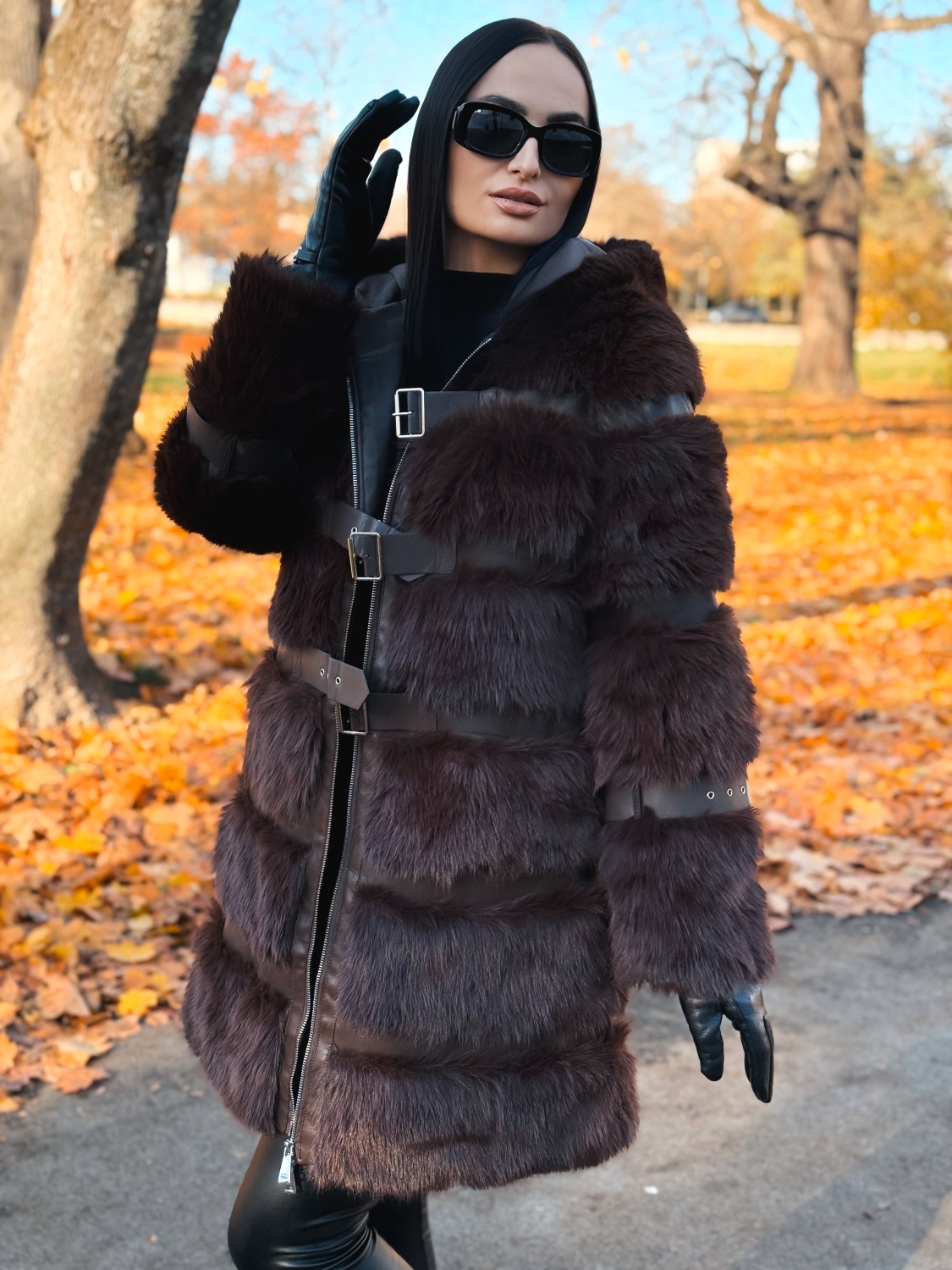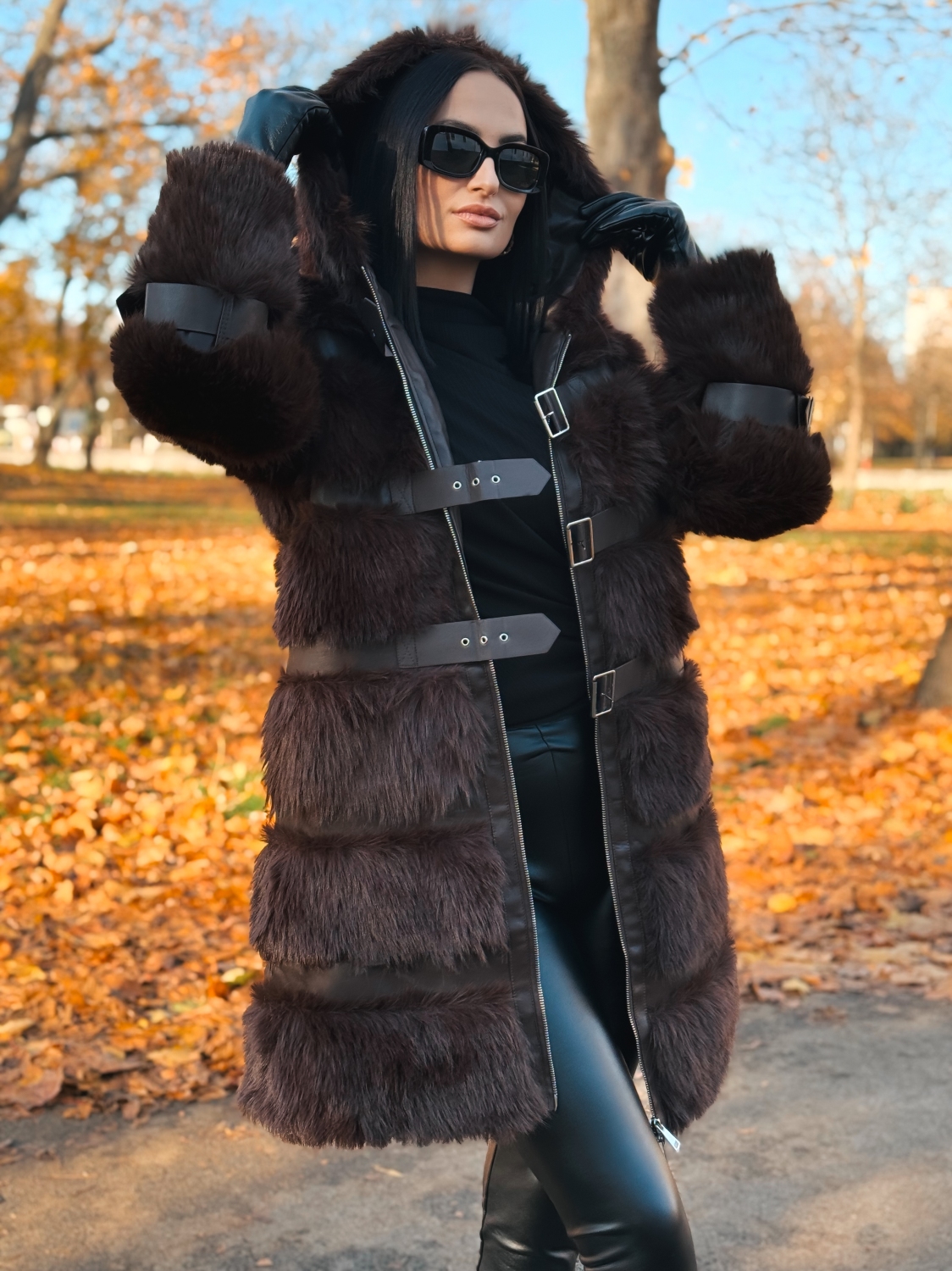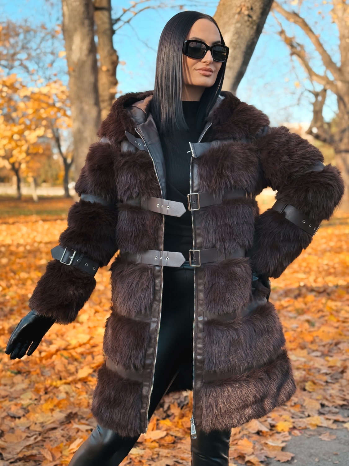 Dámsky dlhý hnedý kožuch s kapucňou LEMILA - M
