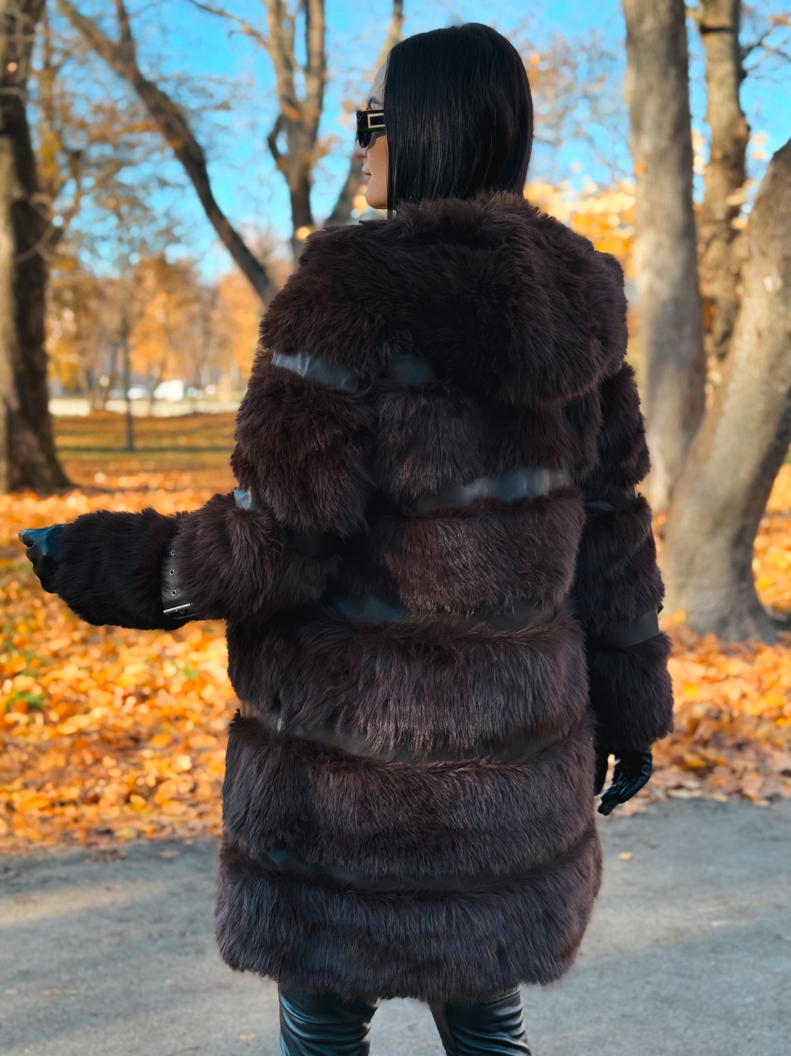 Dámsky dlhý hnedý kožuch s kapucňou LEMILA
