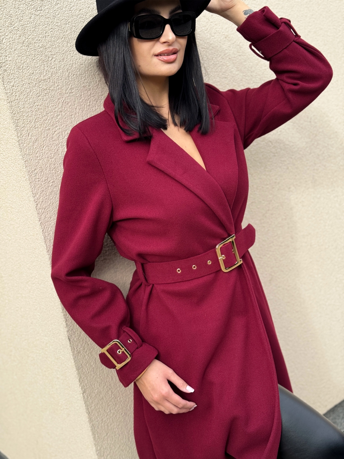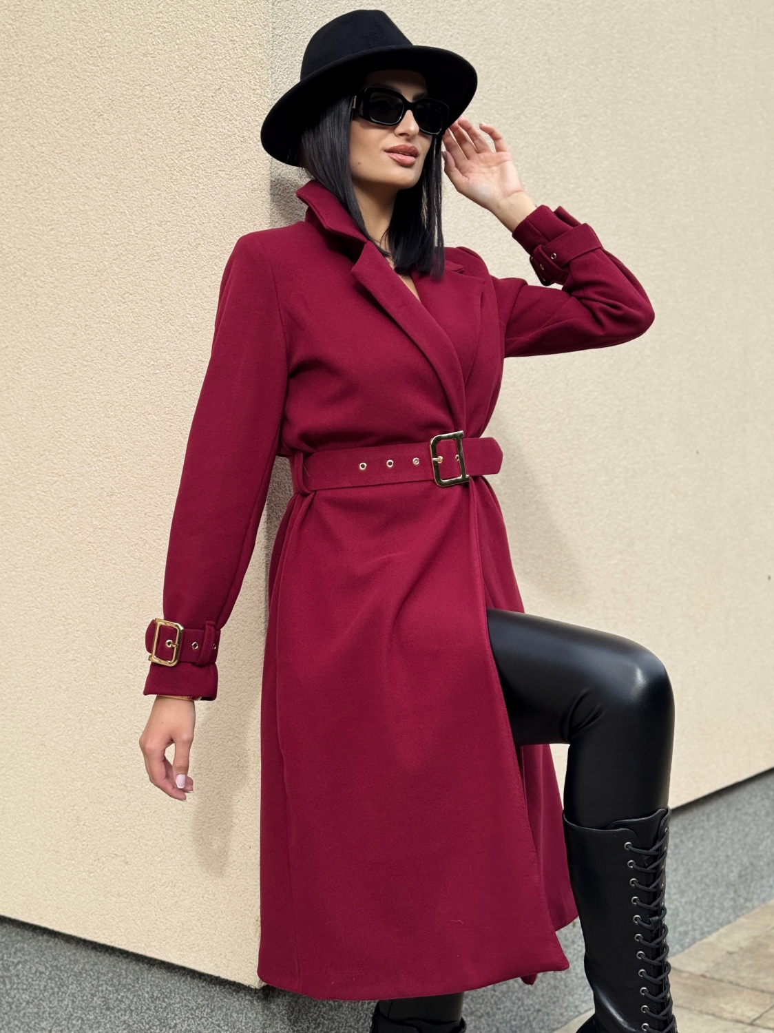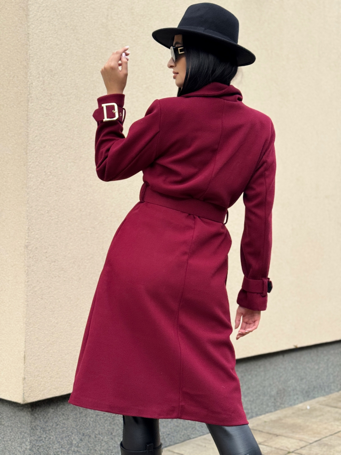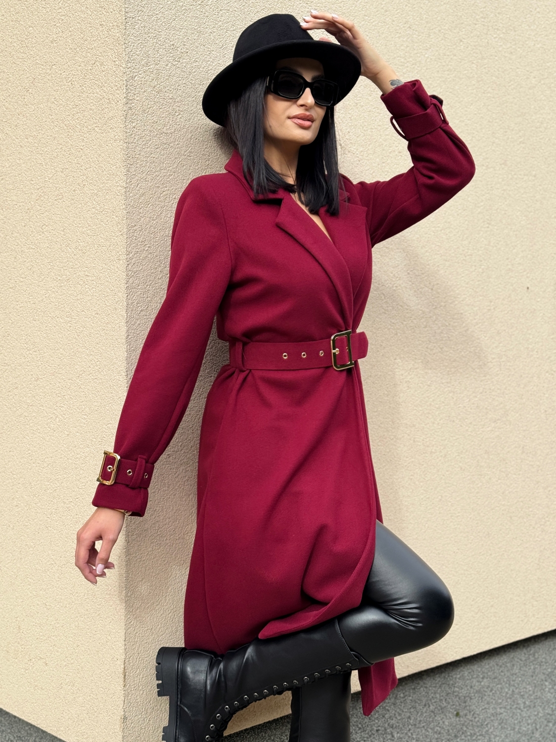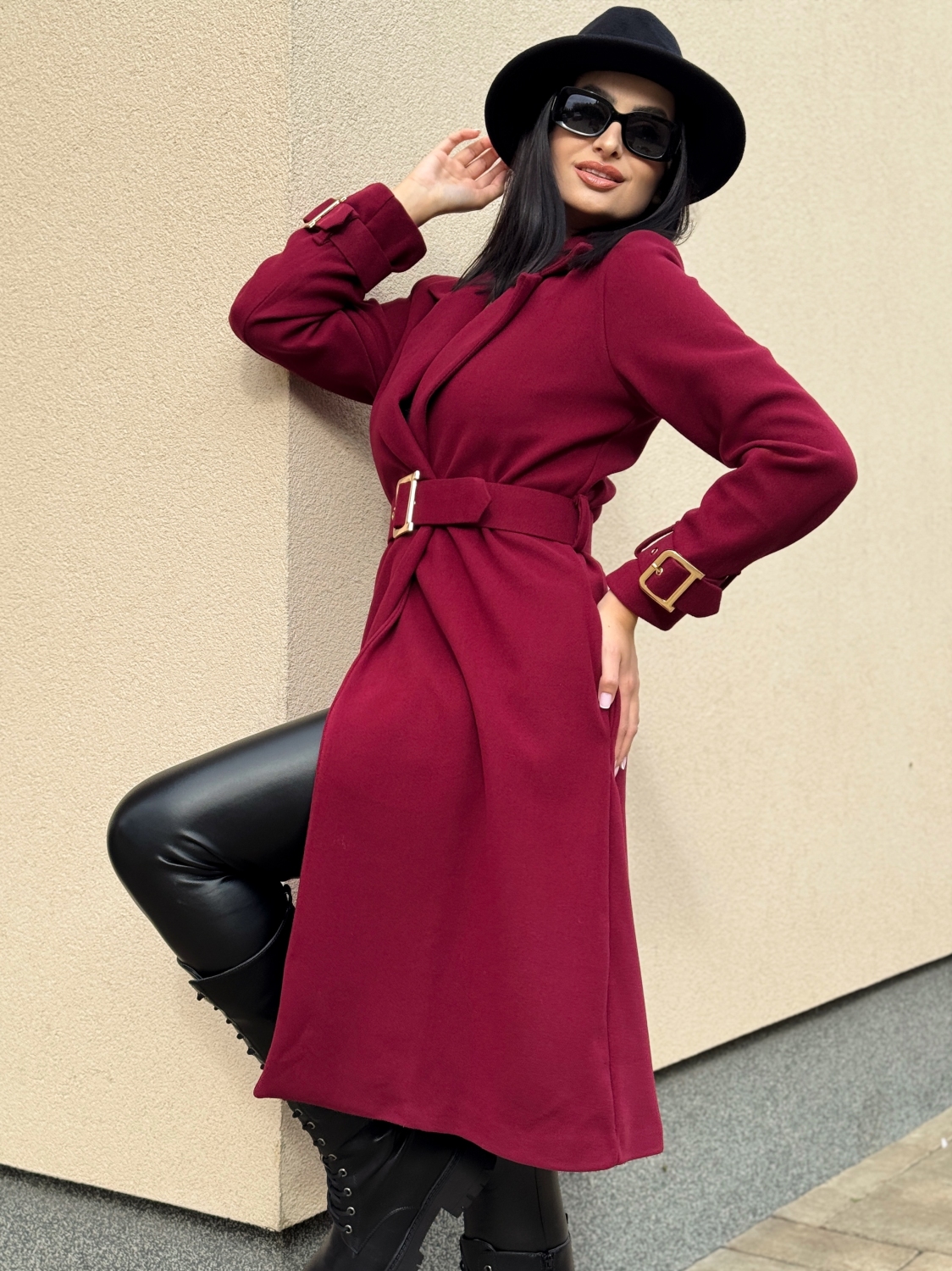 Objav jedinečné spojenie elegancie, štýlu a sebavedomia s týmto nádherným dámskym kabátom. Bordová farba symbolizuje vášeň, silu a ženskosť, vďaka čomu sa v ňom budeš cítiť výnimočne pri každom kroku. Kabát má klasický, mierne priliehavý strih, ktorý krásne zvýrazňuje ženské krivky a pôsobí veľmi sofistikovane. Opasok s výraznou zlatou prackou zvýrazní pás a dodá celkovému vzhľadu šmrnc. Rovnaké pracky na rukávoch pôsobia ako detail, ktorý z neho robí skutočne prémiový kúsok. Kvalitný materiál zabezpečuje príjemné teplo počas chladnejších dní, pričom si zachováva elegantný vzhľad bez zbytočného objemu. Vďaka midi dĺžke a pevnému golieru pôsobí kabát moderne a luxusne zároveň. Dokonale sa hodí k čižmám, lodičkám aj vysokým opätkom. Skvelo doplní elegantný outfit do práce, na večeru či jesennú prechádzku mestom.