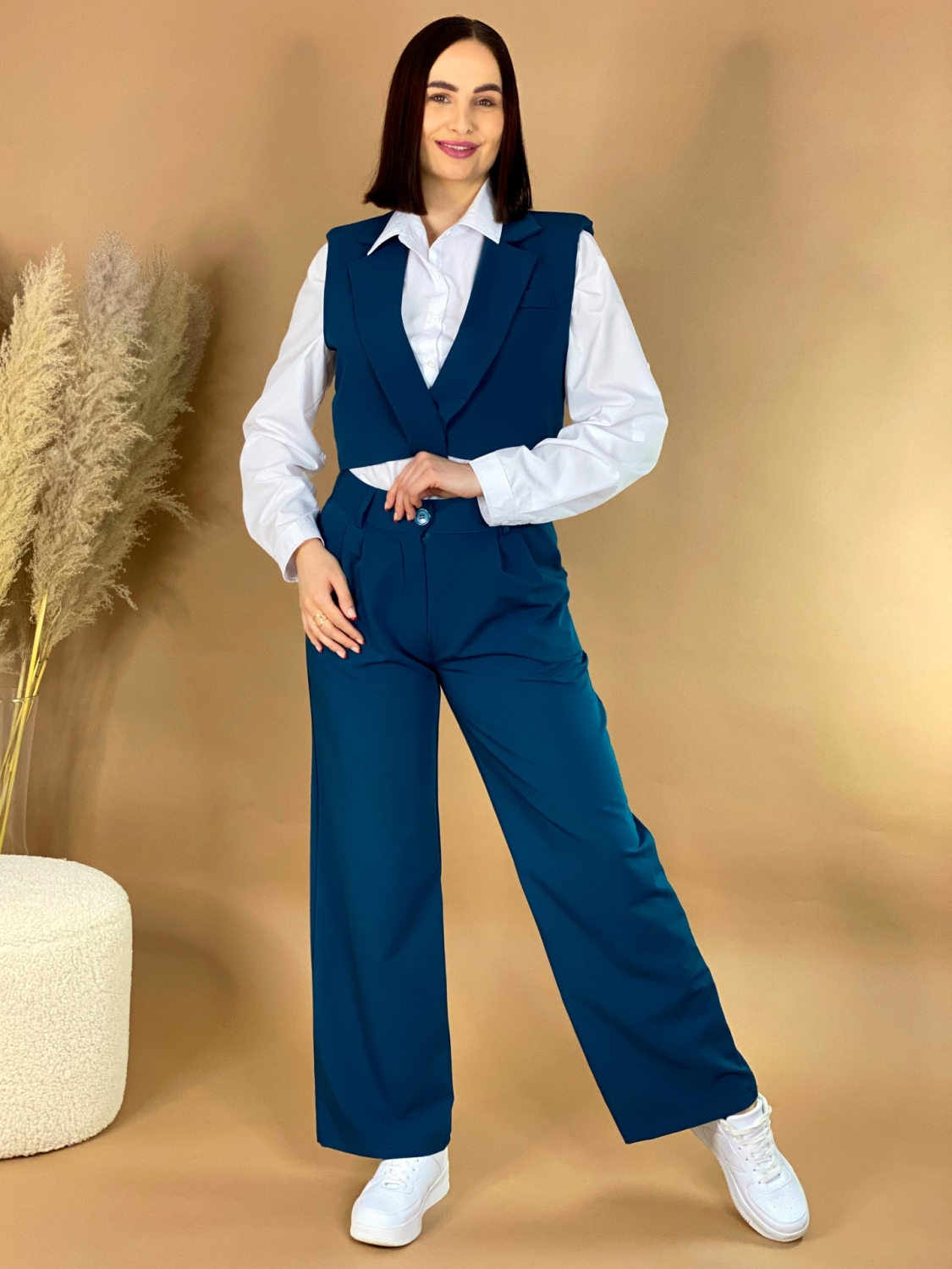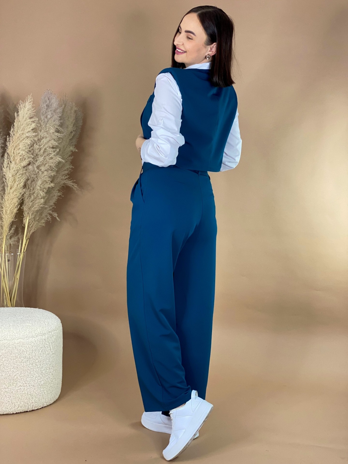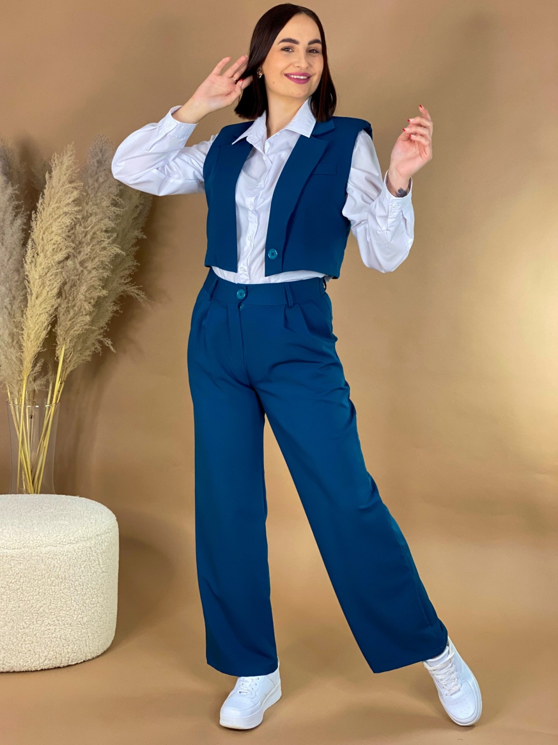 Dámsky trendy KOMPLET nohavice + vesta. Absolútny HIT sezóny, ktorý si zamiluje každá správna nákupna maniačka. Nohavice sú s gumičkou v páse a spodná časť nohavíc je v rozšírenom strihu. Vesta je v skvelom krátkom modernom prevedení a zapína sa vpredu na gombík. Skvelo sa prispôsobí postave. Môžete si ho obliecť vo svojom voľnom čase, ale aj na slávnostejšiu príležitosť. Perfektný strih sadne na väčšinu postáv. Objavte módu, vďaka ktorej máte voľnosť byť sami sebou. Skvelý TRENDY kúsok pre každú trendy žienku, ktorá miluje zaujímavé a neobyčajné kúsky. Modelka je vysoká 175 cm a oblečenú má veľkosť UNI. Komplet môžete doplniť bielou košeľou a teniskami, ale aj lodičkami.