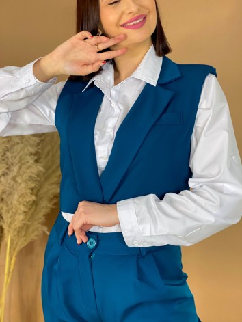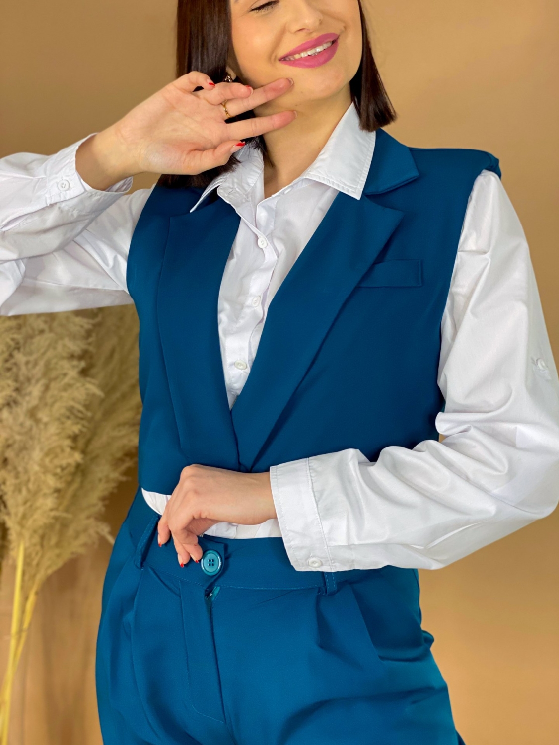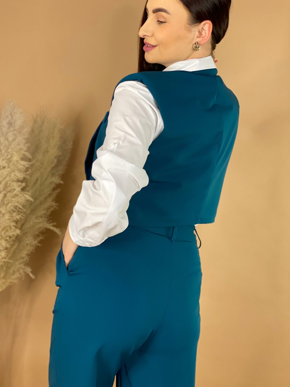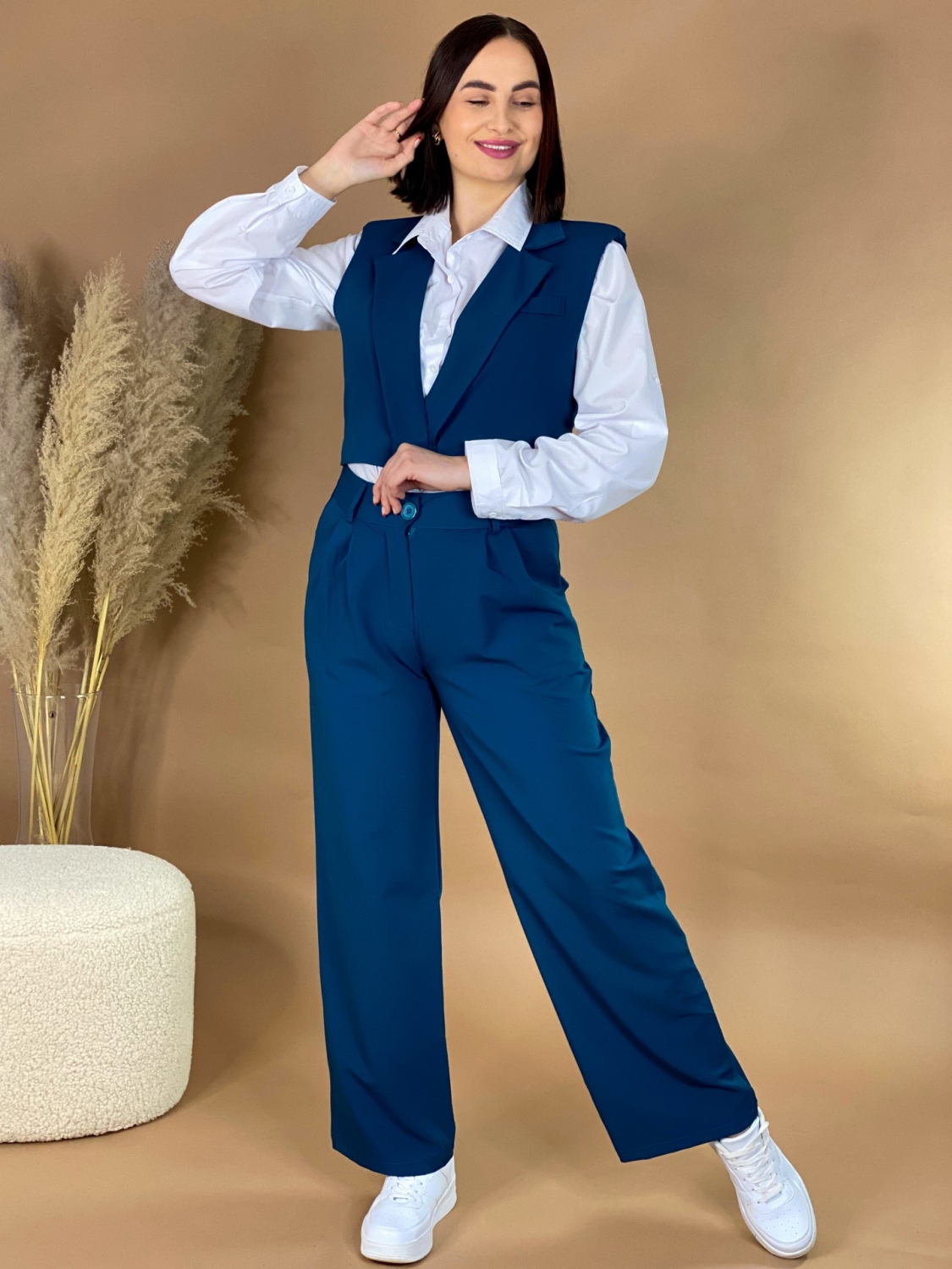 Dámsky trendy KOMPLET nohavice + vesta. Absolútny HIT sezóny, ktorý si zamiluje každá správna nákupna maniačka. Nohavice sú s gumičkou v páse a spodná časť nohavíc je v rozšírenom strihu. Vesta je v skvelom krátkom modernom prevedení a zapína sa vpredu na gombík. Skvelo sa prispôsobí postave. Môžete si ho obliecť vo svojom voľnom čase, ale aj na slávnostejšiu príležitosť. Perfektný strih sadne na väčšinu postáv. Objavte módu, vďaka ktorej máte voľnosť byť sami sebou. Skvelý TRENDY kúsok pre každú trendy žienku, ktorá miluje zaujímavé a neobyčajné kúsky. Modelka je vysoká 175 cm a oblečenú má veľkosť UNI. Komplet môžete doplniť bielou košeľou a teniskami, ale aj lodičkami.