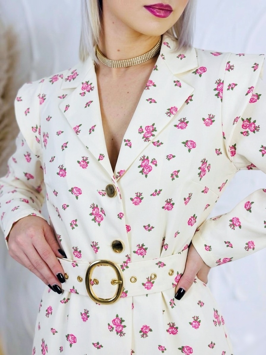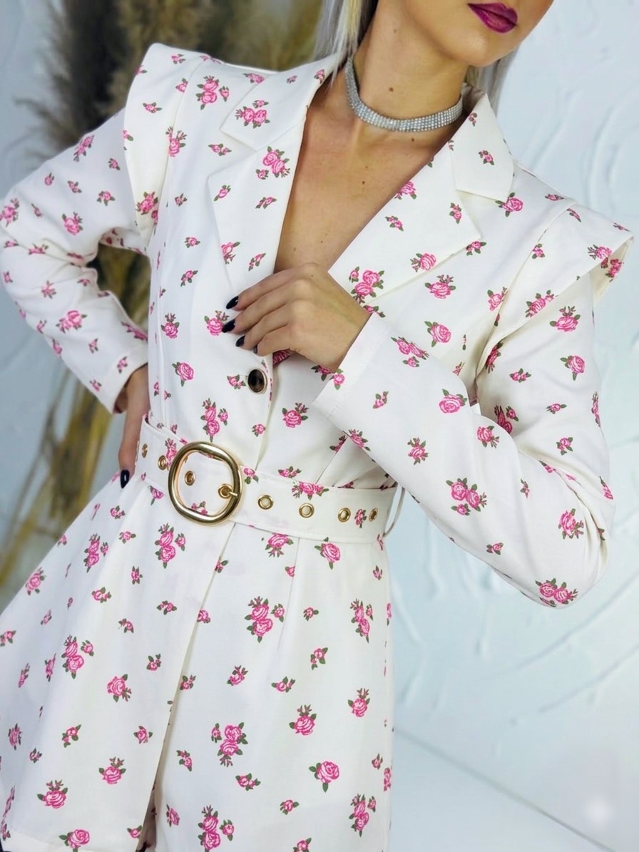Dámsky kvetovaný overal je krásnym a štýlovým kúskom pre ženy, ktoré chcú pôsobiť žensky, elegantne a zároveň sviežo. Jemný kvetovaný vzor dodáva modelu romantický a moderný vzhľad, vďaka čomu je ideálny na rôzne príležitosti – od letných osláv, rodinných stretnutí až po romantické večere či bežné nosenie počas teplejších dní. Overal zaujme sofistikovaným véčkovým výstrihom, ktorý krásne zvýrazní dekolt a opticky predĺži postavu. Predná časť je riešená praktickým zapínaním na gombíky, ktoré uľahčujú obliekanie a zároveň vytvárajú jemný dizajnový detail. V páse sa nachádza opasok so štýlovou zlatou sponou, ktorý krásne zvýrazní pás a dodá celému outfitu elegantný nádych. Strih je navrhnutý tak, aby lichotil ženskej siluete a zároveň poskytoval maximálne pohodlie pri nosení. Materiál je príjemný na dotyk, ľahký a vzdušný, takže sa v ňom budete cítiť komfortne počas celého dňa.