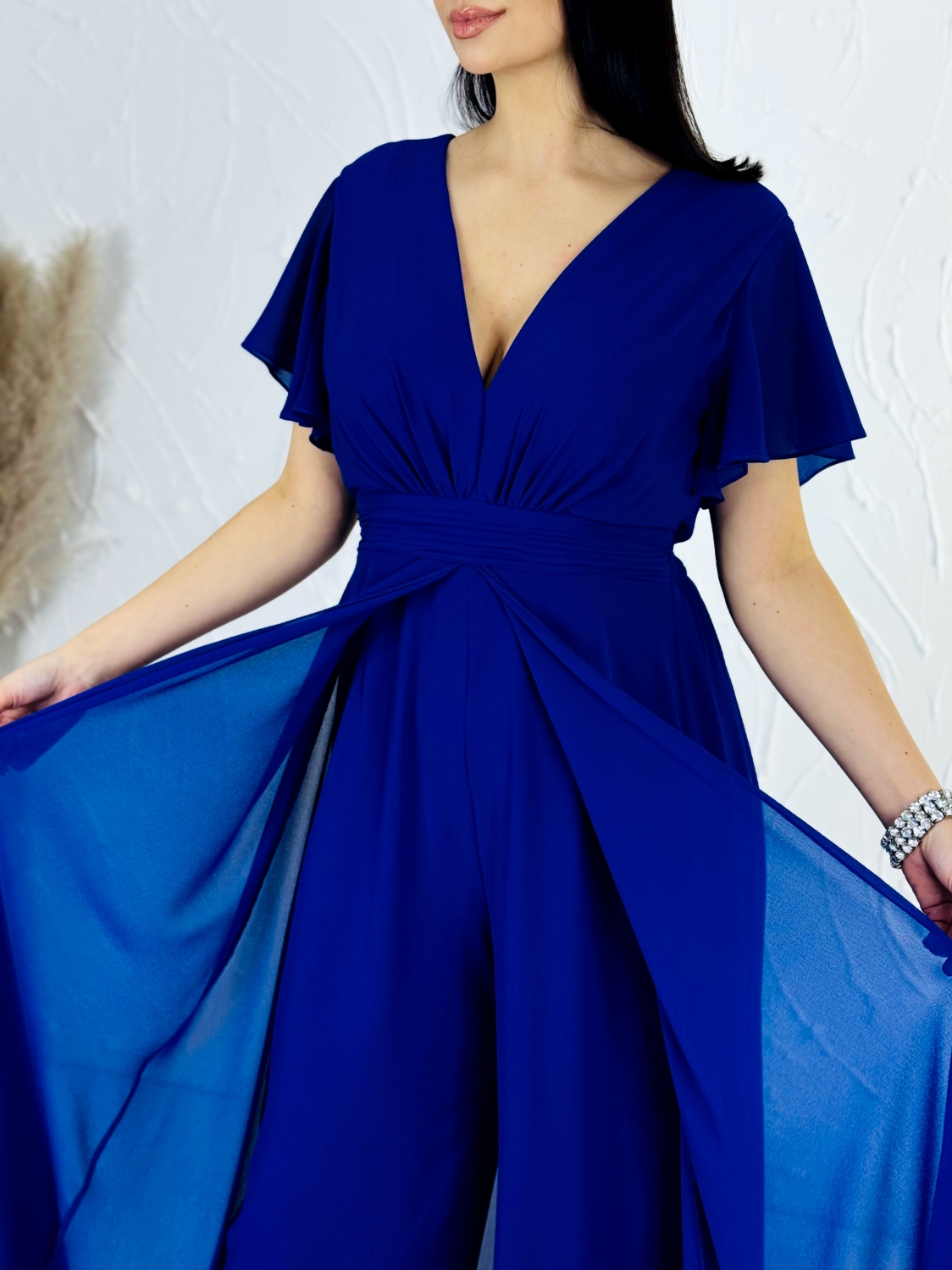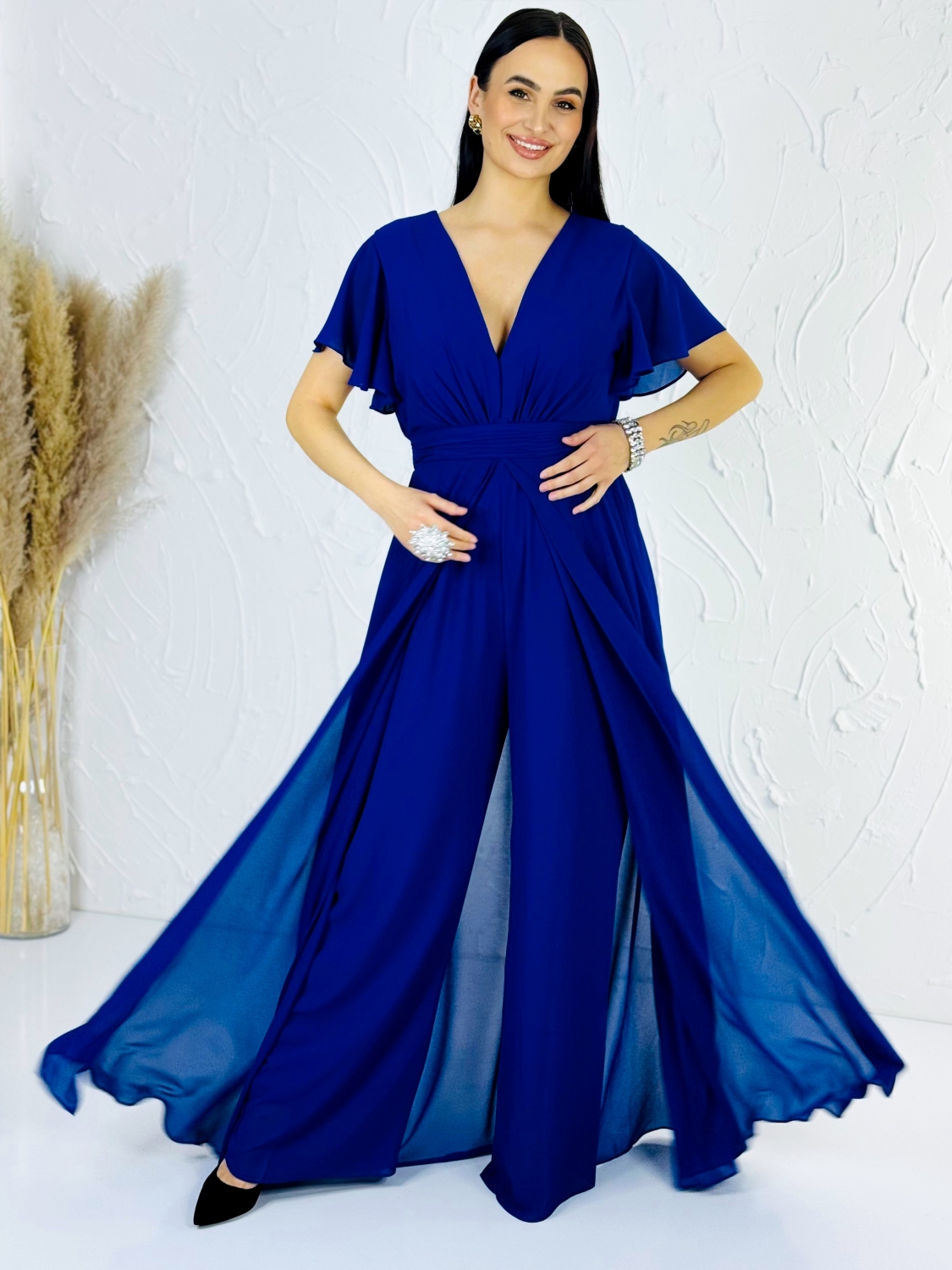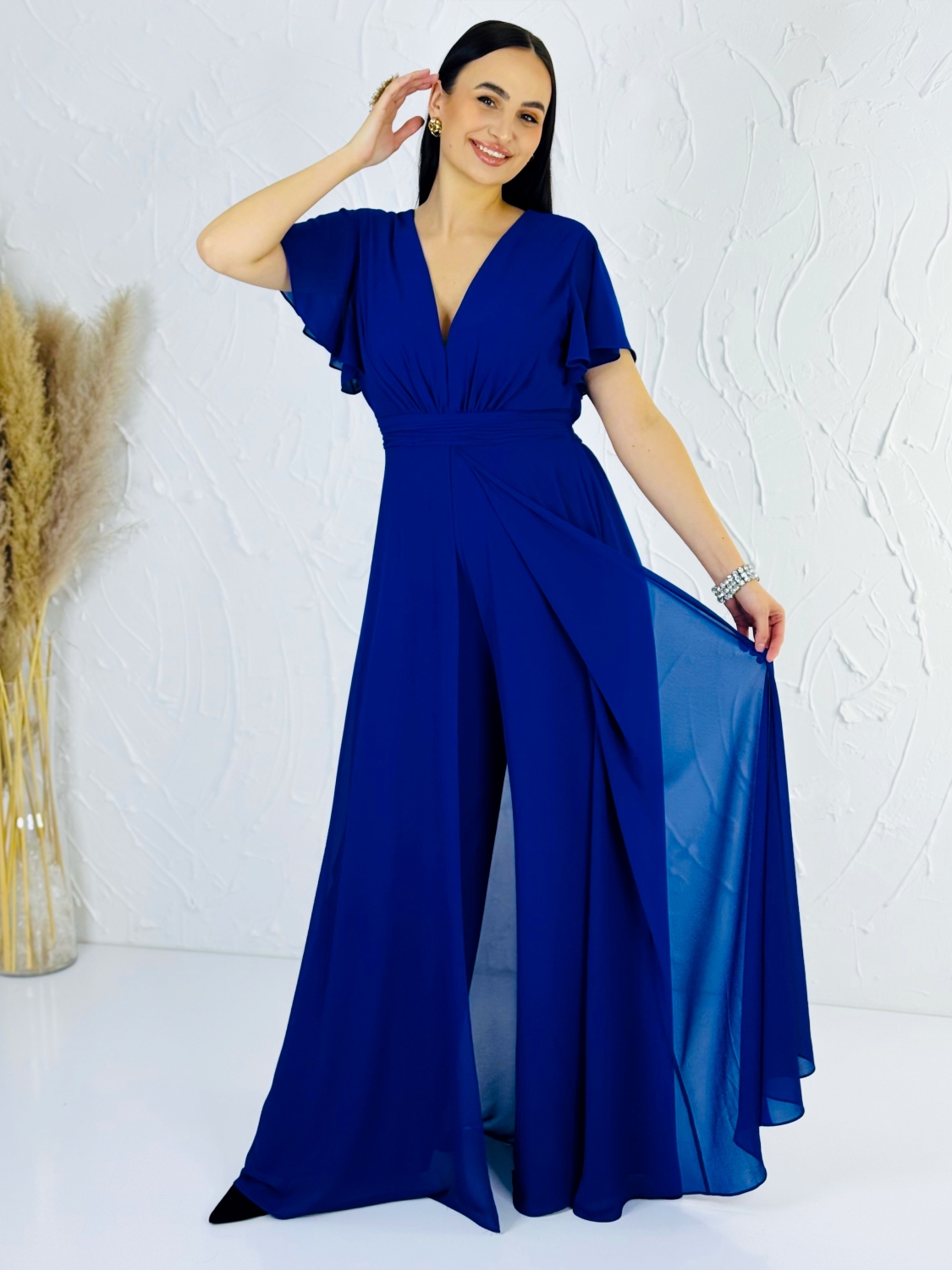 Tento modrý spoločenský overal je dokonalou kombináciou elegancie, pohodlia a moderného ženského štýlu. Pôsobí veľmi pôvabne a je skvelou alternatívou pre ženy, ktoré chcú vyniknúť originálnym, no zároveň nadčasovým outfitom. Overal má hlboký V-výstrih, ktorý krásne zvýrazňuje dekolt a opticky predlžuje postavu. Jemne riasený živôtik plynulo prechádza do zvýrazneného pásu, ktorý vytvára krásnu siluetu a dodáva postave štíhly, ženský tvar. Krátke, voľne splývavé rukávy dodávajú modelu ľahkosť a vzdušnosť a zároveň decentne zakrývajú ramená, čo oceníte pri formálnych udalostiach. Dominantou overalu sú široké, elegantne splývavé nohavice, ktoré pri chôdzi pôsobia mimoriadne efektne a pripomínajú dlhú sukňu. Vďaka tomuto strihu overal krásne pracuje s pohybom a dodáva nositeľke noblesný a sebavedomý vzhľad. Tmavomodrá farba pôsobí luxusne, nadčasovo a je ideálna na večerné aj slávnostné príležitosti. Materiál je ľahký, jemný a príjemný na dotyk, krásne splýva a zabezpečuje komfort počas celého nosenia. Overal je navrhnutý tak, aby sa pohodlne nosil aj počas dlhých spoločenských akcií, tanca či osláv.