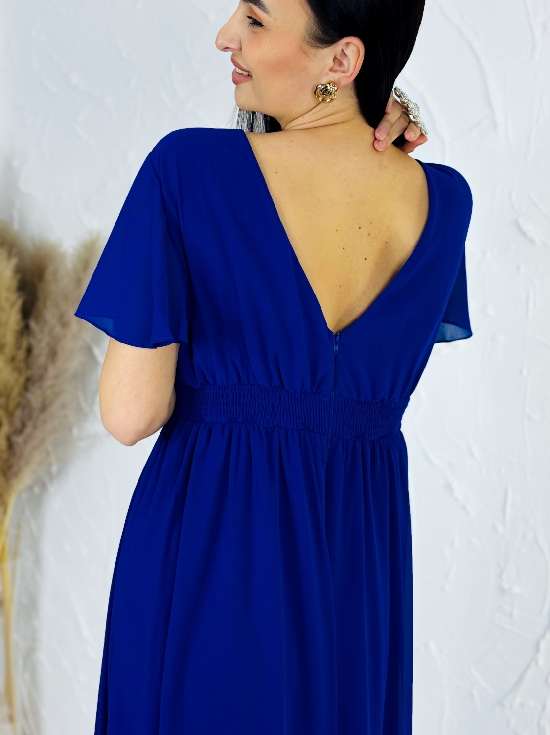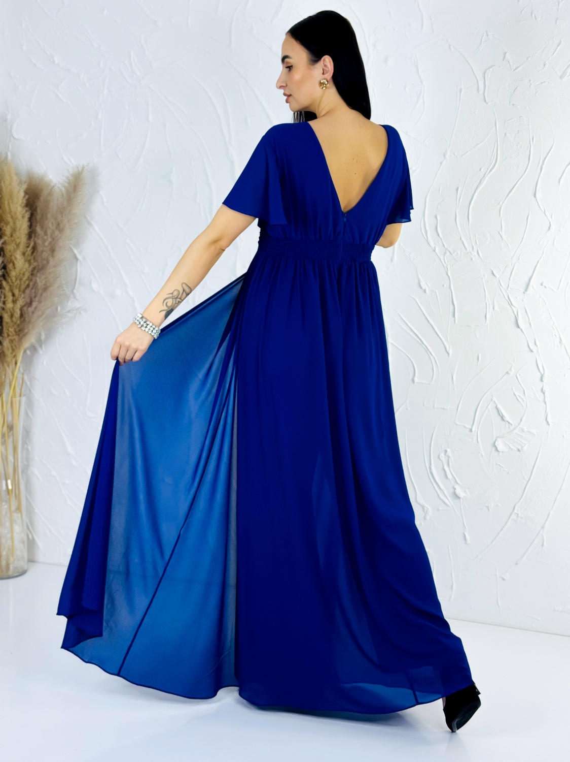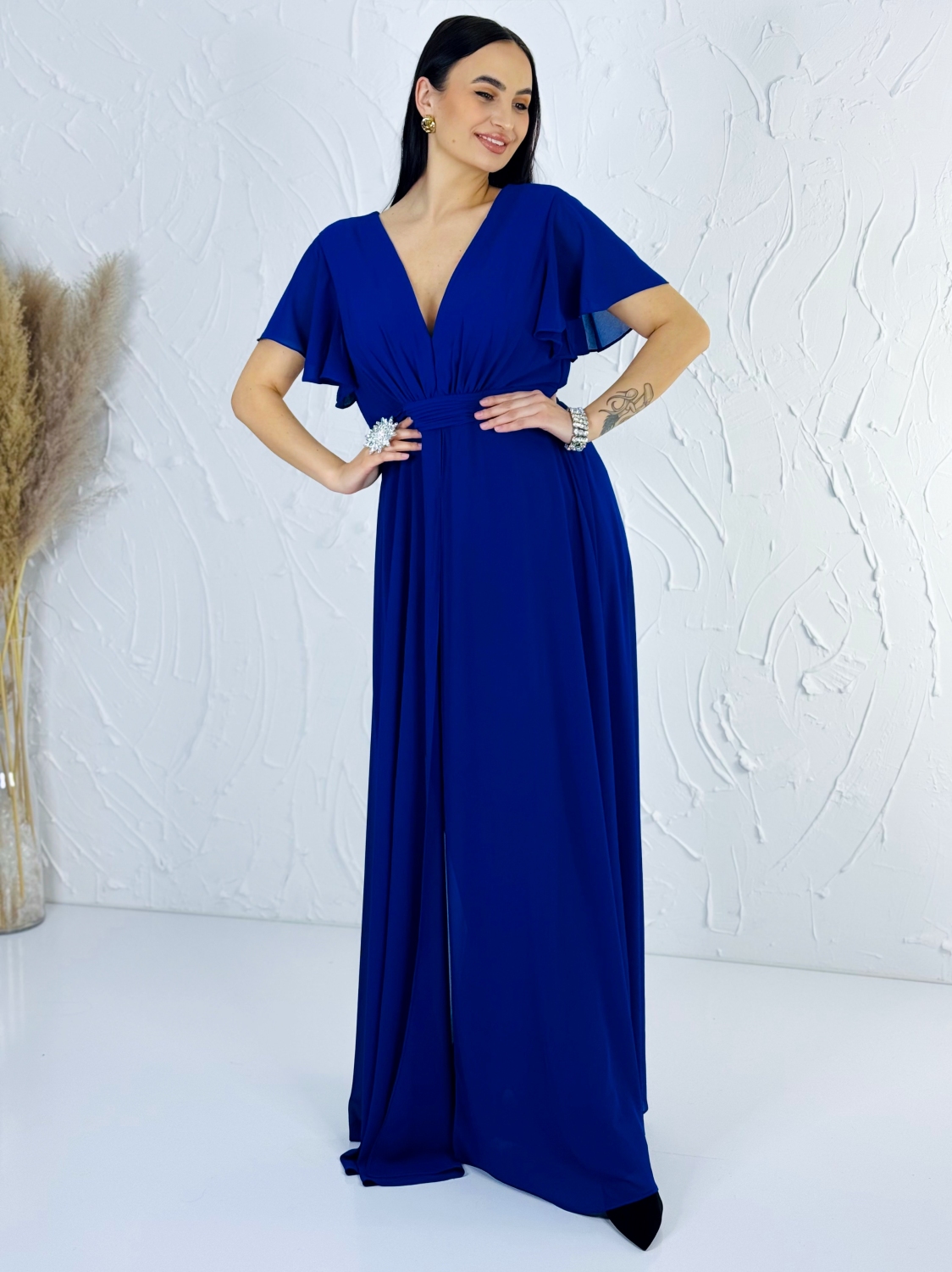 Tento modrý spoločenský overal je dokonalou kombináciou elegancie, pohodlia a moderného ženského štýlu. Pôsobí veľmi pôvabne a je skvelou alternatívou pre ženy, ktoré chcú vyniknúť originálnym, no zároveň nadčasovým outfitom. Overal má hlboký V-výstrih, ktorý krásne zvýrazňuje dekolt a opticky predlžuje postavu. Jemne riasený živôtik plynulo prechádza do zvýrazneného pásu, ktorý vytvára krásnu siluetu a dodáva postave štíhly, ženský tvar. Krátke, voľne splývavé rukávy dodávajú modelu ľahkosť a vzdušnosť a zároveň decentne zakrývajú ramená, čo oceníte pri formálnych udalostiach. Dominantou overalu sú široké, elegantne splývavé nohavice, ktoré pri chôdzi pôsobia mimoriadne efektne a pripomínajú dlhú sukňu. Vďaka tomuto strihu overal krásne pracuje s pohybom a dodáva nositeľke noblesný a sebavedomý vzhľad. Tmavomodrá farba pôsobí luxusne, nadčasovo a je ideálna na večerné aj slávnostné príležitosti. Materiál je ľahký, jemný a príjemný na dotyk, krásne splýva a zabezpečuje komfort počas celého nosenia. Overal je navrhnutý tak, aby sa pohodlne nosil aj počas dlhých spoločenských akcií, tanca či osláv.