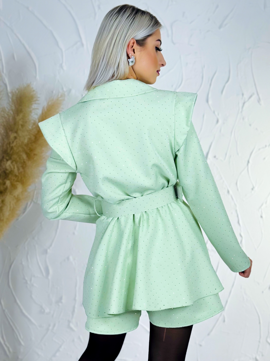 Dámsky elegantný overal s ozdobnými kamienkami je dokonalým kúskom pre ženy, ktoré chcú pôsobiť štýlovo, žensky a zároveň výnimočne. Tento model zaujme už na prvý pohľad svojím sofistikovaným véčkovým výstrihom, ktorý krásne zvýrazní dekolt a opticky predĺži postavu. Výstrih pôsobí veľmi vkusne a elegantne, vďaka čomu je overal vhodný na spoločenské udalosti, oslavy, večierky, rodinné stretnutia či romantické večere. Predná časť je prakticky riešená zapínaním na gombíky, ktoré nielen uľahčujú obliekanie, ale zároveň tvoria jemný dizajnový prvok. Overal je ozdobený decentnými kamienkami, ktoré dodávajú modelu luxusný nádych a jemný lesk. Kamienky krásne odrážajú svetlo a vytvárajú elegantný efekt bez toho, aby pôsobili prehnane. V páse sa nachádza pružná gumička, ktorá sa dokonale prispôsobí postave, zvýrazní ženské krivky a zabezpečí maximálne pohodlie počas nosenia. Vďaka nej overal pekne sedí na rôznych typoch postavy a zároveň poskytuje voľnosť pohybu. Strih je navrhnutý tak, aby lichotil siluete a vytváral upravený, no zároveň pohodlný vzhľad. Materiál je príjemný na dotyk, ľahký a vzdušný.