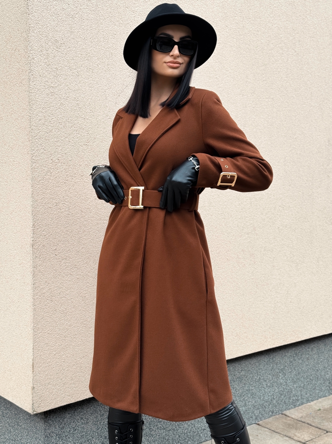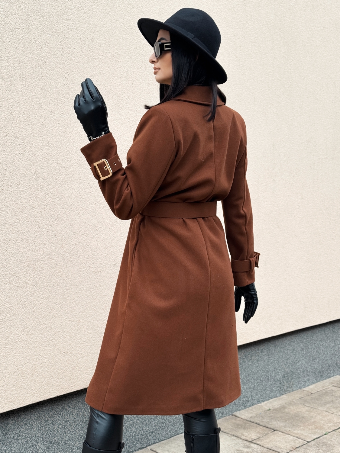Dámsky elegantný tmavo hnedý kabát s opaskom a prackami Droin