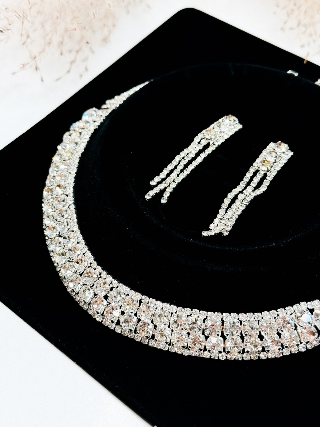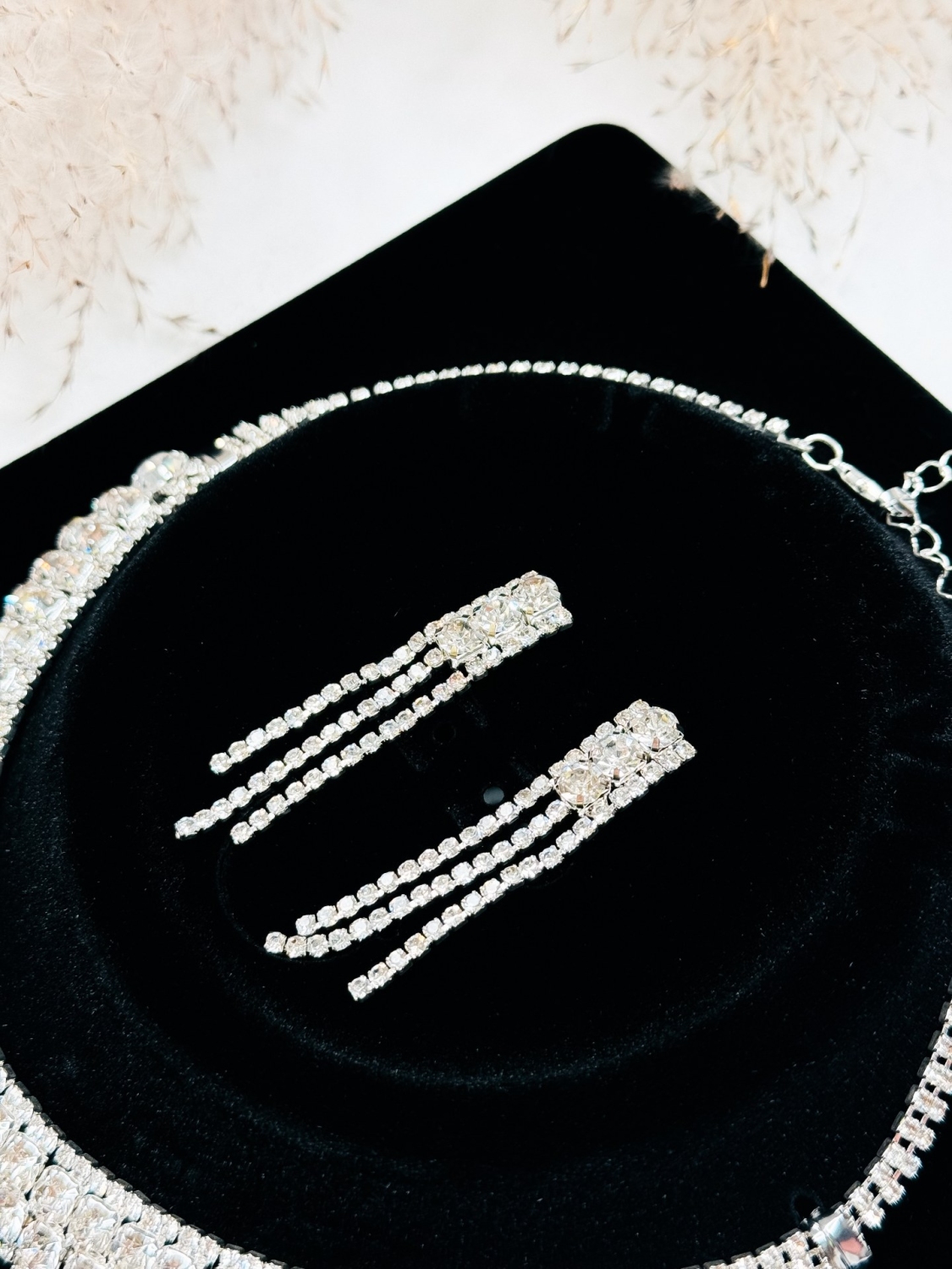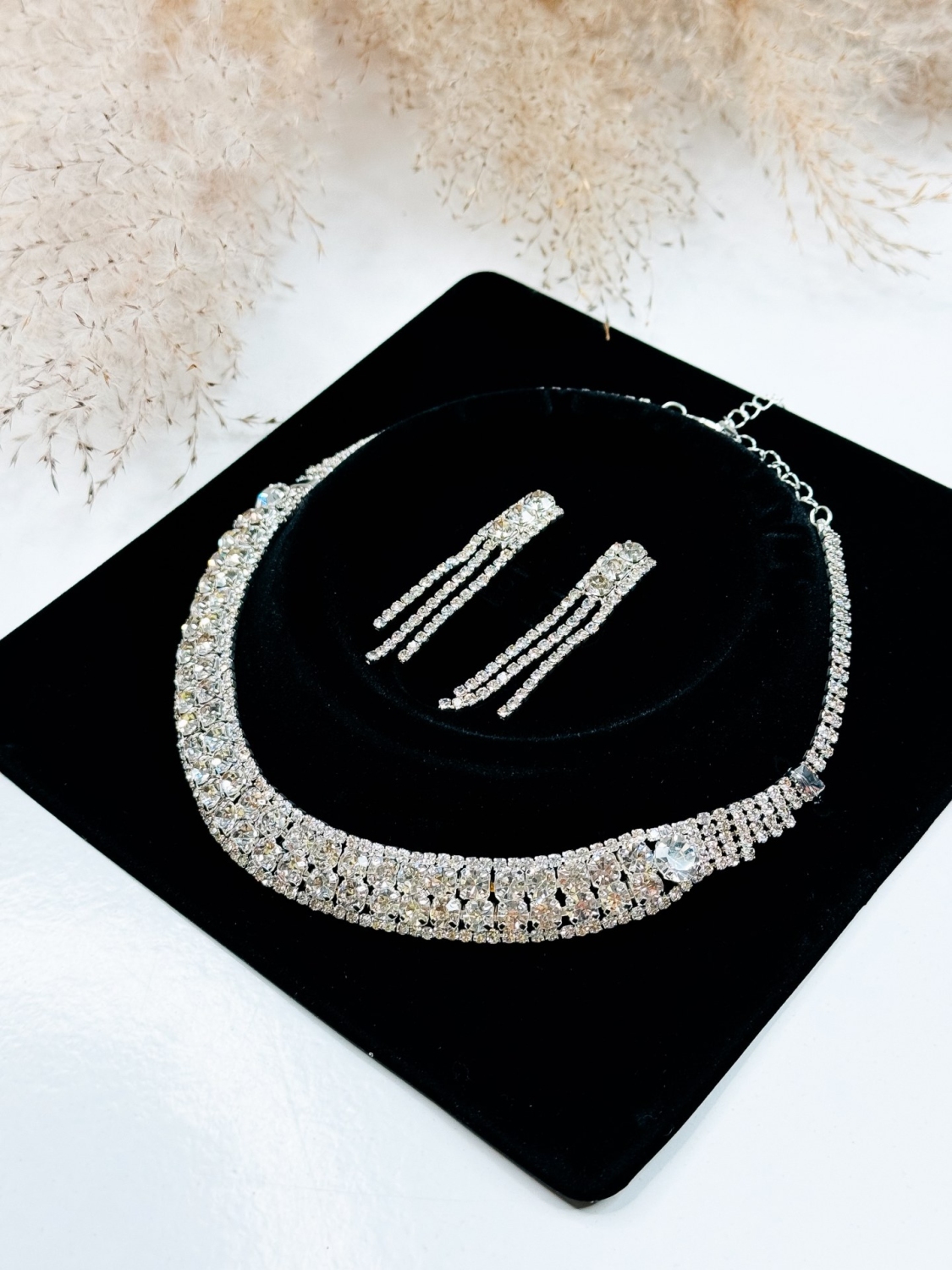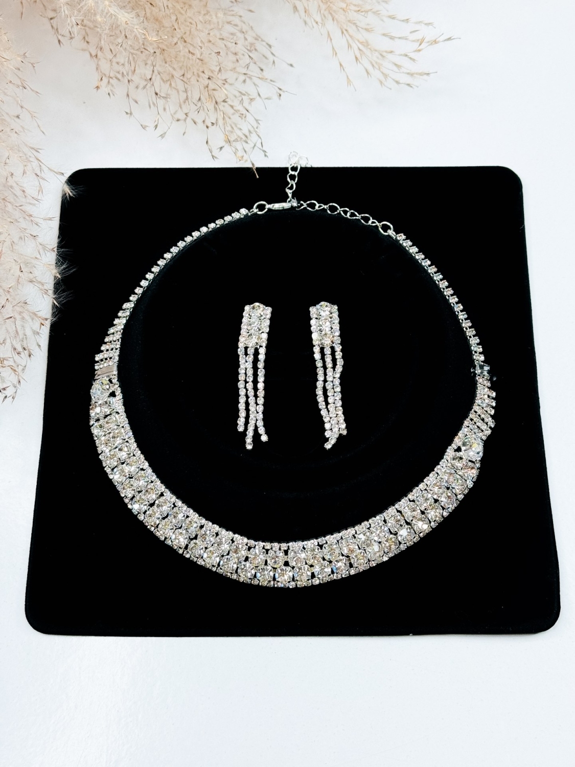 Dámsky exkluzívny strieborný set, ktorý pozostáva zo zaujímavého náhrdelníka a náušníc. Náhrdelník sa dá presne nastaviť, takže sadne každej žienke. Tento set krásne oživí každý spoločenský outfit. Vhodný na svadbu, stužkovú, 1. sväté prijímanie, či inú spoločenskú udalosť. Stačí si len vybrať z našej jedinečnej ponuky ten pravý.