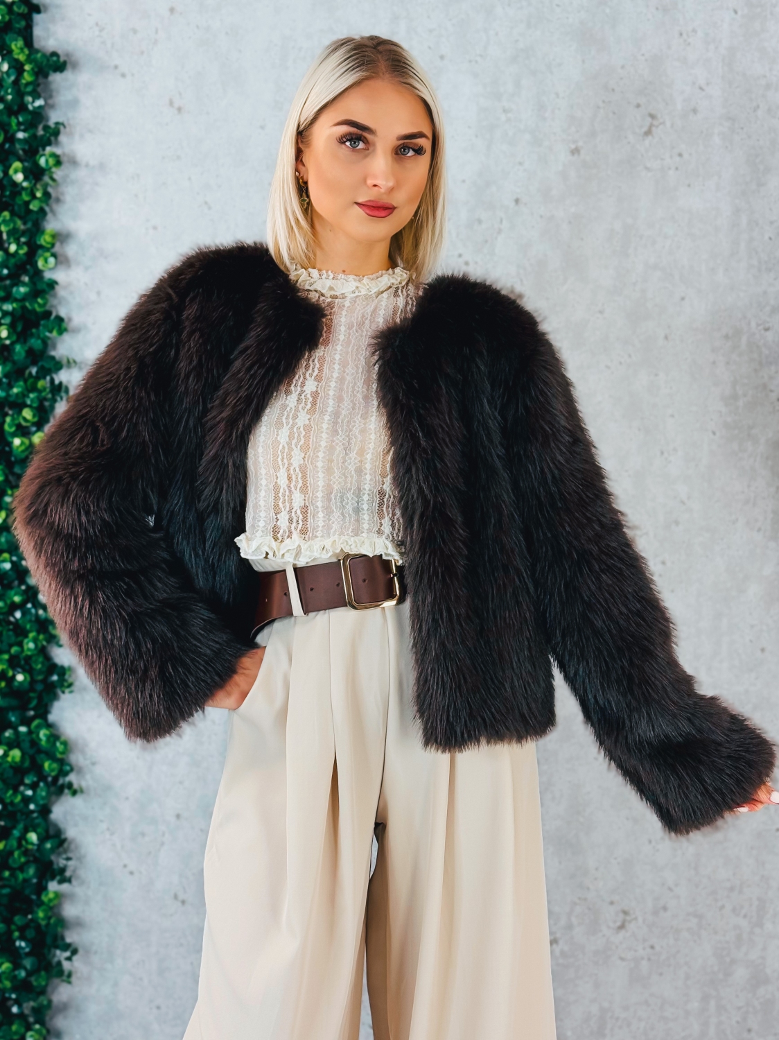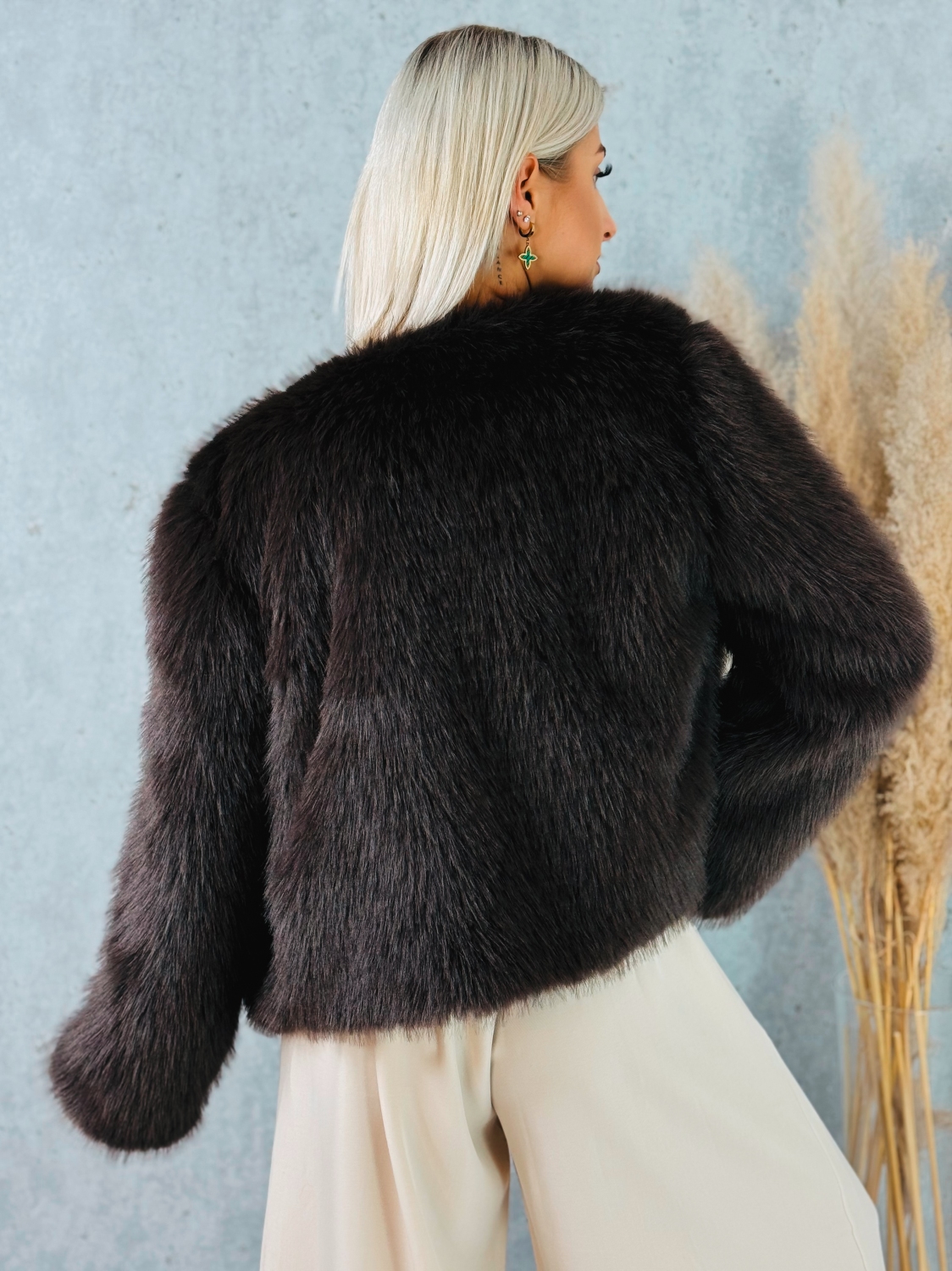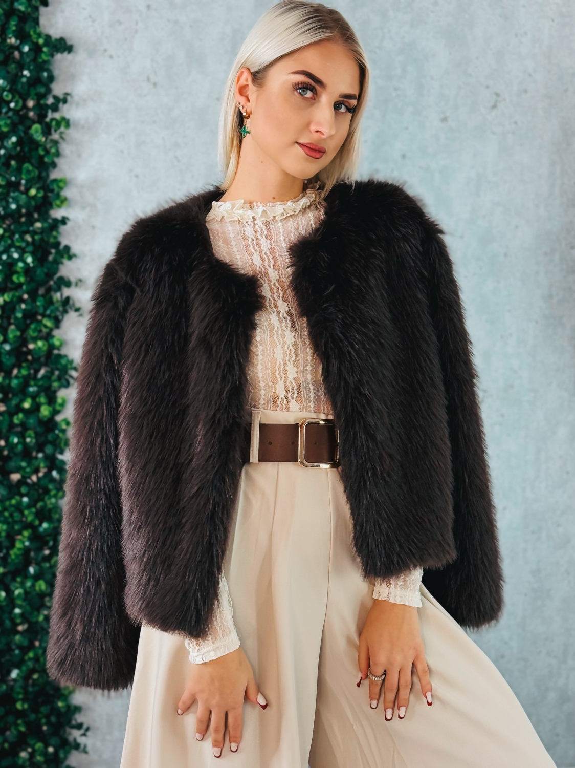 Dámske hnedé kožušinové bolerko je výrazným módnym kúskom, ktorý okamžite dodá outfitu pocit tepla, pohodlia a luxusu. Je vyhotovené z bohatej, huňatej kožušiny s jemným vlasom, ktorá je príjemná na dotyk a krásne drží tvar. Vďaka svojmu krátkému strihu pôsobí bolerko ľahko a elegantne, pričom zvýrazňuje hornú časť postavy bez toho, aby zakrývalo siluetu. Prírodný hnedý odtieň pôsobí teplo a nadčasovo, ľahko sa kombinuje so svetlými aj tmavými farbami a perfektne dopĺňa spoločenské aj každodenne elegantné outfity. Bolerko je ideálne na nosenie počas chladnejších dní a večerov, keď chcete zostať v teple, no zároveň si zachovať ženský a upravený vzhľad. Huňatá štruktúra dodáva modelu objem a luxusný efekt, vďaka čomu sa stáva neprehliadnuteľným doplnkom k šatám, sukniam či elegantným nohaviciam. Je vhodné na spoločenské udalosti, oslavy, večere, svadby, plesy, ale aj ako štýlový vrchný doplnok na prechodné obdobie. Toto kožušinové bolerko je určené pre ženy, ktoré majú rady kvalitné spracovanie, nadčasový dizajn a chcú svojmu outfitu dodať výrazný, no stále vkusný módny akcent.