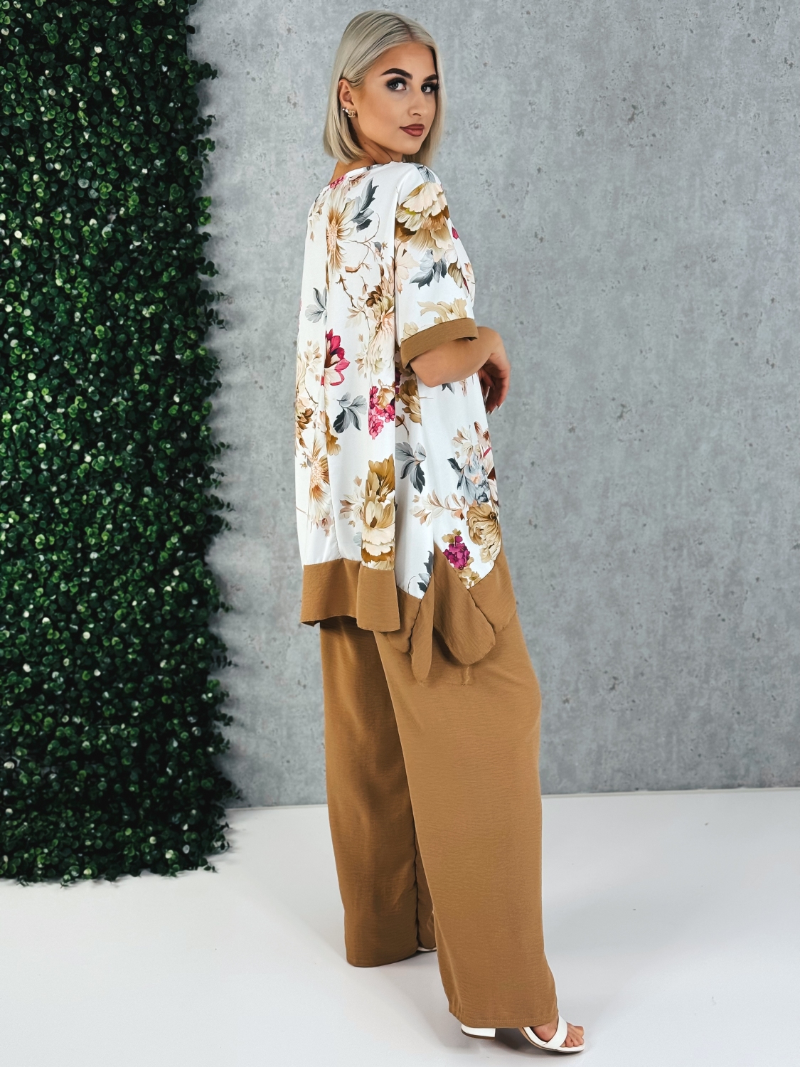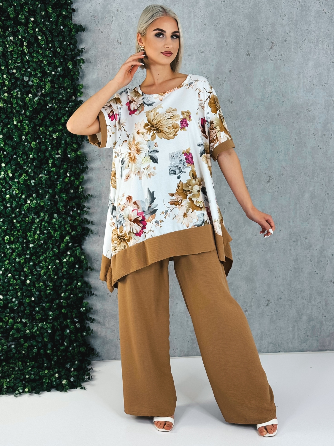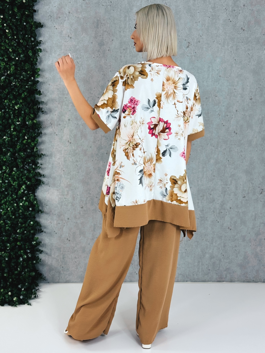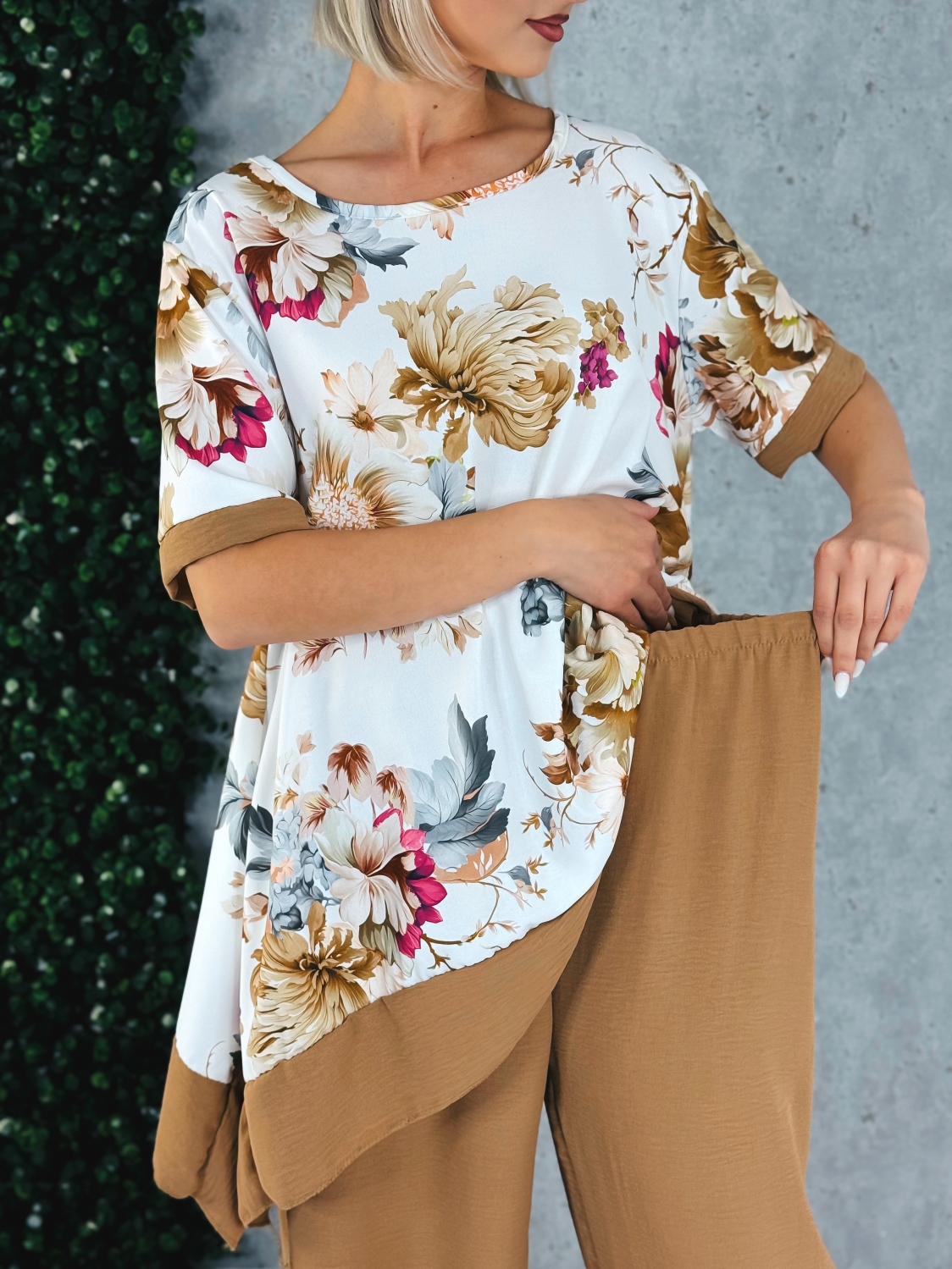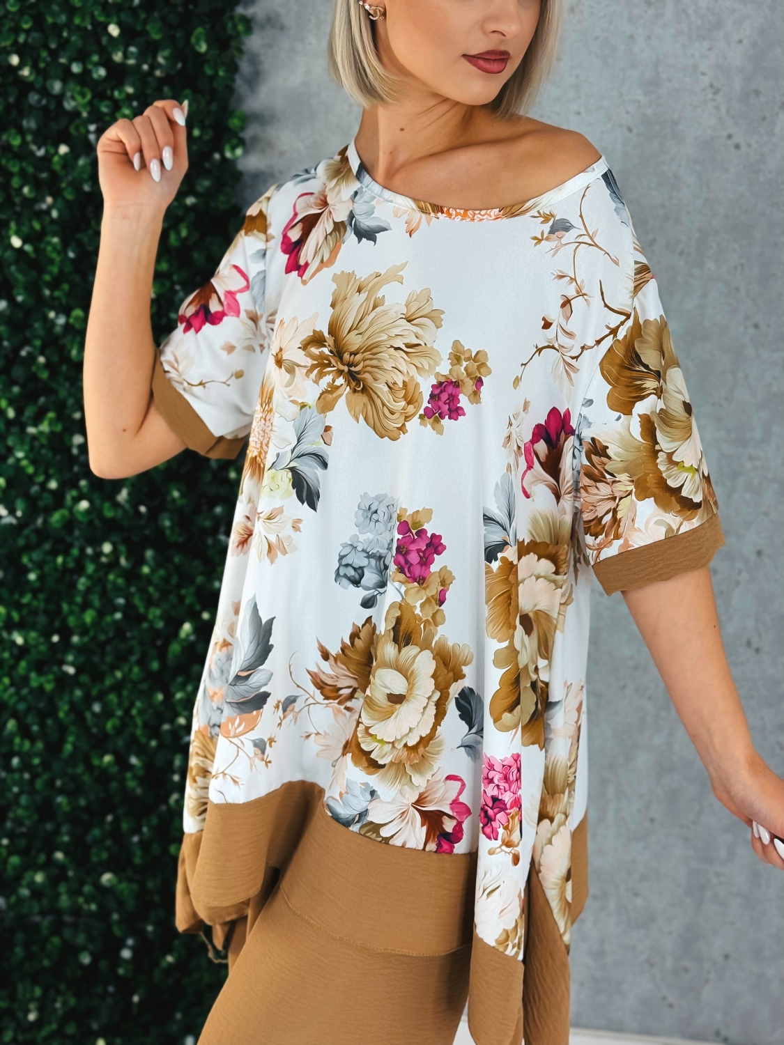 Tento dámsky komplet v modernom oversize strihu je ideálnou voľbou pre ženy, ktoré milujú pohodlie bez kompromisov v štýle. Voľne padnúce široké nohavice s elastickou gumičkou v páse sa dokonale prispôsobia postave, neobmedzujú pohyb a zároveň vytvárajú elegantnú, uvoľnenú siluetu. Vďaka vzdušnému materiálu sú ideálne na každodenné nosenie, ale aj na teplejšie dni, keď oceníš ich ľahkosť a priedušnosť. Vrchný diel tvorí štýlová blúzka s krátkym rukávom, ktorá zaujme jemným kvetinovým vzorom. Ten dodáva celému outfitu ženskosť, sviežosť a romantický nádych. Oversize strih blúzky perfektne ladí s nohavicami a vytvára harmonický, trendy komplet, ktorý pôsobí nenútene, no zároveň veľmi vkusne. Komplet je skvelou voľbou na rôzne príležitosti – či už ideš na prechádzku mestom, stretnutie s kamarátkami alebo si chceš dopriať pohodlný, no štýlový outfit do práce. Jednoducho ho skombinuješ s teniskami pre ležérny look alebo sandálmi pre elegantnejší dojem. Tento outfit je dôkazom toho, že aj pohodlné kúsky môžu byť krásne, ženské a moderné zároveň.
