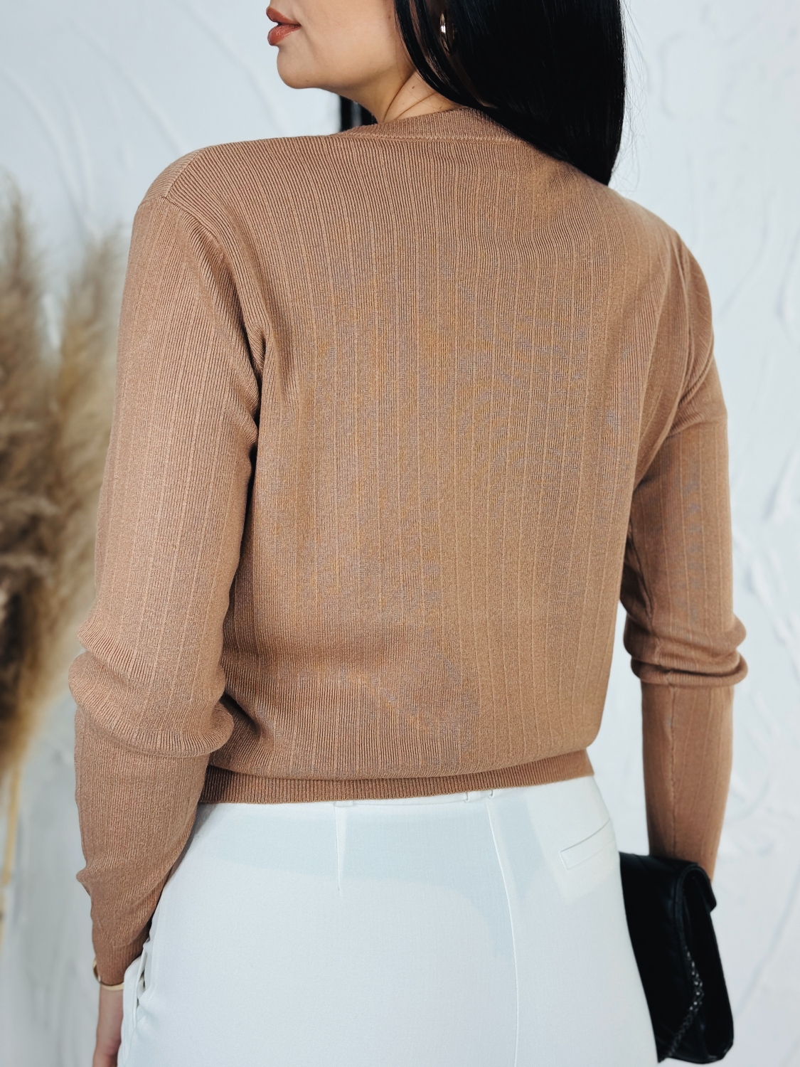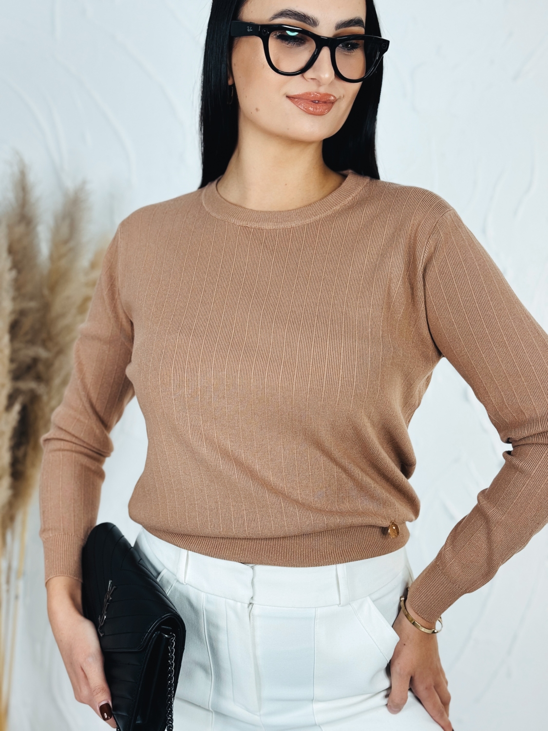 Tento dámsky vrúbkovaný sveter predstavuje dokonalú rovnováhu medzi eleganciou, pohodlím a nadčasovým štýlom. Vďaka precíznemu spracovaniu a jemnej štruktúre pôsobí veľmi žensky a upravene, pričom sa stane neoddeliteľnou súčasťou vášho šatníka pre každú príležitosť. Materiál je mäkký, pružný a príjemný na dotyk, takže sa pohodlne nosí počas celého dňa. Vrúbkovaná textúra opticky predlžuje siluetu a zvýrazňuje ženské krivky, zatiaľ čo klasický strih s okrúhlym výstrihom dodáva celému kúsku čistý a moderný vzhľad. Sveter sa výborne kombinuje s elegantnými nohavicami, sukňou či džínsami – podľa toho, či chcete vytvoriť formálny alebo ležérny outfit. Je ideálny do práce, na stretnutia, aj na bežné dni, keď chcete vyzerať štýlovo bez zbytočného úsilia. Tento model je dôkazom, že aj jednoduché línie môžu pôsobiť sofistikovane a zároveň podčiarknuť prirodzenú krásu a eleganciu každej ženy.