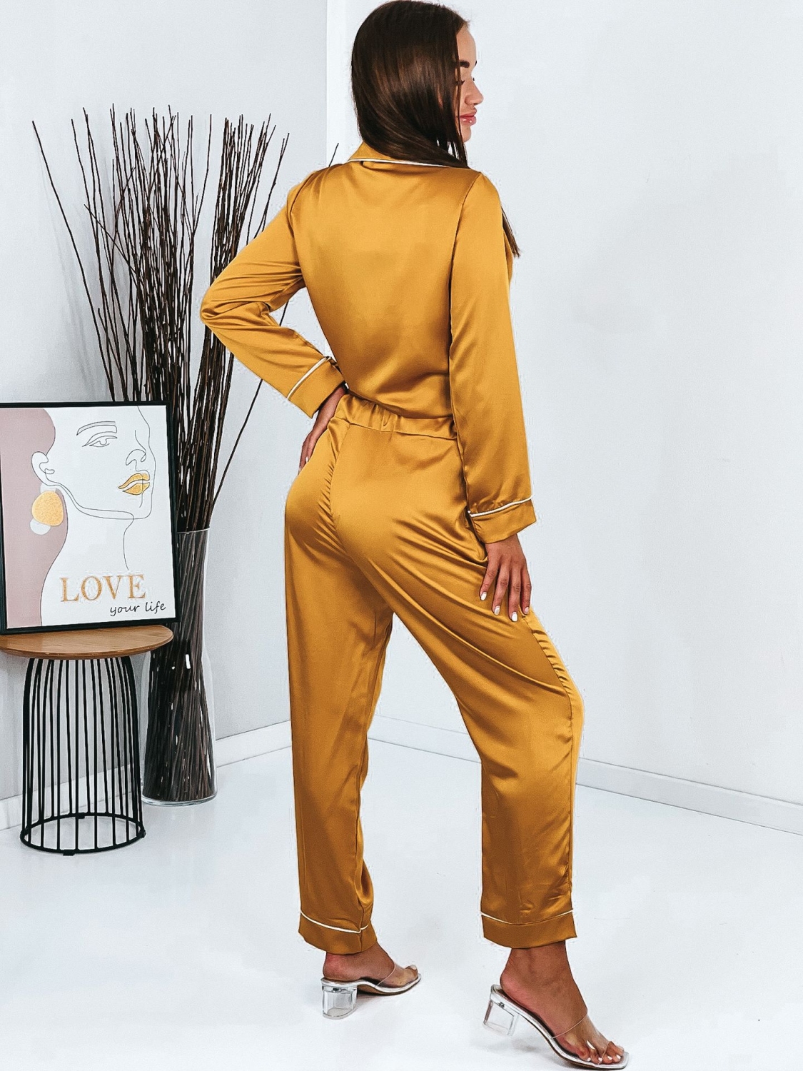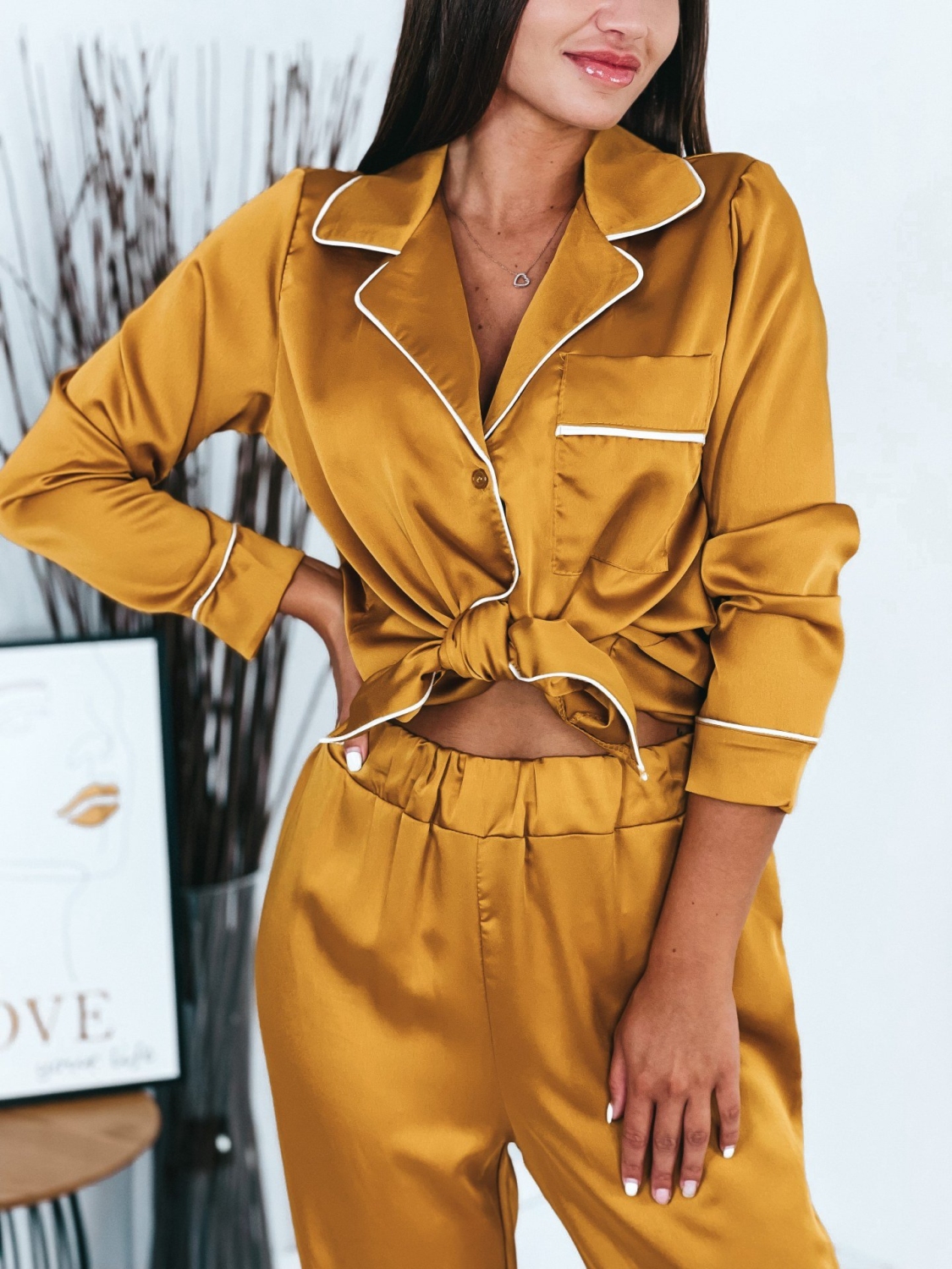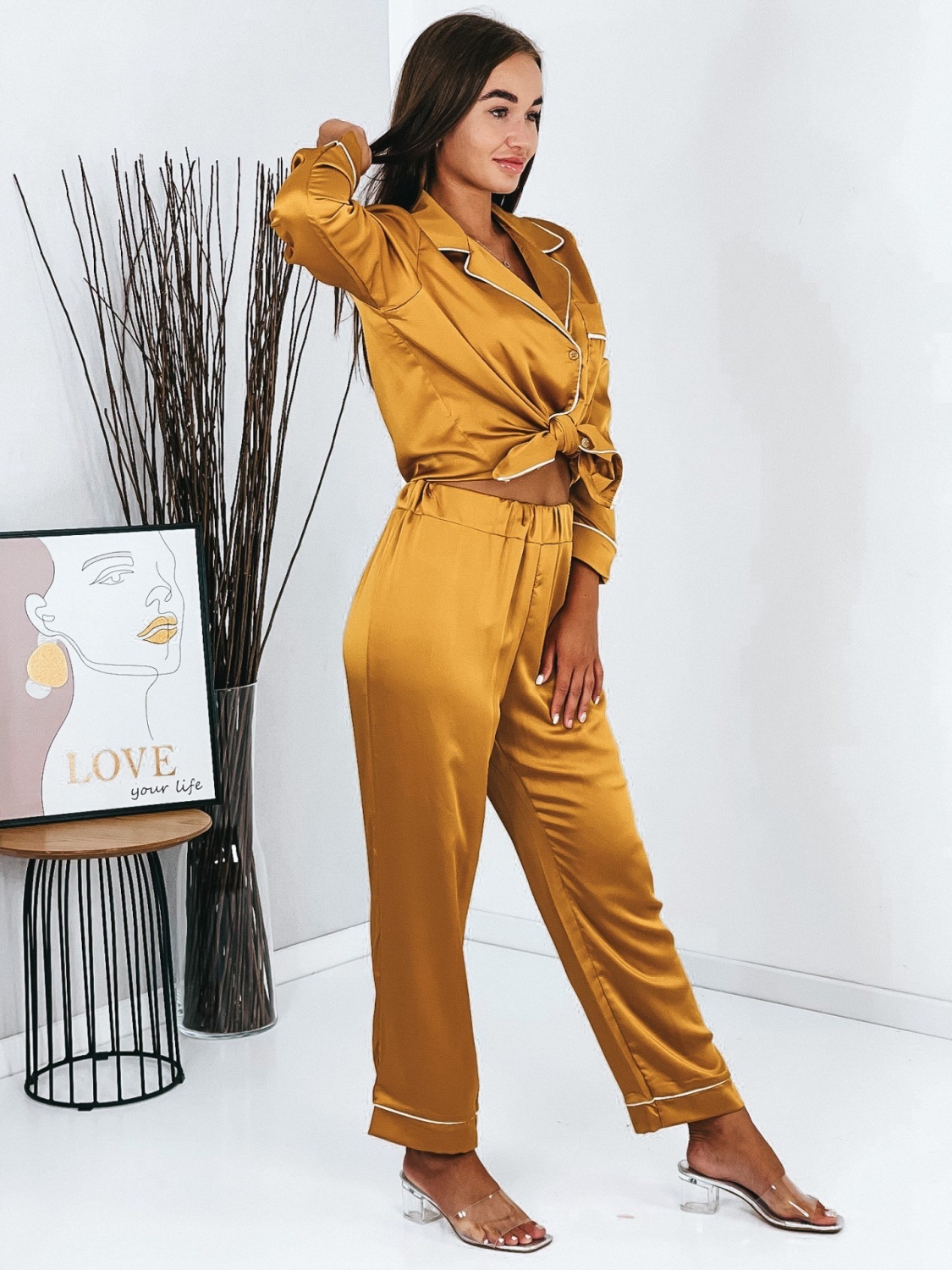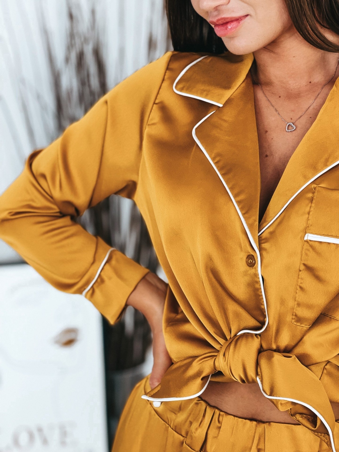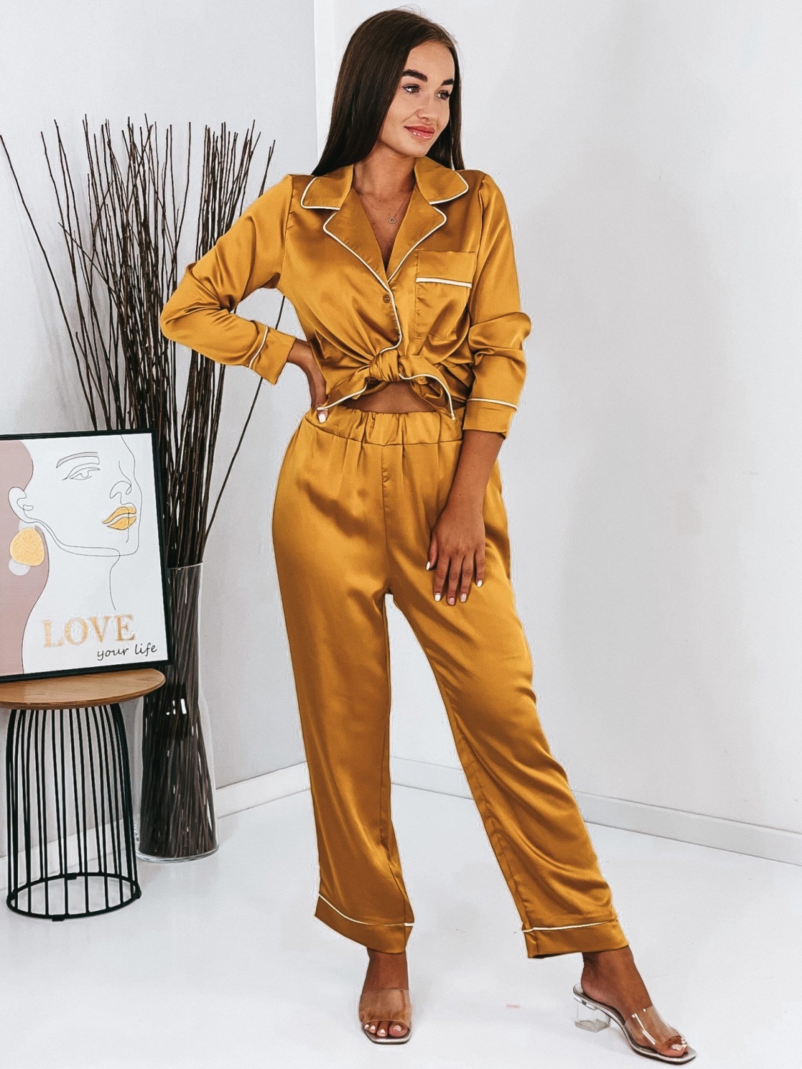 Dámske saténové hnedé pyžamo, ktoré pozostáva z nohavíc a košele si obľúbite okamžite. Viete prečo? Dámske pyžamo nemúsi byť len pyžamo ;) Môžete si ho kľudne obliecť aj do mesta, či na kávu. Najnovší módny trend je teda TU! Pyžamová párty? Alebo len párty? S týmto outfitom budete trendy a cool. Vrchnú košeľu odporúčame nosiť i samostatne k rifľovým kraťasom, či sukni. Tak nečakajte a objednajte si ho už teraz. Skladom máme ich pár kusov. 0Modelka má 173 cm a oblečenú má veľkosť UNI.