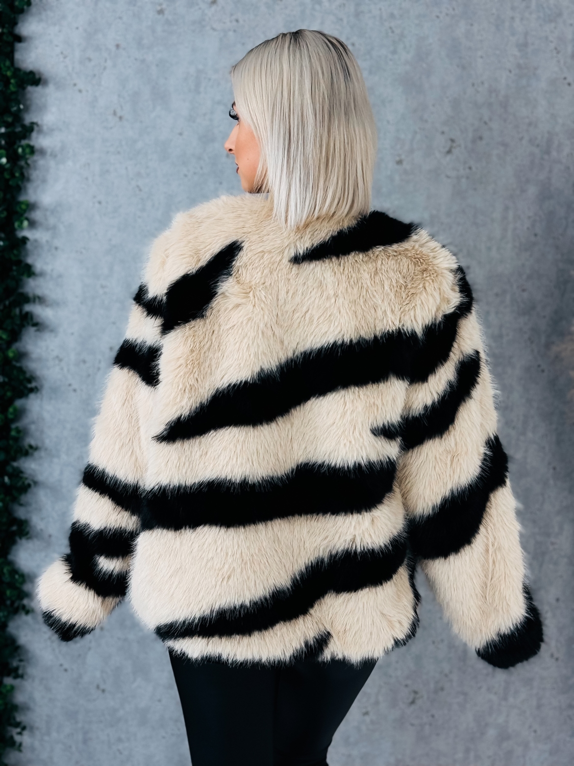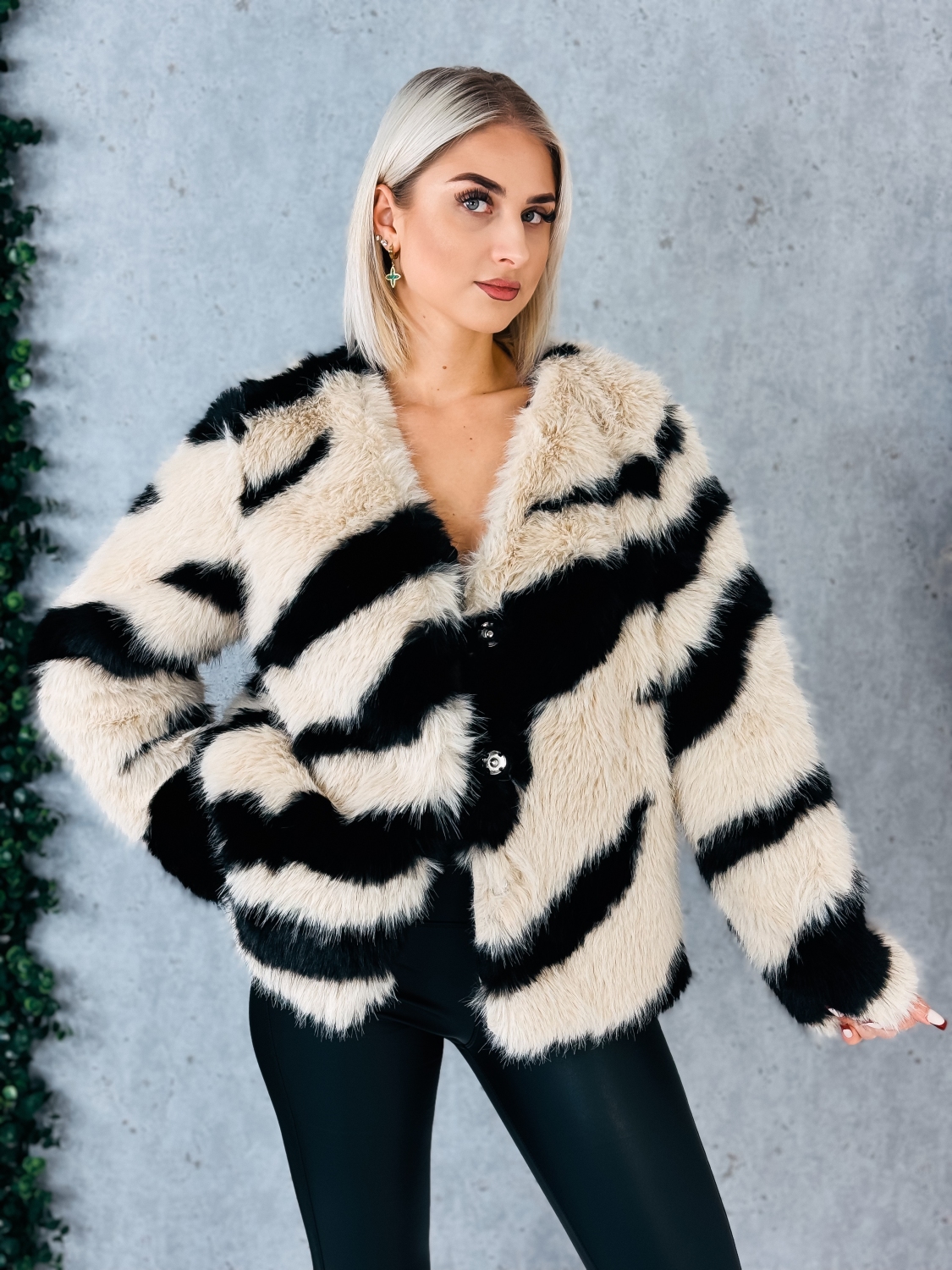 Doprajte si štýl, komfort a eleganciu v jednom – dámsky kožuch so zvieracím vzorom v čierno-béžovej farbe sa stane vaším obľúbeným kúskom na celú sezónu.