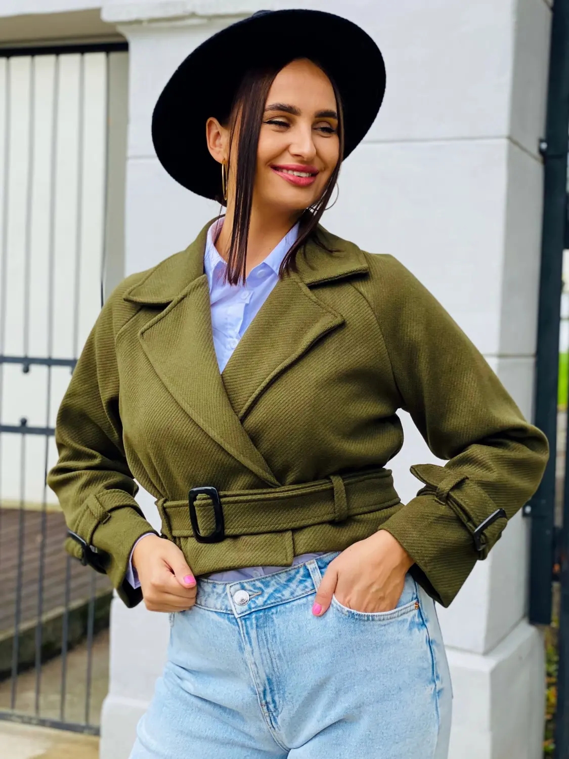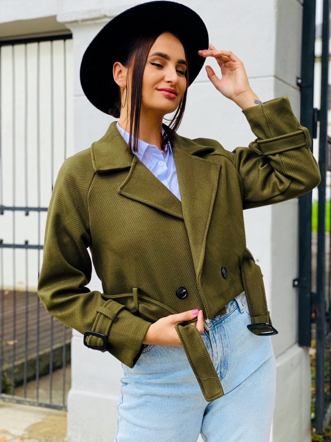 Čo sa môže hodiť viac ako krátky kabát do premenlivého počasia? Dámsky krátky kabátik v top strihu je nestarnúci trend pre každú trendy žienku. Univerzálny kúsok, ktorý sa hodí k akémukoľvek outfitu. Zapínanie vpredu na gombík. Kabát je doplnený opaskom na zapínanie. Oversize strih. Je perfektnou voľbou pri vytváraní každodenných štylizácií. Hodí sa k elegantným aj casual outfitom. Tento nekonečne štýlový kabát je viac než dostatočne vzhľadný a kvalitný. Výnimočne trendy a skutočne pohodlný. Jednoduchá úprava podľa vlatného vkusu. Hodí do chladnejších jarných a jesenných dní, ale aj na zimné obdobie. Modelka je vysoká 175 cm a oblečenú má veľkosť M.
