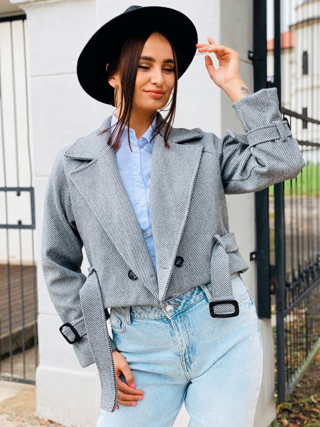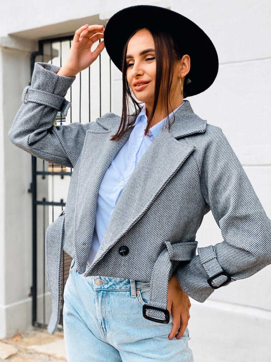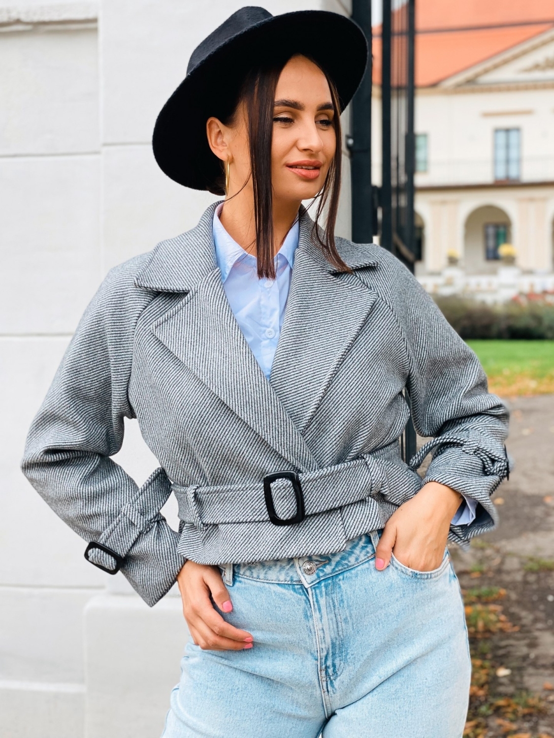 Čo sa môže hodiť viac ako krátky kabát do premenlivého počasia? Dámsky krátky kabátik v top strihu je nestarnúci trend pre každú trendy žienku. Univerzálny kúsok, ktorý sa hodí k akémukoľvek outfitu. Zapínanie vpredu na gombík. Kabát je doplnený opaskom na zapínanie. Oversize strih. Je perfektnou voľbou pri vytváraní každodenných štylizácií. Hodí sa k elegantným aj casual outfitom. Tento nekonečne štýlový kabát je viac než dostatočne vzhľadný a kvalitný. Výnimočne trendy a skutočne pohodlný. Jednoduchá úprava podľa vlatného vkusu. Hodí do chladnejších jarných a jesenných dní, ale aj na zimné obdobie. Modelka je vysoká 175 cm a oblečenú má veľkosť M.