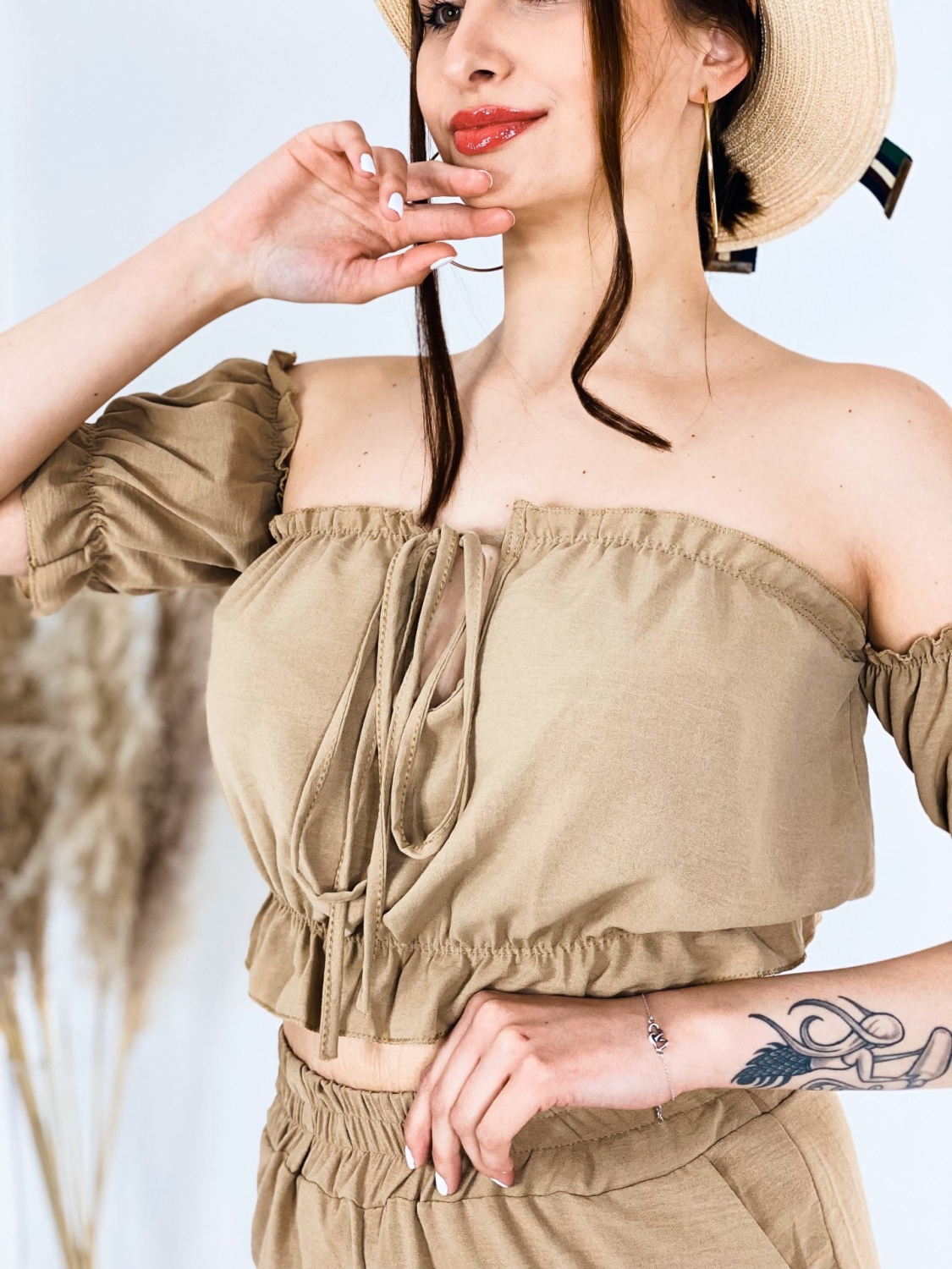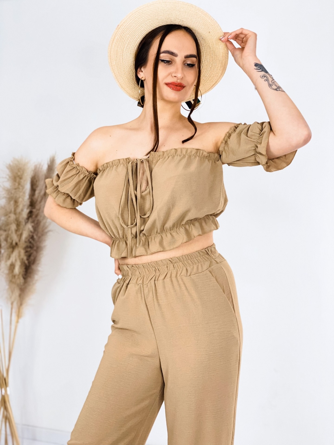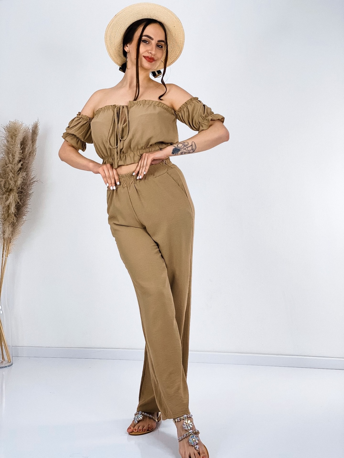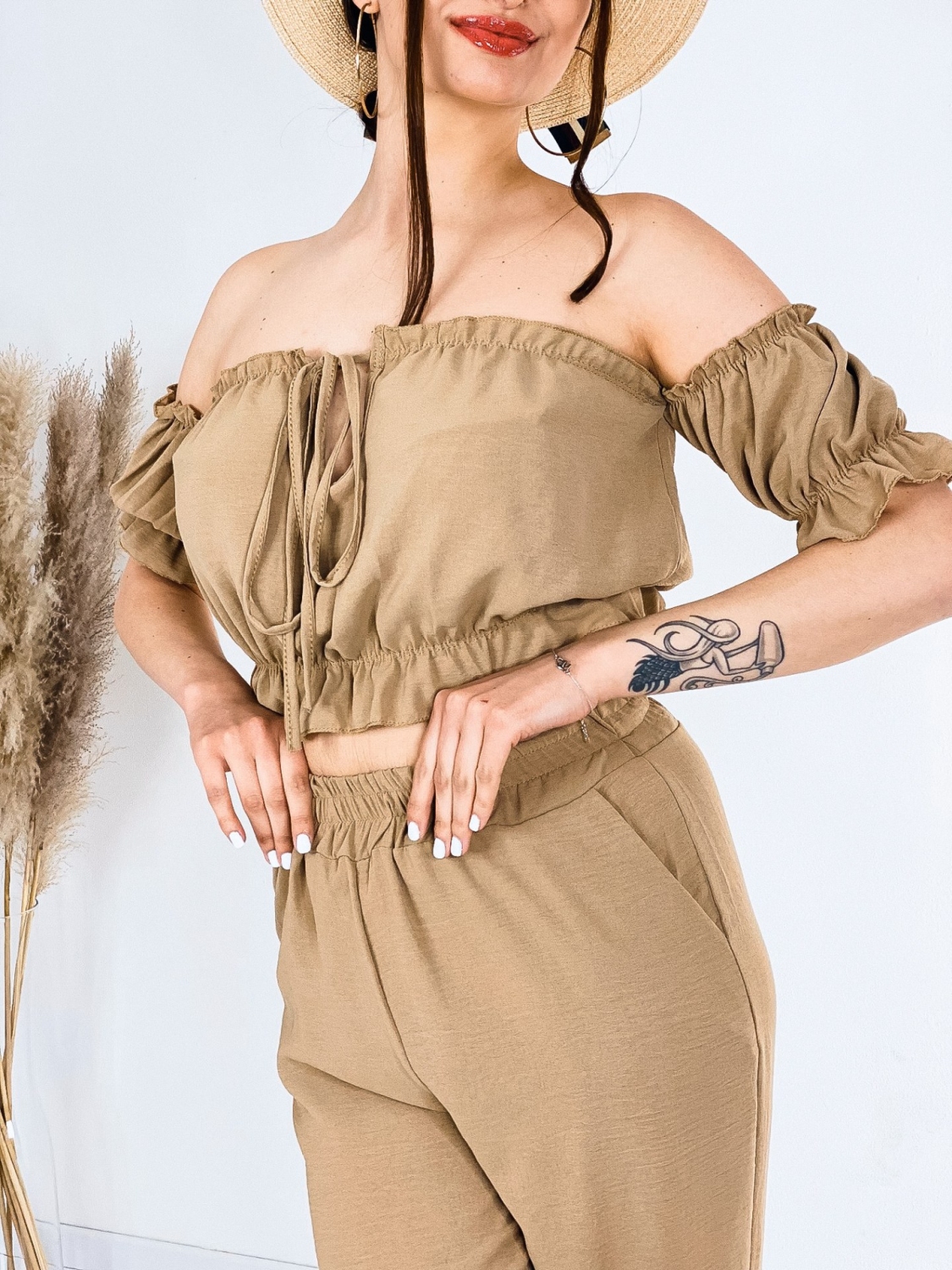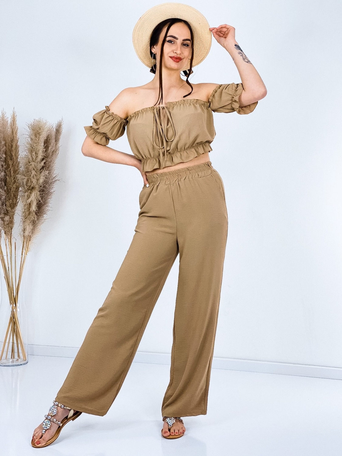 Štýlový letný komplet Jerryna. Pohodlný kúsok, v ktorom sa budete cítiť trendy. Tento komplet je vyrobený z veľmi príjemného materiálu a je kvalitne spracovaný. Skvele sa kombinuje, nakoľko jednotlivé kúsky môžete nosiť aj zvlášť. Komplet sa skladá z nohavíc, ktoré sú v rozšírenom strihu a crop-topu s krátkym rukávom. Nohavice majú v páse gumu, vďaka tomu sa Vám ihneď prispôsobia. Vrch je taktiež doplnený gumičkou. Bez zapínania. Natiahnete a môžete vyraziť. Jemné volániky na rukávoch. Vpredu viazanie. Doplňte svoj šatník týmto kúskom a cíťte sa štýlová aj počas bežných dní.
