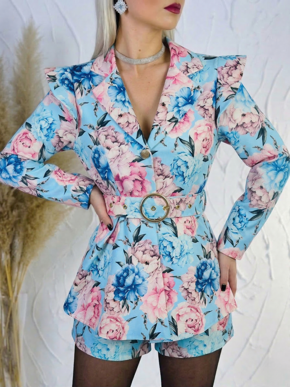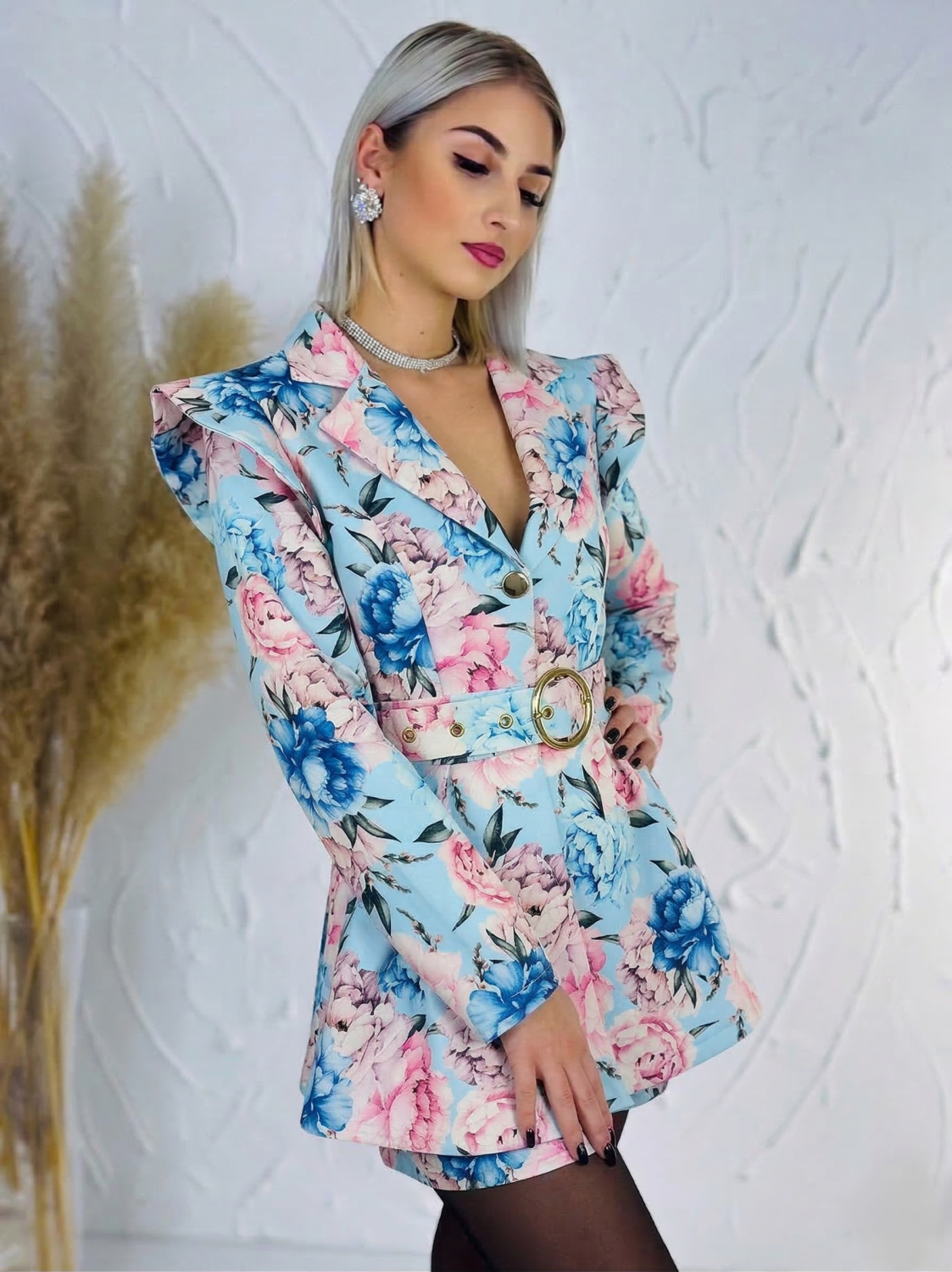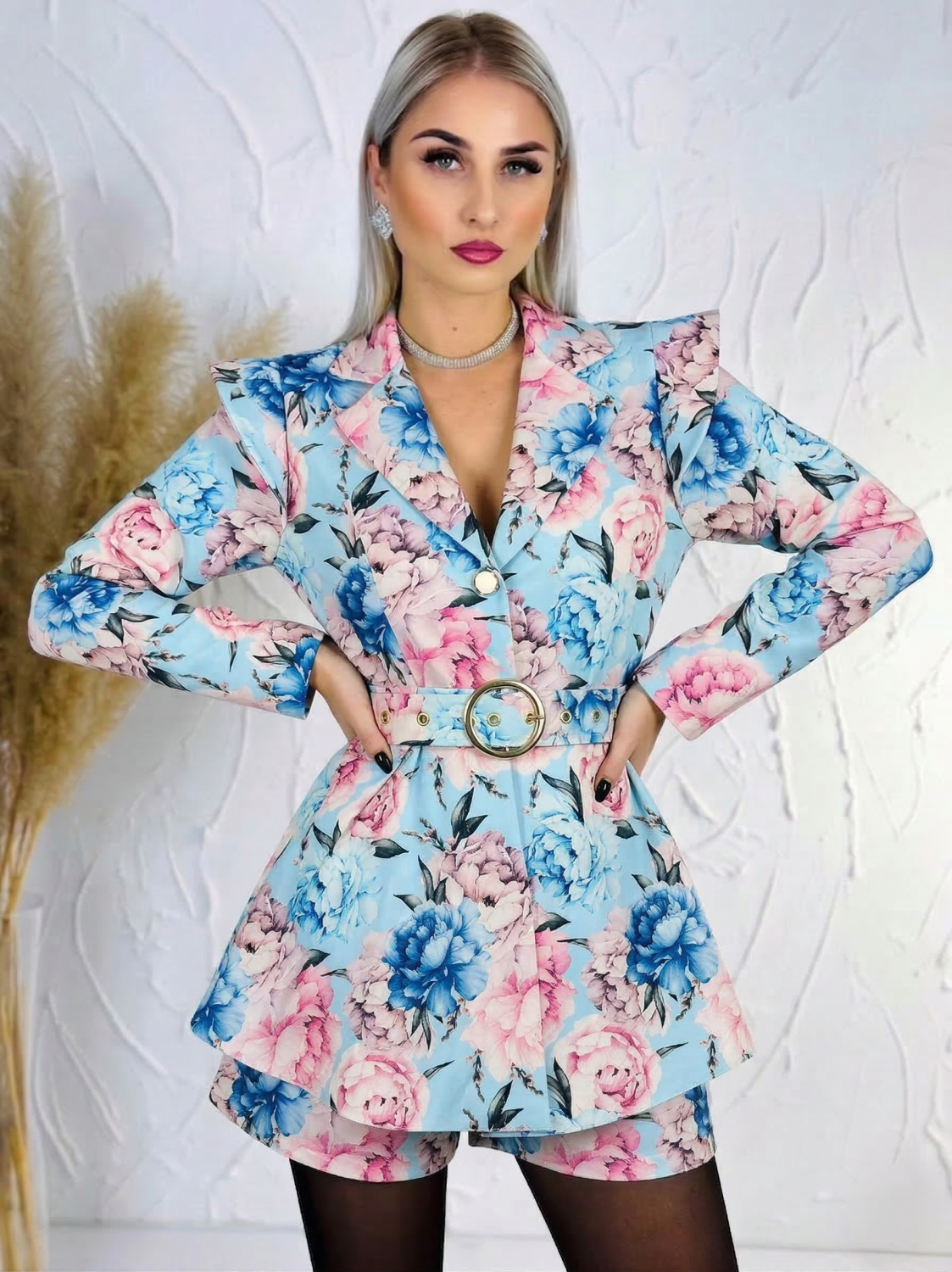 Dámsky kvetovaný overal je krásnym a štýlovým kúskom pre ženy, ktoré chcú pôsobiť žensky, elegantne a zároveň sviežo. Jemný kvetovaný vzor dodáva modelu romantický a moderný vzhľad, vďaka čomu je ideálny na rôzne príležitosti – od letných osláv, rodinných stretnutí až po romantické večere či bežné nosenie počas teplejších dní. Overal zaujme sofistikovaným véčkovým výstrihom, ktorý krásne zvýrazní dekolt a opticky predĺži postavu. Predná časť je riešená praktickým zapínaním na gombíky, ktoré uľahčujú obliekanie a zároveň vytvárajú jemný dizajnový detail. V páse sa nachádza opasok so štýlovou zlatou sponou, ktorý krásne zvýrazní pás a dodá celému outfitu elegantný nádych. Strih je navrhnutý tak, aby lichotil ženskej siluete a zároveň poskytoval maximálne pohodlie pri nosení. Materiál je príjemný na dotyk, ľahký a vzdušný, takže sa v ňom budete cítiť komfortne počas celého dňa.