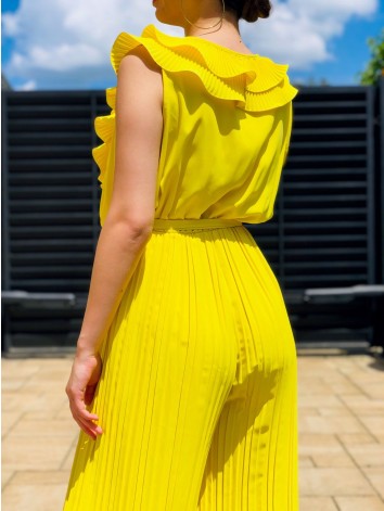 Dámsky plisovaný overal s volánmi, ktorý je doplnený opaskom. Overal je vyrobený z veľmi príjemného a mierne elastického materialu. Overal je bez zapínania s gumičkou v páse. V zaujímavom prevedení. TOP strih. Overal je nielen IN, ale aj nesmierne sexi. Stačí ak si k nemu obujete sandálky alebo tenisky a môžete vyraziť. Ľahko kombinovateľný kúsok. Outfit v štýle skutočnej módnej ikony. Spodok overalu je v rozširenom strihu. Absolútne trendy kúsok kamkoľvek pôjdete.