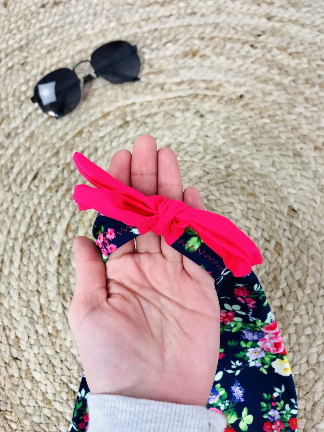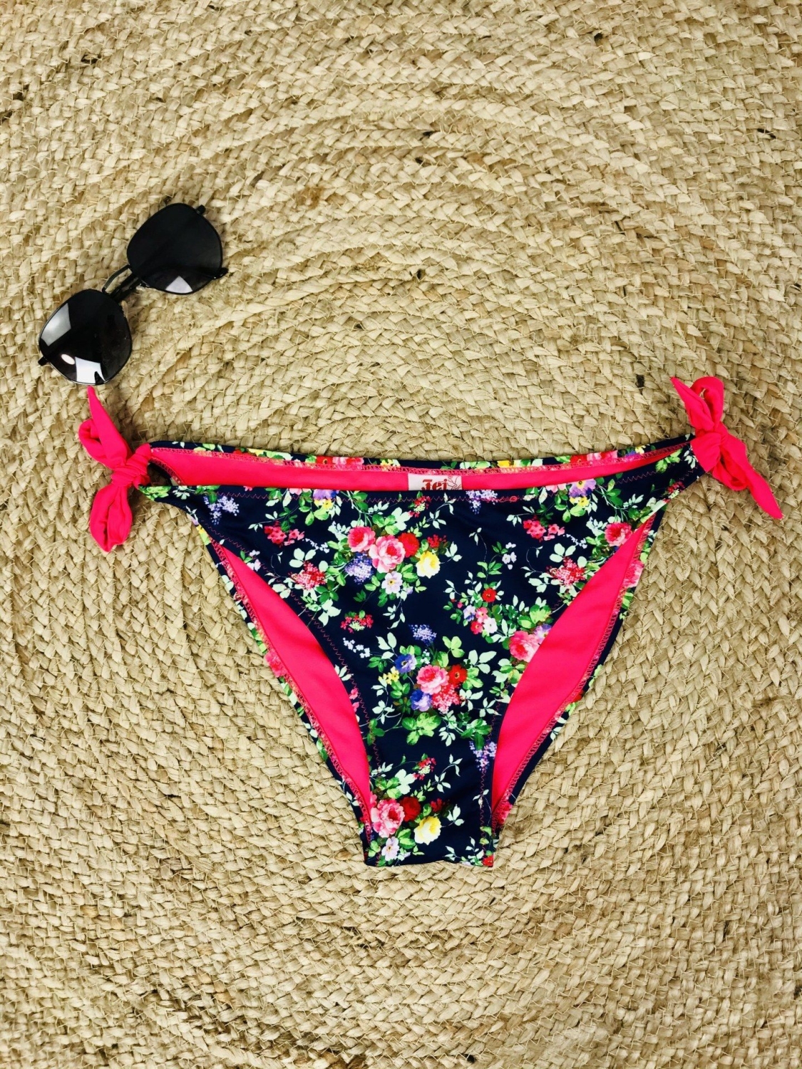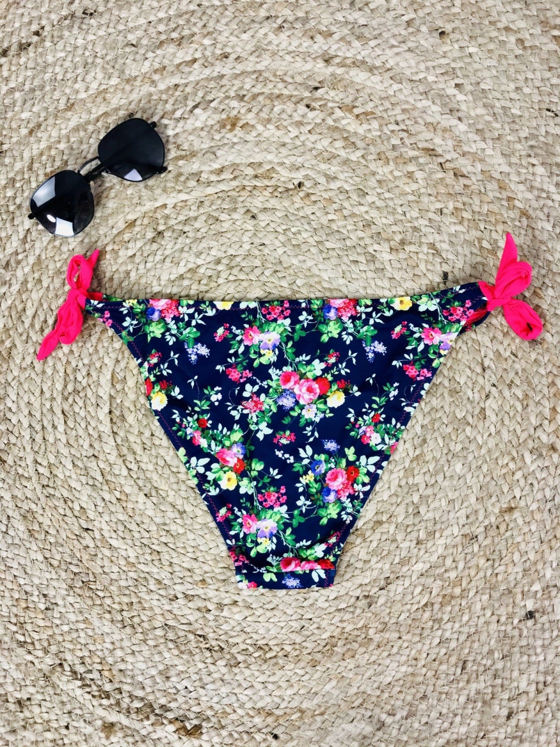 Dámsky tmavý spodný diel plaviek s kvetinovou potlačou vo veľkosti S/M. Plavky sú majú po bokoch viazanie a po obvode pásu sú romantické volány.