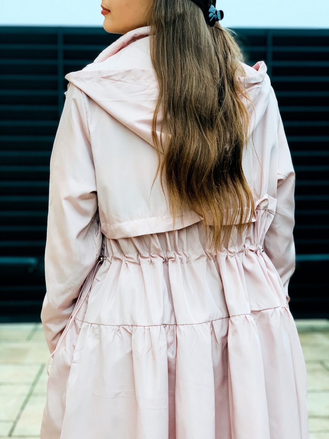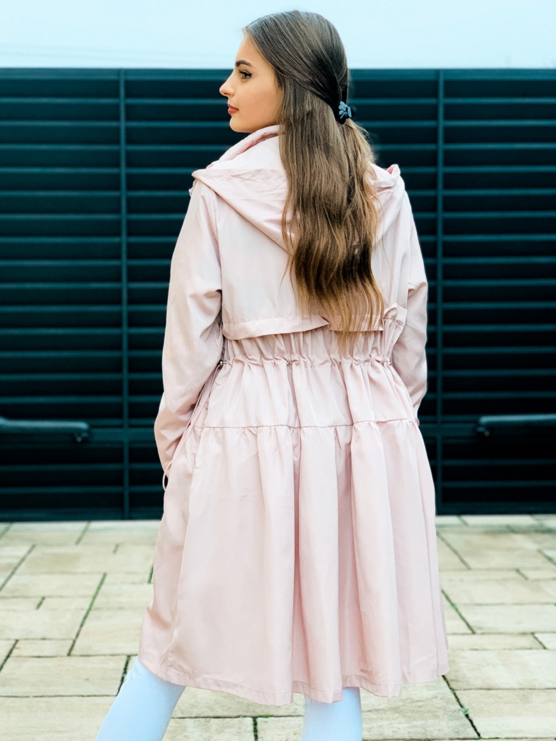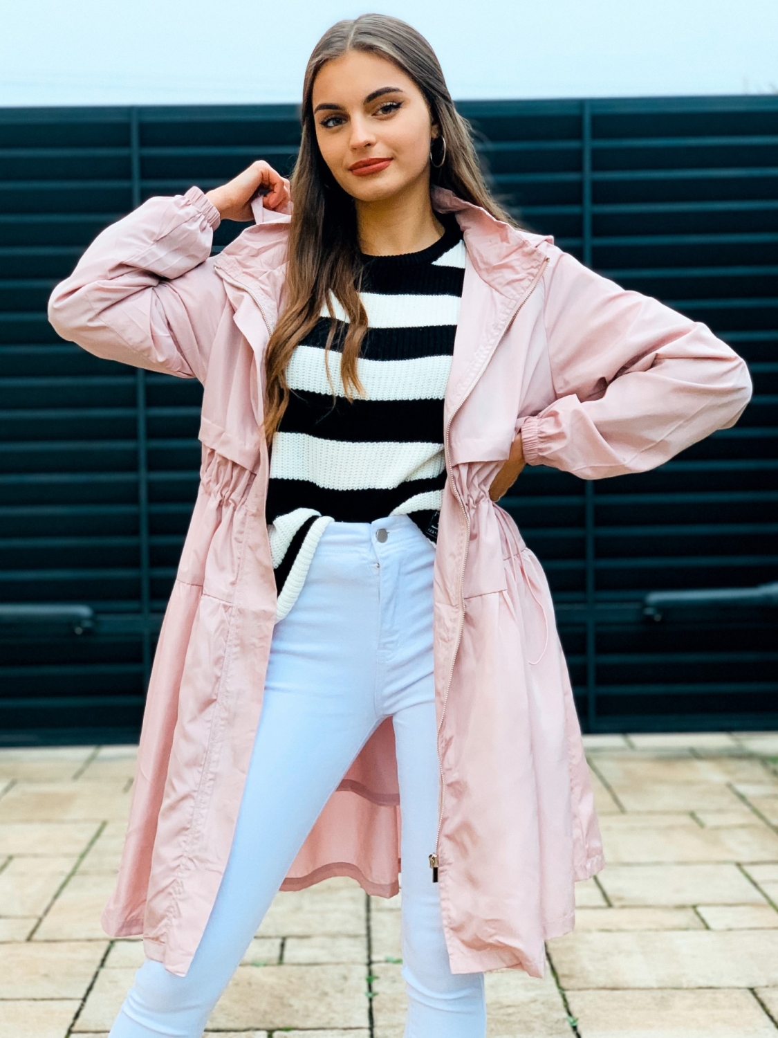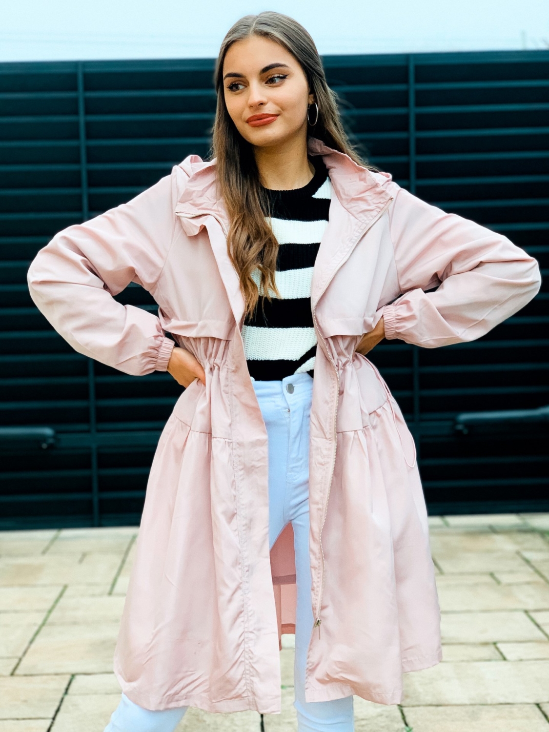 Dámska prechodná bunda/pršiplášť s kapucňou a so sťahovaním v páse. Bunda je doplnená vreckami na oboch stranách. Ihneď Vás ochráni počas sychravého počasia pred dažďom a vetrom. Zaručene trendy kúsok pre každú ženu. Bezpochýb ju využijete ku rôznym outfitom. Prechodná bunda je "musthave" kúsok. Bunda pôsobí nadčasovo a žensky. Zapínanie vpredu na zips. Modelka je vysoká 175 cm a oblečenú má veľkosť S.