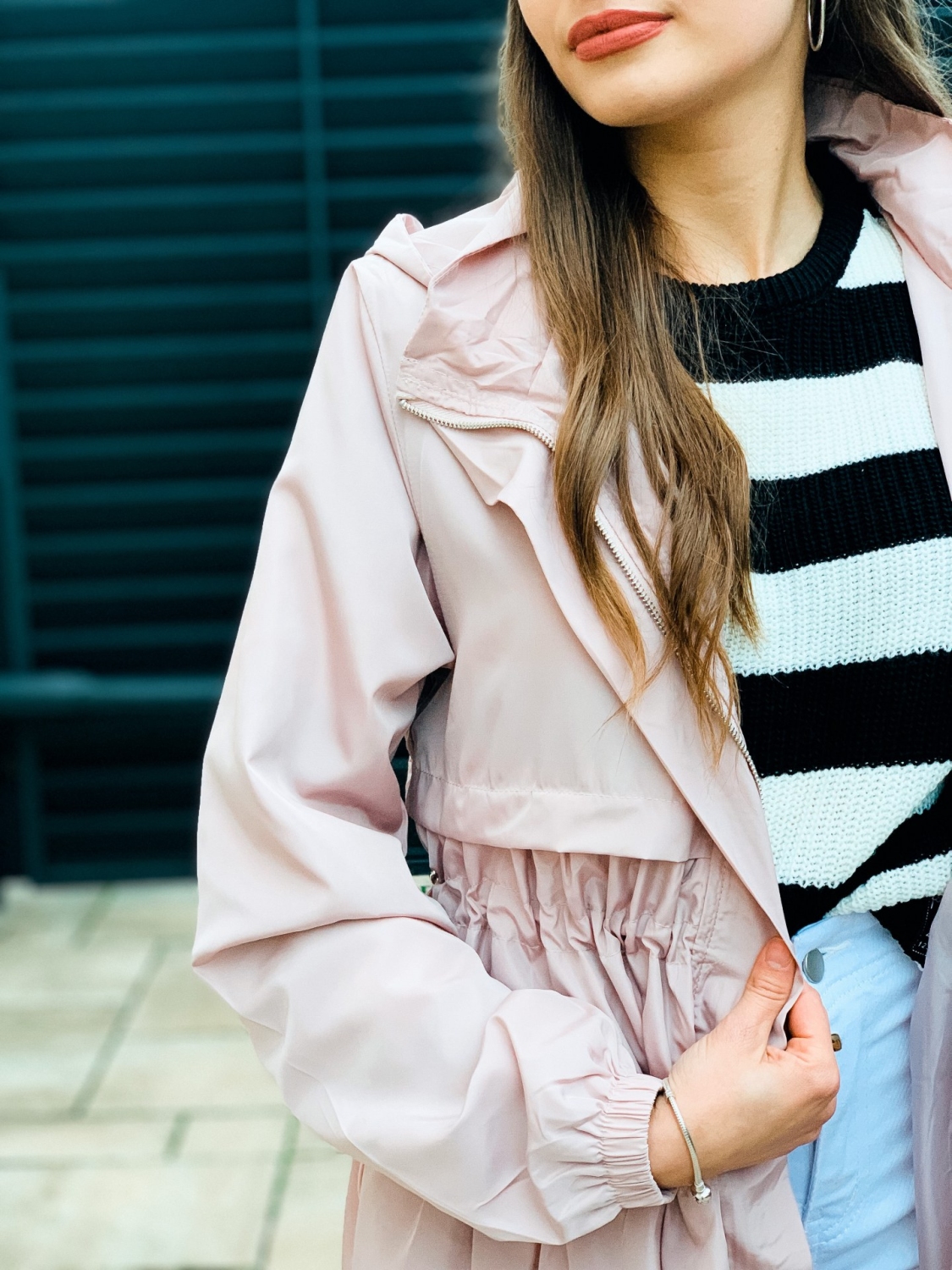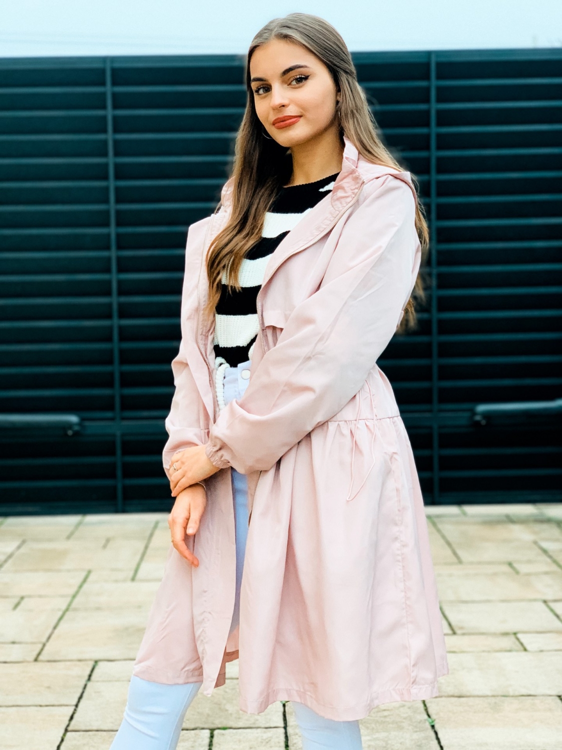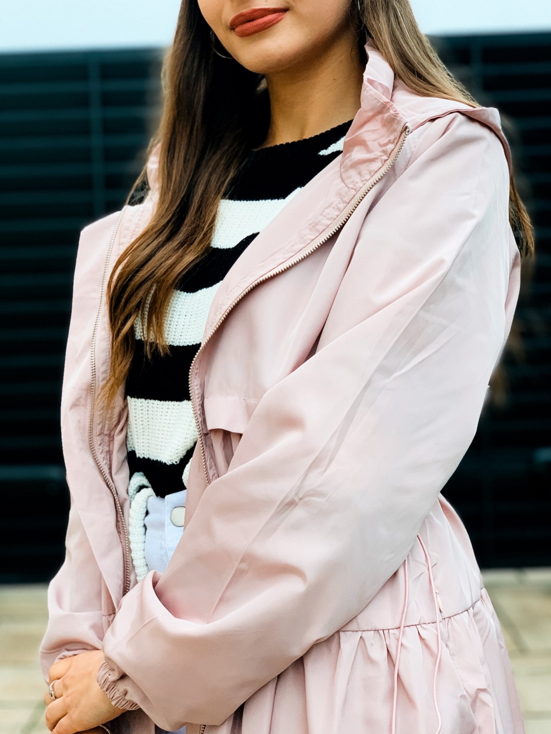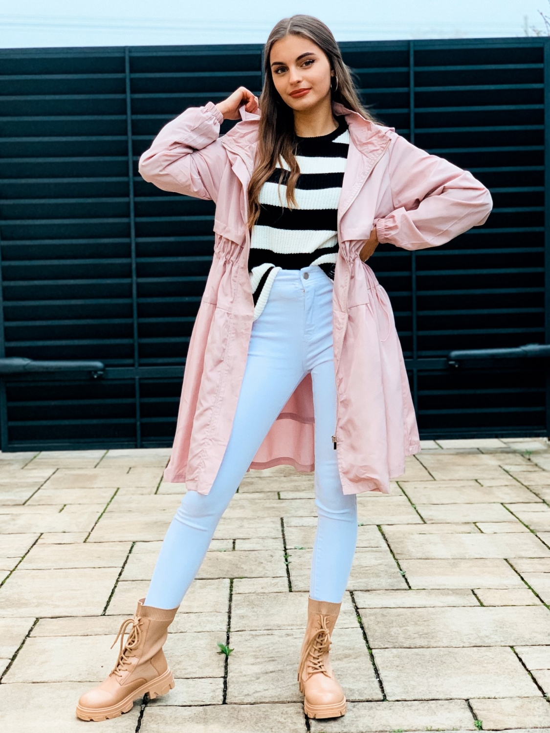 Dámska prechodná bunda/pršiplášť s kapucňou a so sťahovaním v páse. Bunda je doplnená vreckami na oboch stranách. Ihneď Vás ochráni počas sychravého počasia pred dažďom a vetrom. Zaručene trendy kúsok pre každú ženu. Bezpochýb ju využijete ku rôznym outfitom. Prechodná bunda je "musthave" kúsok. Bunda pôsobí nadčasovo a žensky. Zapínanie vpredu na zips. Modelka je vysoká 175 cm a oblečenú má veľkosť S.