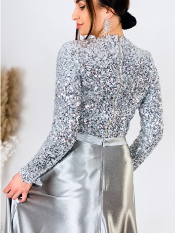 Dámsky strieborný spoločenský komplet sukňa a top. Sukňa je vyrobená z kvalitného saténového materiálu v áčkovom strihu. Vrchný diel je elastického materiálu, zdobený flitrami. Je možné nosiť aj oddelene, vhodný na rôzne udalosti ako je svadba, stužková slávnosť alebo ples. Sukňa pôsobí naozaj elegantne a mohutne. Vzadu sa zapína na zips. Vrchný diel sa zapína na zips vzadu na chrbte.Nádherne prevedenie kompletu si zamiluje každa z Vás. Vďaka jednoduchosti v ňom určite zažiarite a budete sa cítiť jedinečne. Modelka je vysoká 175 cm a má oblečenú veľkosť M.