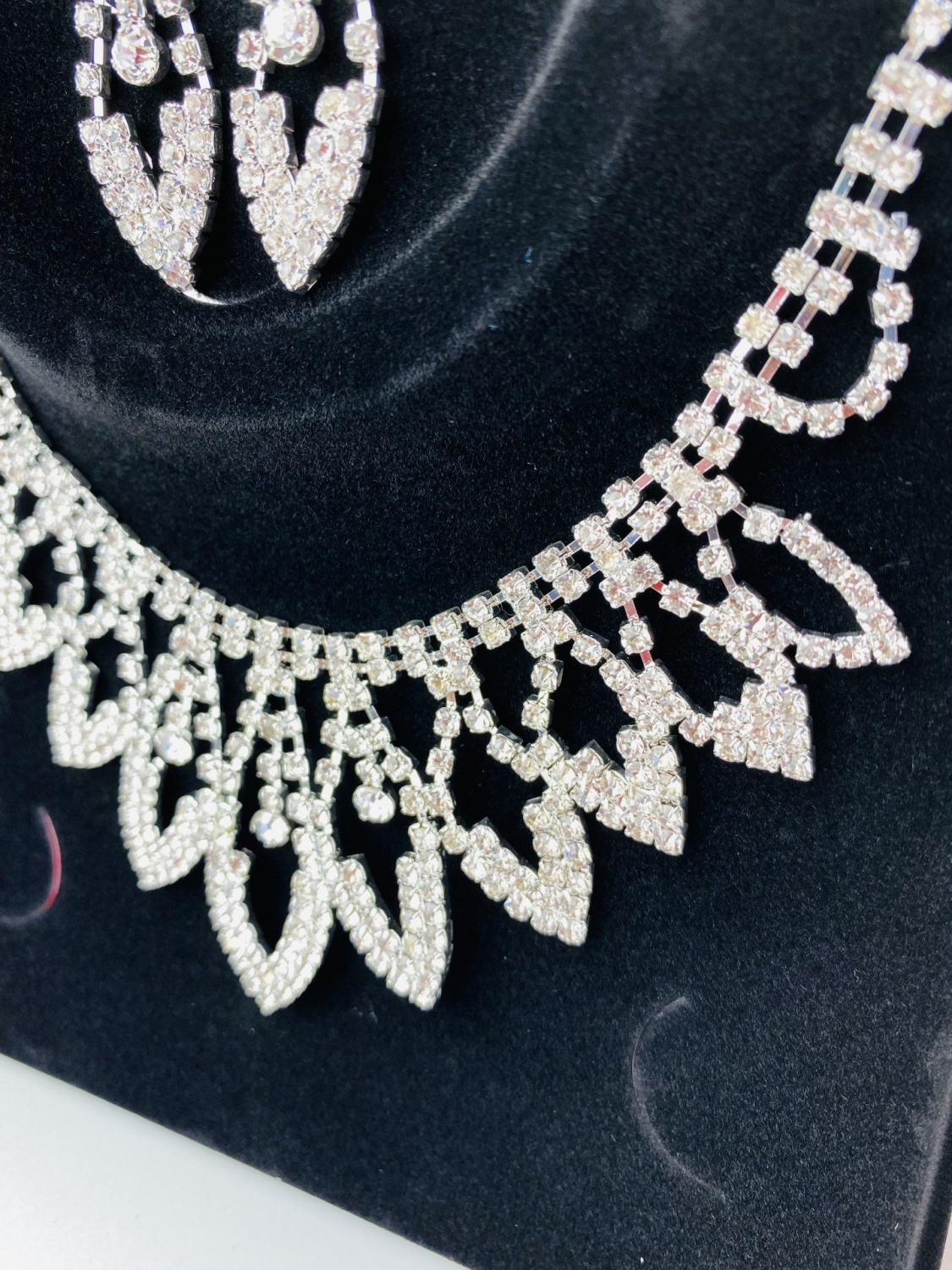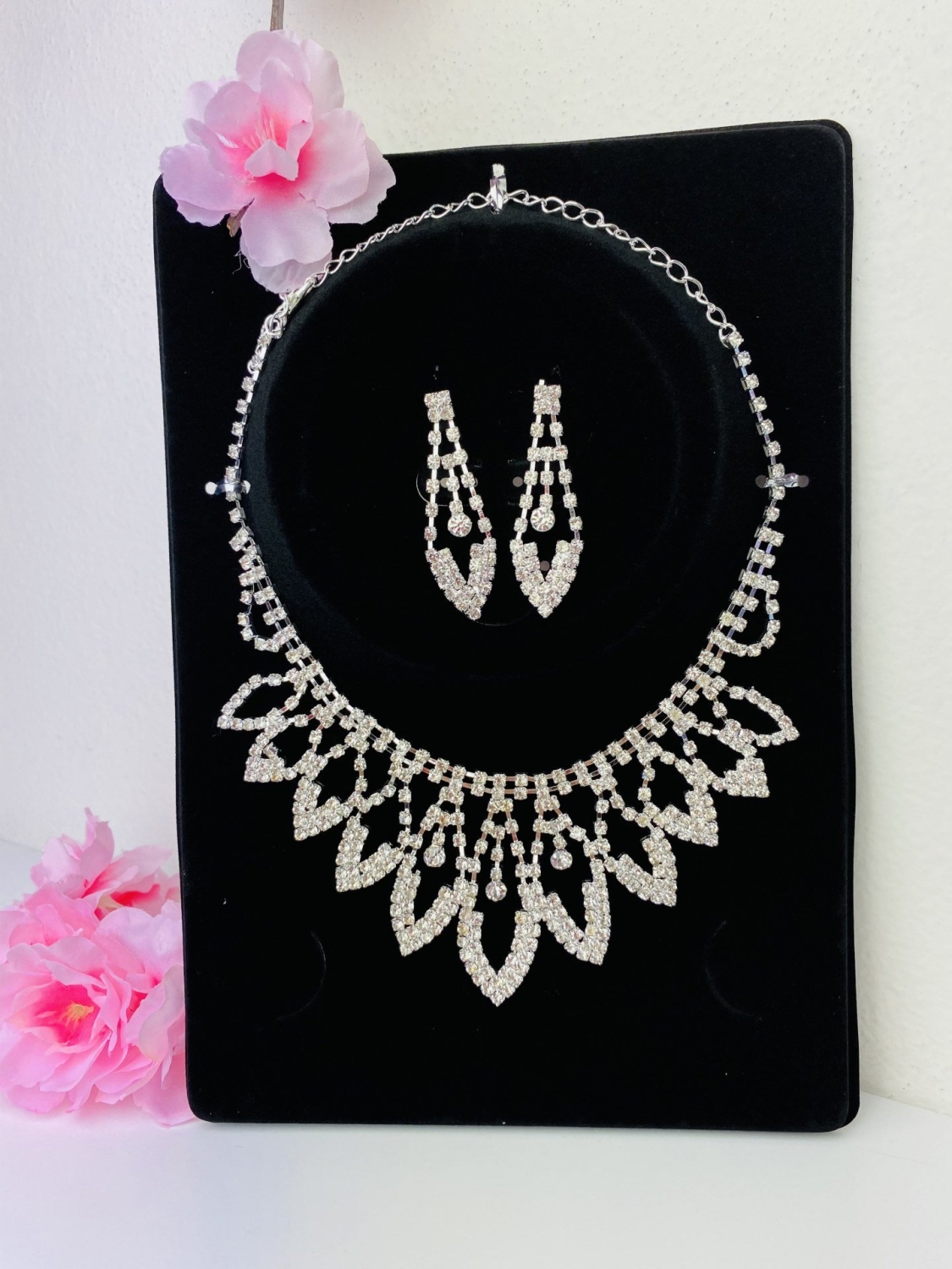 Dámsky strieborný štrásový set, ktorý pozostáva zo zaujímavého náhrdelníka a náušníc. Tento set krásne oživí každý spoločenský oufit. Vhodný na svadbu, stužkovú, 1. sväté prijímanie, či inú spoločenskú udalosť.