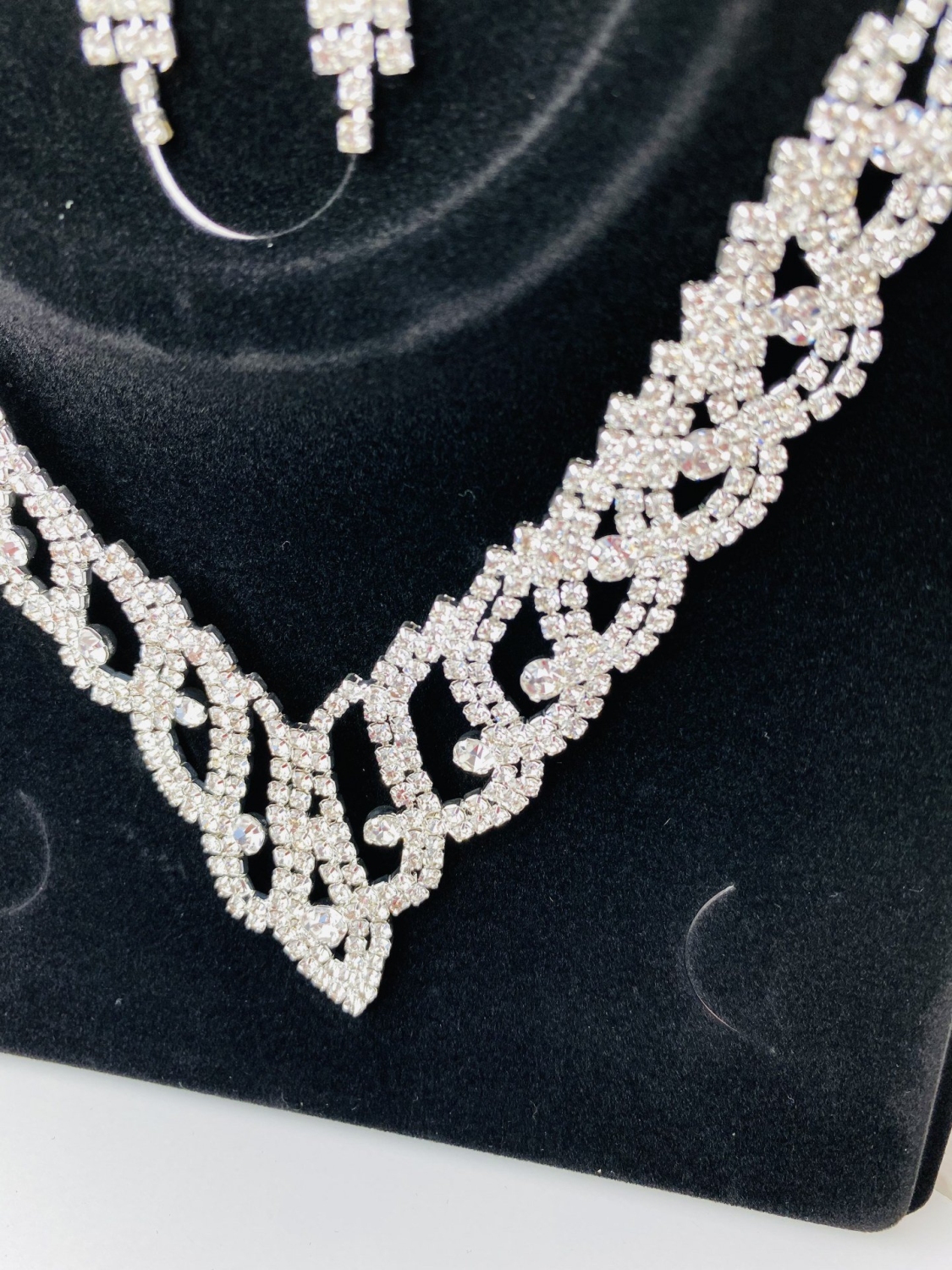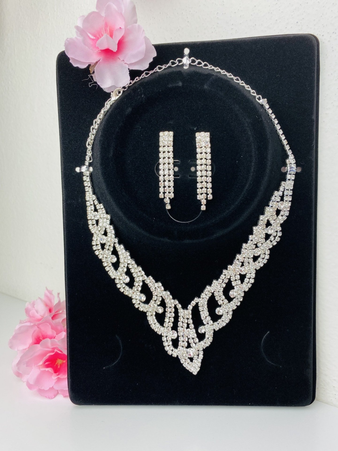 Dámsky strieborný štrásový set, ktorý pozostáva zo zaujímavého náhrdelníka a náušníc. Tento set krásne oživí každý spoločenský oufit. Vhodný na svadbu, stužkovú, 1. sväté prijímanie, či inú spoločenskú udalosť.