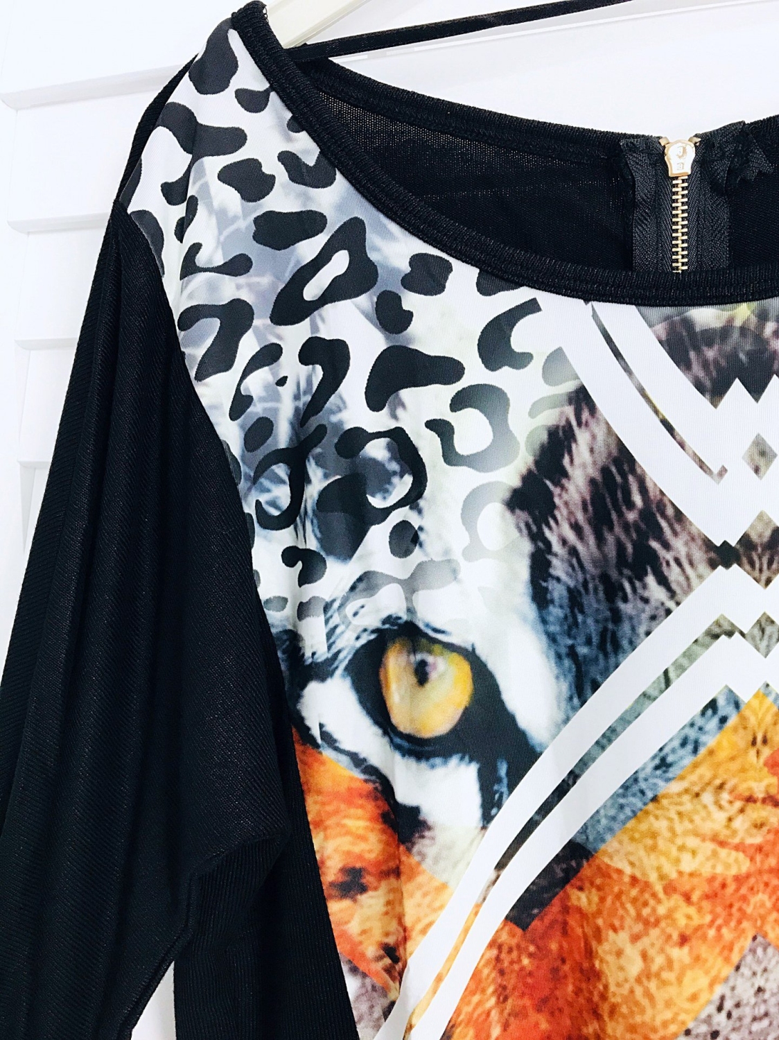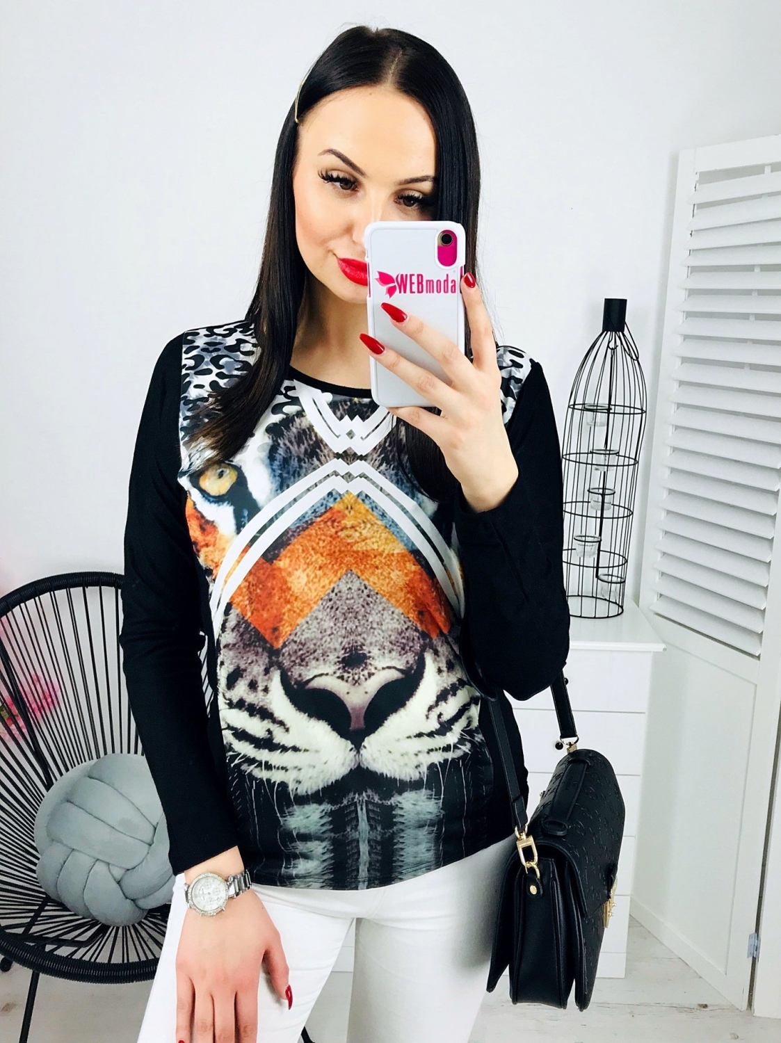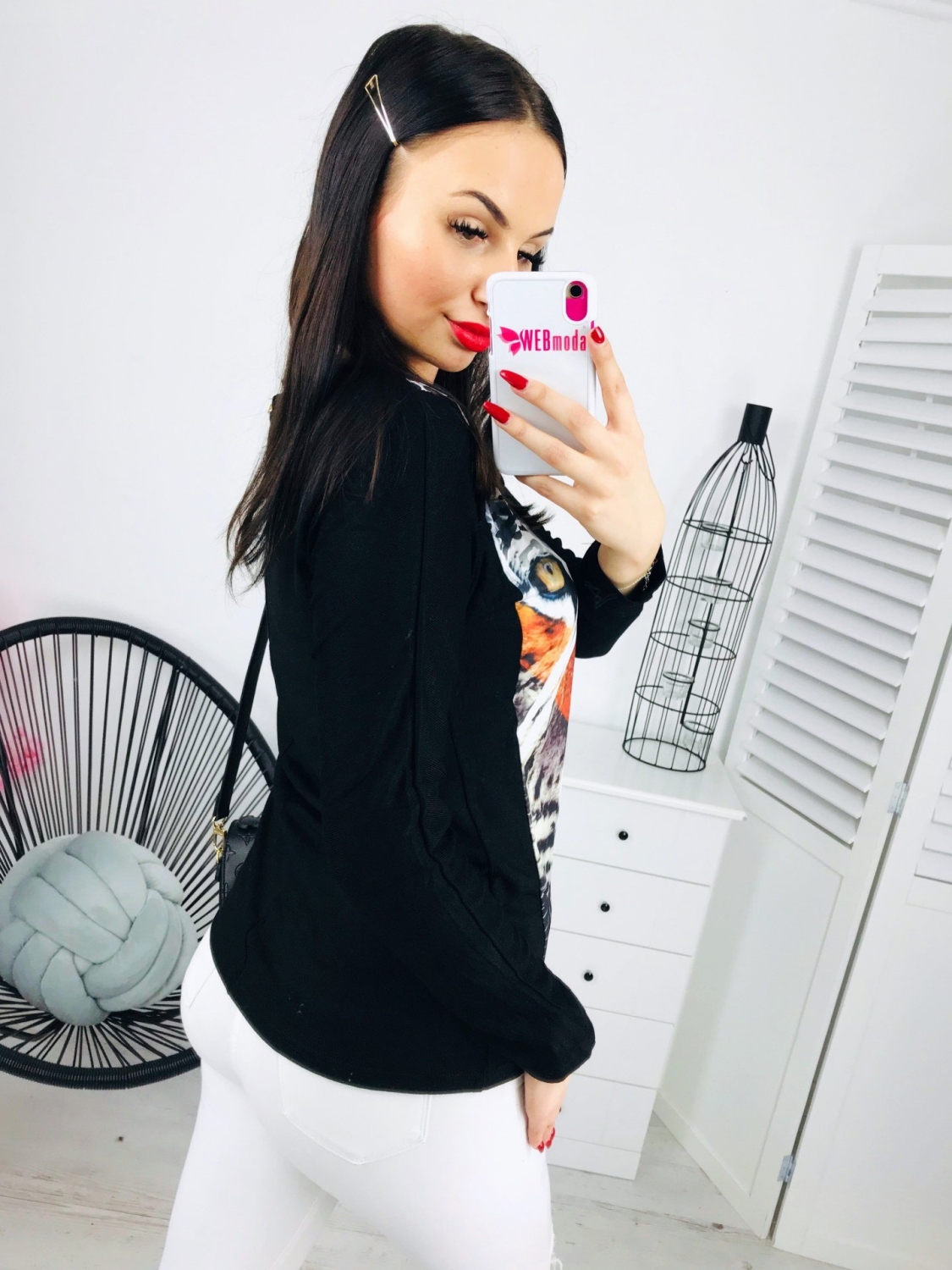 Dámsky čierny top so zvieracou potlačou a dlhým rukávom. Pohodlný material. Modelka je vysoká 175 cm a oblečenú má veľkosť S/M.