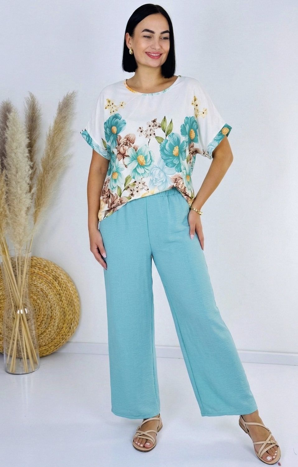 Tento dámsky komplet v modernom oversize strihu je ideálnou voľbou pre ženy, ktoré milujú pohodlie bez kompromisov v štýle. Voľne padnúce široké nohavice s elastickou gumičkou v páse sa dokonale prispôsobia postave, neobmedzujú pohyb a zároveň vytvárajú elegantnú, uvoľnenú siluetu. Vďaka vzdušnému materiálu sú ideálne na každodenné nosenie, ale aj na teplejšie dni, keď oceníš ich ľahkosť a priedušnosť. Vrchný diel tvorí štýlová blúzka s krátkym rukávom, ktorá zaujme jemným kvetinovým vzorom. Ten dodáva celému outfitu ženskosť, sviežosť a romantický nádych. Oversize strih blúzky perfektne ladí s nohavicami a vytvára harmonický, trendy komplet, ktorý pôsobí nenútene, no zároveň veľmi vkusne. Komplet je skvelou voľbou na rôzne príležitosti – či už ideš na prechádzku mestom, stretnutie s kamarátkami alebo si chceš dopriať pohodlný, no štýlový outfit do práce. Jednoducho ho skombinuješ s teniskami pre ležérny look alebo sandálmi pre elegantnejší dojem. Tento outfit je dôkazom toho, že aj pohodlné kúsky môžu byť krásne, ženské a moderné zároveň.