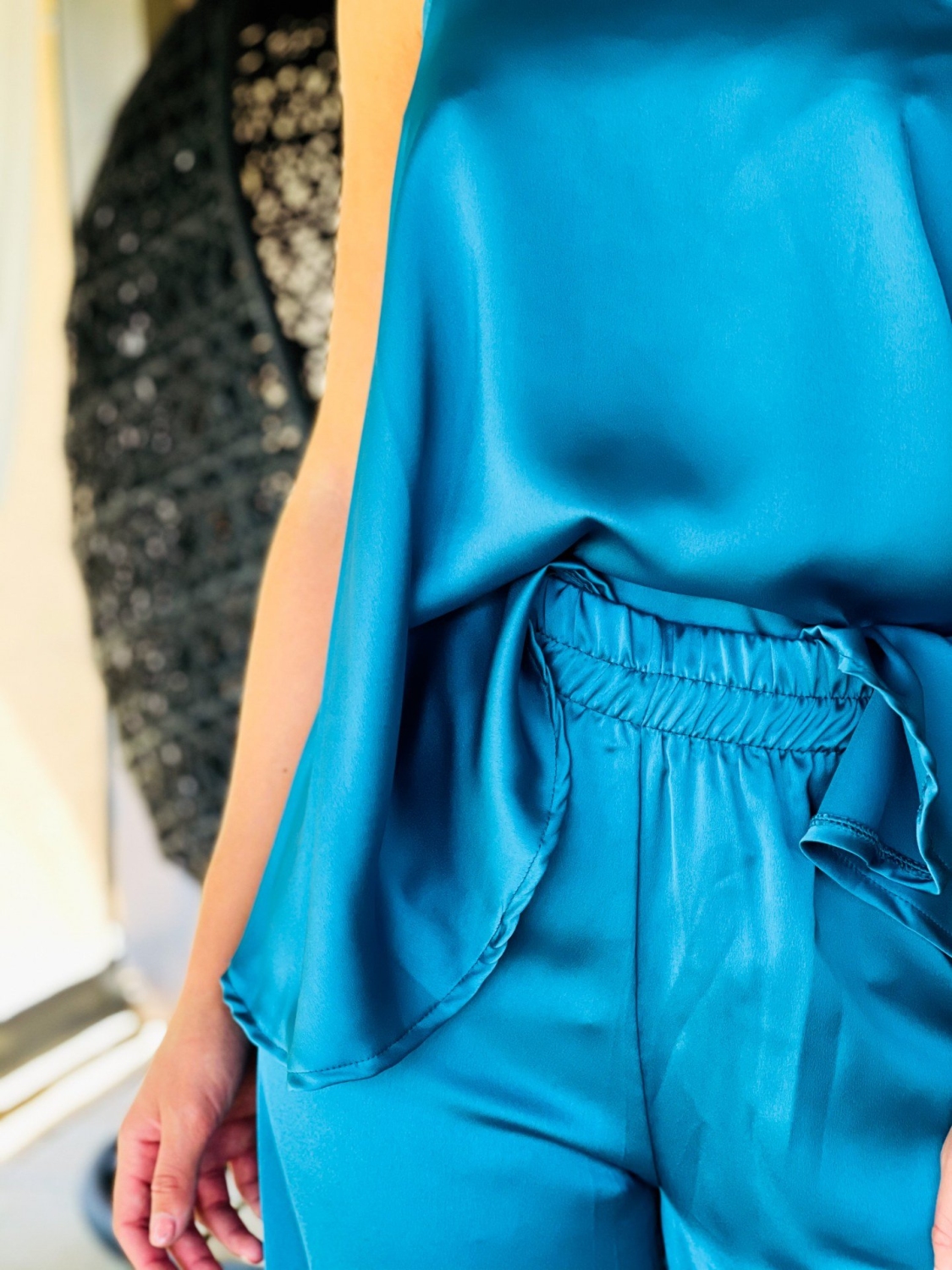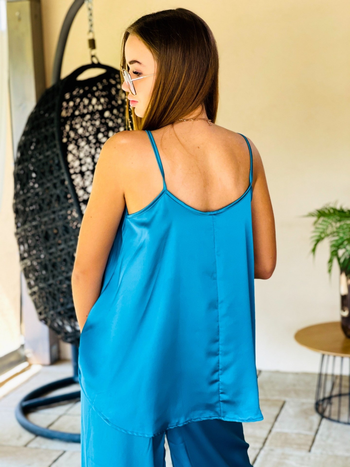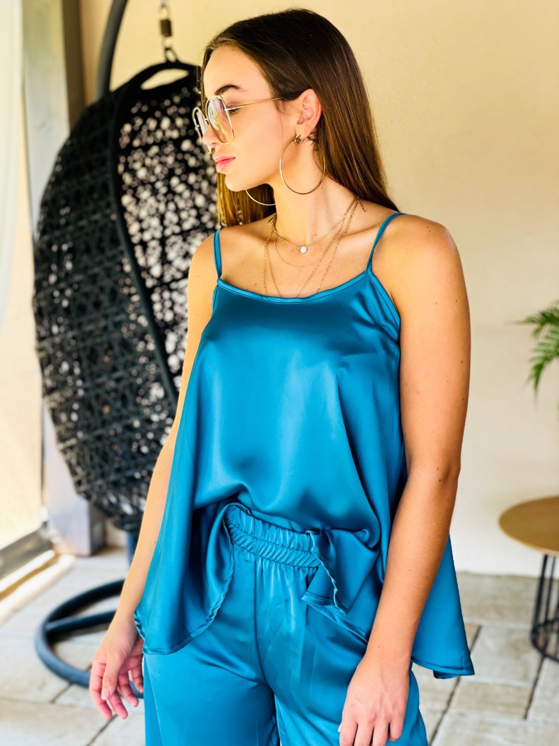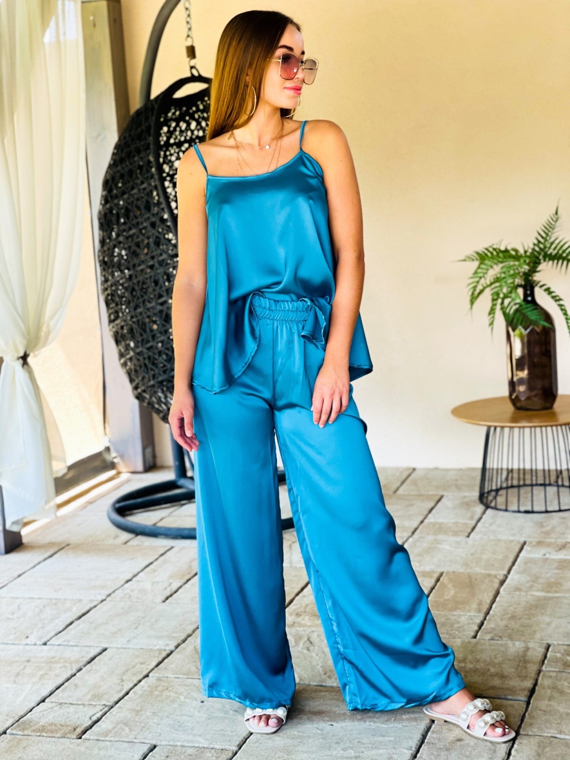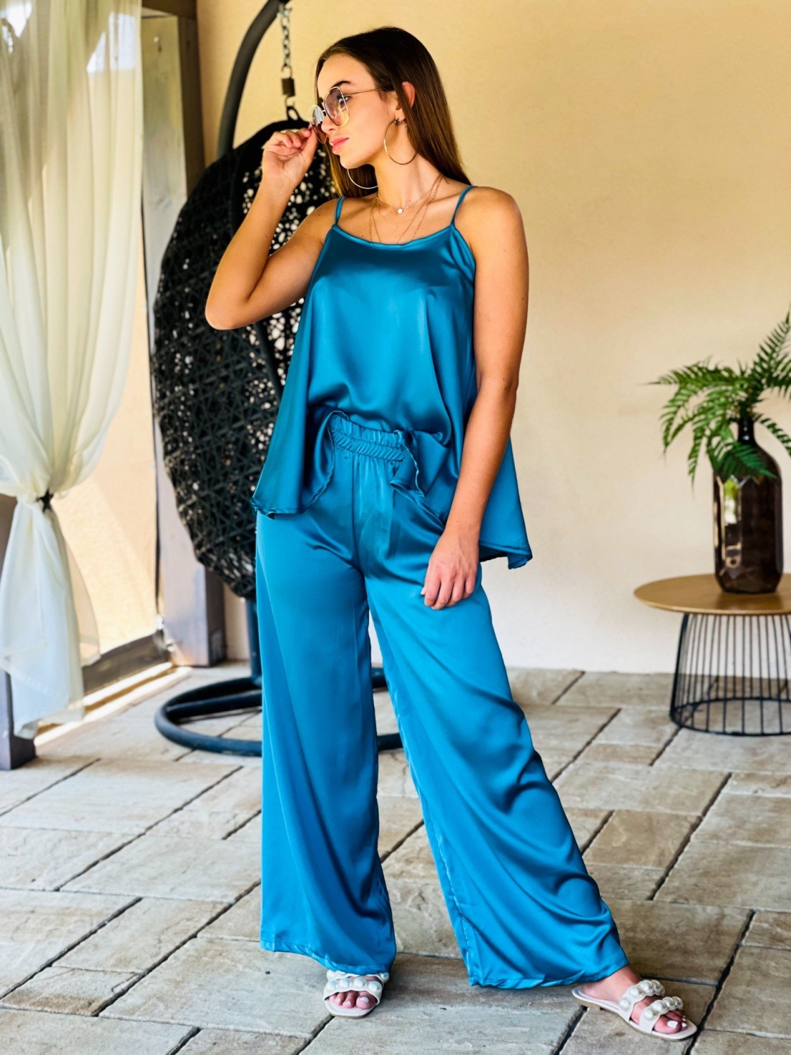 Dámsky saténový komplet nohavice + tielko. Tento komplet je všestranný kúsok, ktorý Vám túto sezónu nesmie v šatníku chýbať. Obliecť si ho môžete na bežný deň, ale aj na spoločenskú udalosť. Zložené je z pohodlného a kvalitného padavého materiálu, ktorý je veľmi ľahučký. Nohavice sú voľnejšieho strihu a s vyšším pásom. V páse sa nachádza guma. Možnosť nosenia aj zvášť. Jednoduchý strih Vám dodá ženskosť. Modelka má výšku 172 cm a oblečenú má veľkosť UNI.