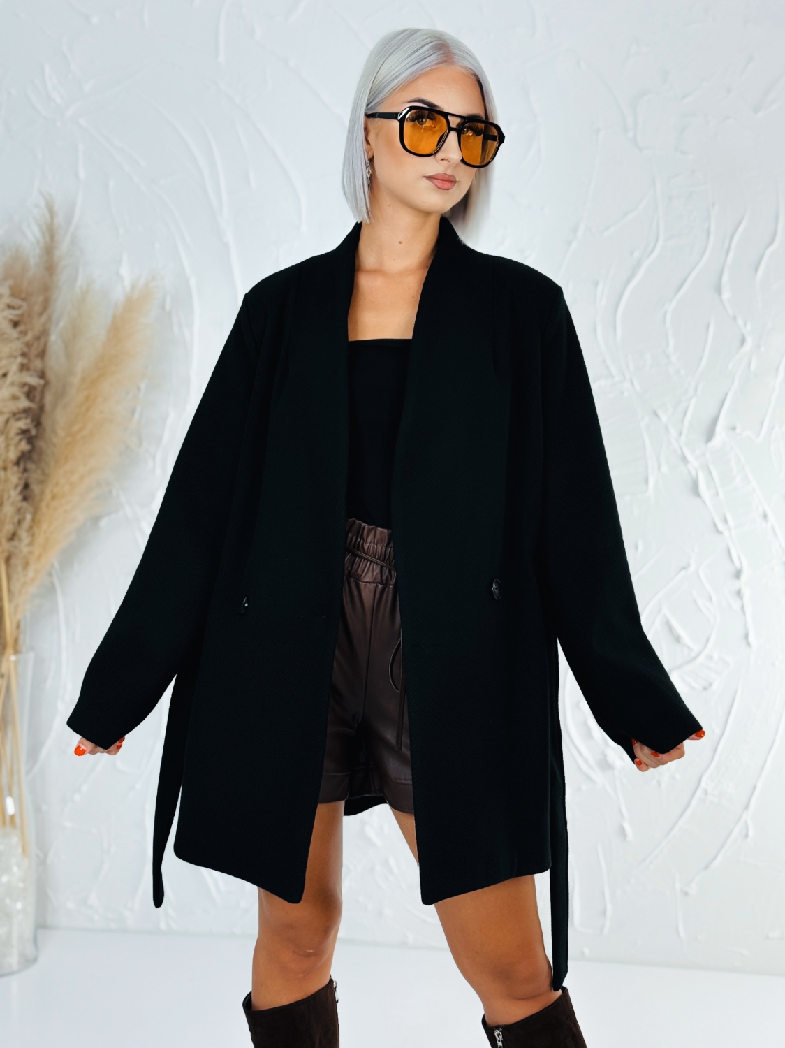 Dámsky vrúbkovaný čierny kabát s opaskom