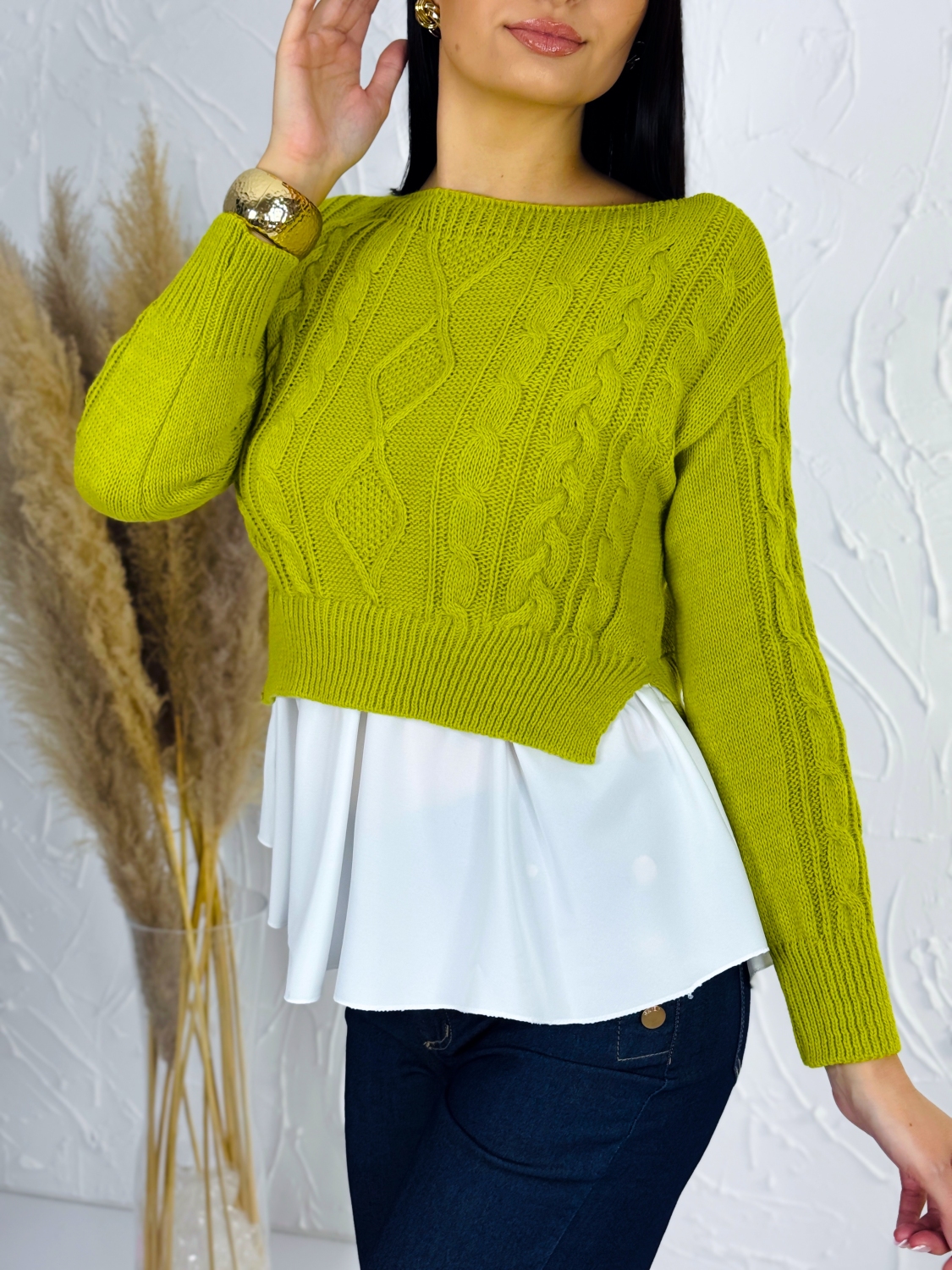 Tento dámsky sveter v TOP farbe spája pohodlie a ženskú eleganciu v jednom kúsku. Vyrobený je z príjemného, hrejivého úpletu so štruktúrovaným vrkočovým vzorom, ktorý dodáva modelu klasický, nadčasový vzhľad. Originálnym detailom je spodný biely volánik, ktorý vytvára efekt vrstvenia – vyzerá ako košeľa vykúkajúca spod svetra, no ide o súčasť jedného celku. Tento detail pôsobí veľmi štýlovo a dodáva outfitu sviežosť a ľahkosť. Sveter má pohodlný, mierne kratší strih, ktorý krásne vynikne v kombinácii s nohavicami s vysokým pásom či úzkou sukňou. Je ideálny na bežné nosenie, do práce, aj na voľné chvíle – vždy, keď sa chceš cítiť štýlovo a žensky bez námahy.