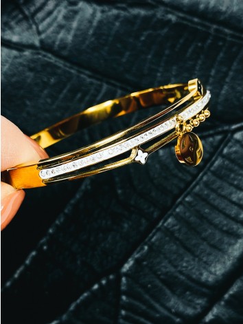 Dámsky pevný náramok v zlatej farbe. Krásne doplní a oživí akýkoľvek outfit, či už samotný náramok, alebo aj kombinácia náramku a náušníc z našej kolekcie šperkov. Stačí si vybrať svoju kombináciu. Náramok drží na ruke pevne vďaka skvelému zapínaniu. Výrazný prvok dámskej bižutérie, ktorý Vám zaručene nesmie chýbať.