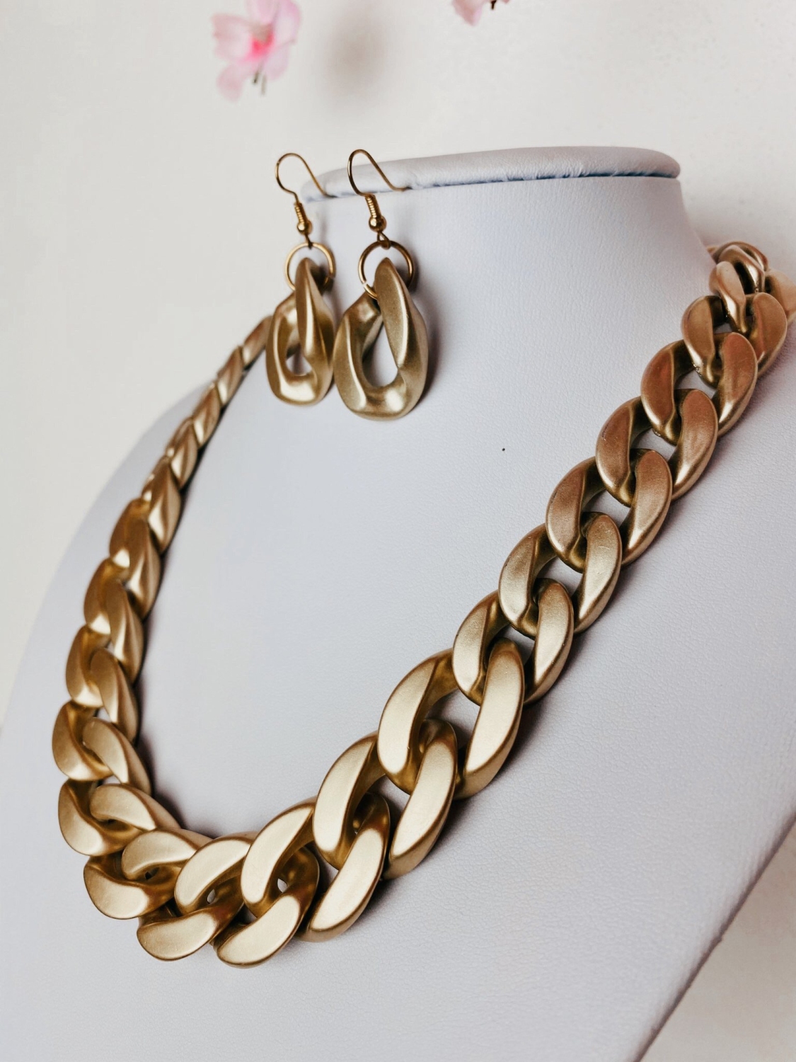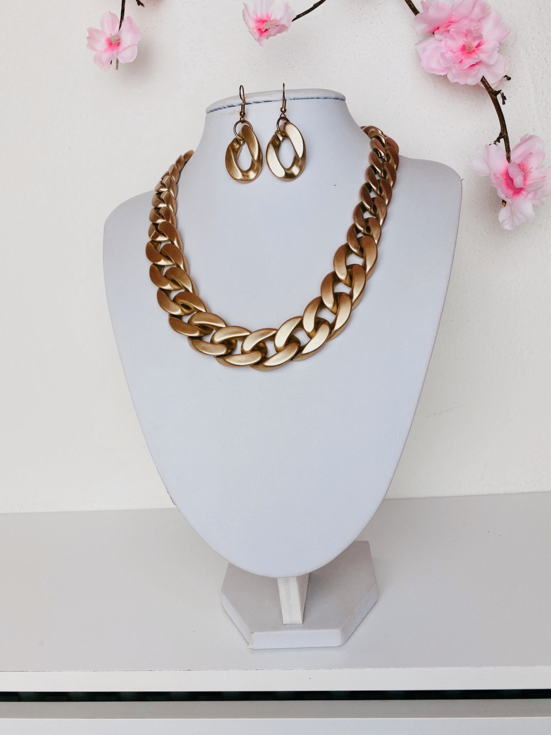 Dámsky zlatý matný set - náhrdelník a náušnice. Krásne oživí každý oufit. Je výrazný a hodí sa ako k šatám, tak aj k jednoduchej bielej blúzke, či roláku.