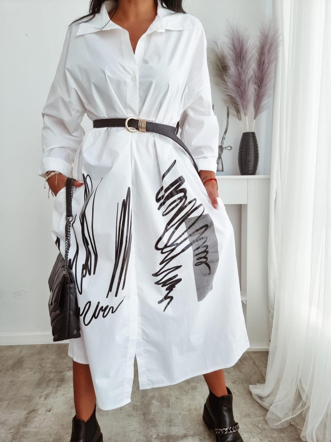 Dámske mega košeľové šaty, ktoré sú v predĺženom strihu a doplnené potlačou. Šaty sú vyrobené z veľmi kvalitného a vzdušného materiálu a pri nosení zabezpečia maximálny komfort. Ľahko kombinovateľné. Šaty, ktoré do Vášho outfitu prinesu iskru a vykúzlia tak ihneď perfektný look. Kvalitný kúsok pre každú trendovú žienku, ktorá miluje módu a zaujímavé kúsky. Oversize strih Vám zabezpečí, že budete žiariť spokojnosťo. Zapínanie vpredu na gombíky. Vrecká na oboch stranách. (Opasok nie je súčasťou šiat). Modelka je vysoká 175 cm a oblečenú má veľkosť UNI.