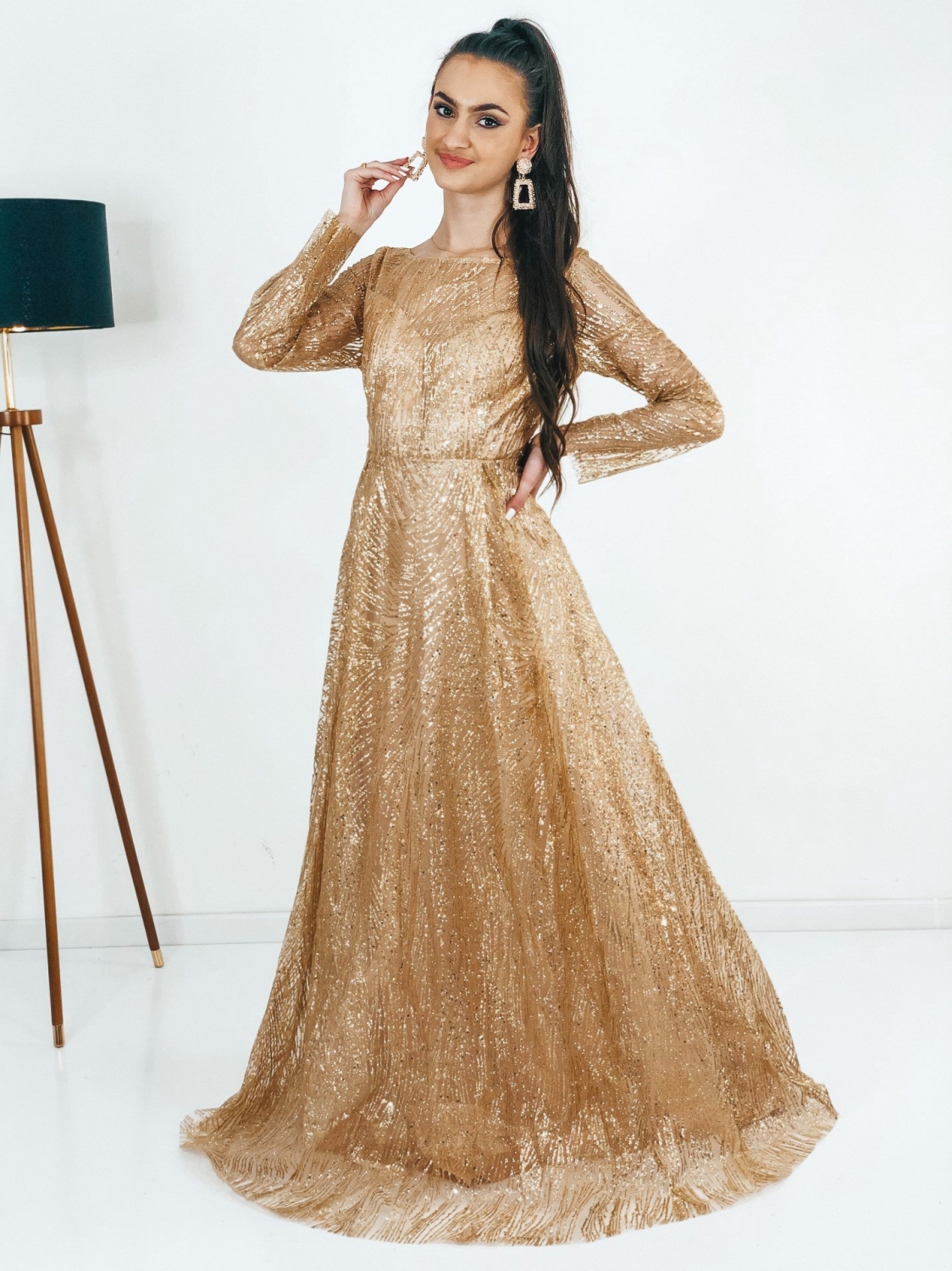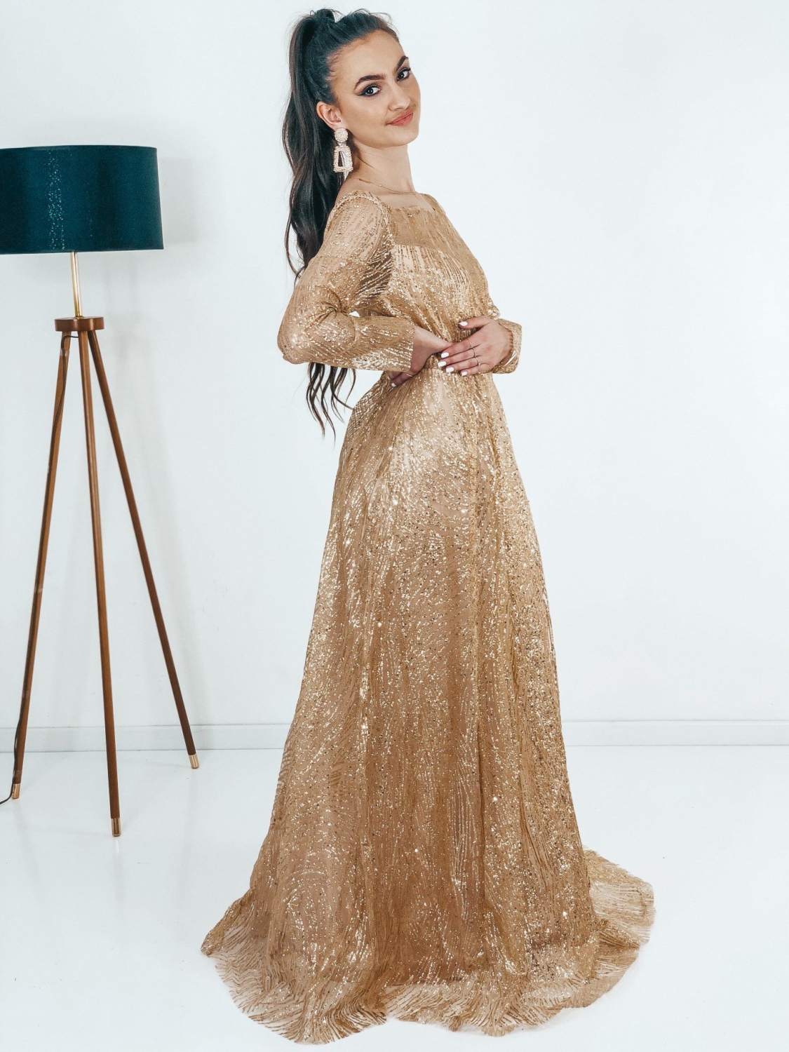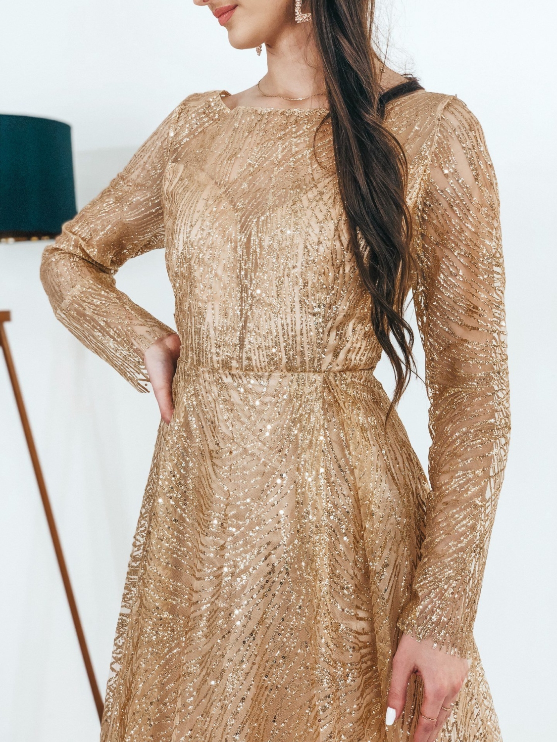 Dámske spoločenské šaty v zlatej farbe a s dlhým rukávom. Zaujímavý kúsok z našej ponuky, ktorý očarí každú z Vás. Dokonalé šaty, na dokonalú príležitosť - sen každej Slečny, Ženy, Dámy. Šaty sú v trblietavom prevedení. Strih šiat je do "A" V týchto šatách upútate každé očko a budete sa cítiť jedinečne. Vystúžené prsia a zapínanie vzadu na zips. Exkluzívny kúsok, ktorý by nemal chýbať žiadnej žene, ktorá má rada kvalitnú a štýlovú módu. Modelka je vysoká 175 cm a má oblečenú veľkosť 40.