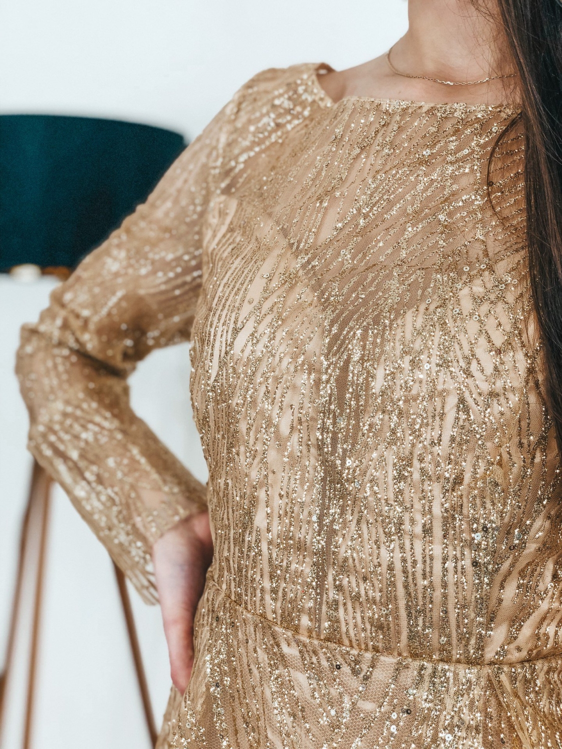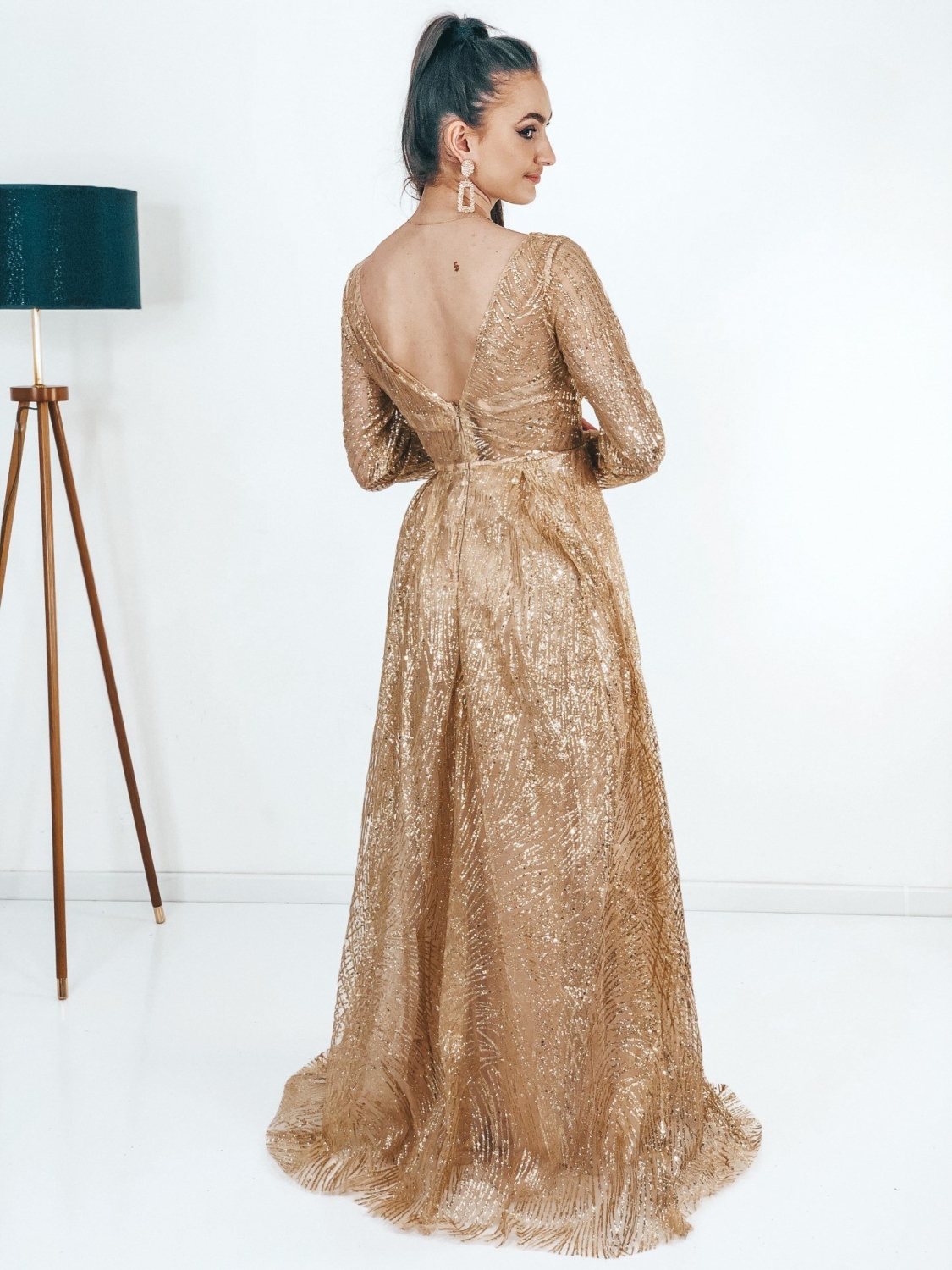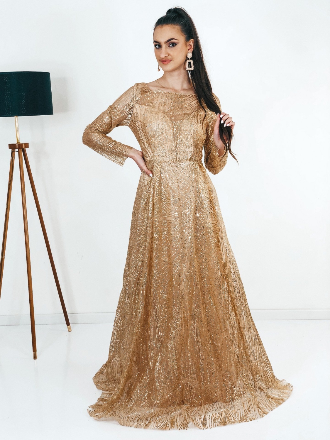 Dámske spoločenské šaty v zlatej farbe a s dlhým rukávom. Zaujímavý kúsok z našej ponuky, ktorý očarí každú z Vás. Dokonalé šaty, na dokonalú príležitosť - sen každej Slečny, Ženy, Dámy. Šaty sú v trblietavom prevedení. Strih šiat je do "A" V týchto šatách upútate každé očko a budete sa cítiť jedinečne. Vystúžené prsia a zapínanie vzadu na zips. Exkluzívny kúsok, ktorý by nemal chýbať žiadnej žene, ktorá má rada kvalitnú a štýlovú módu. Modelka je vysoká 175 cm a má oblečenú veľkosť 40.