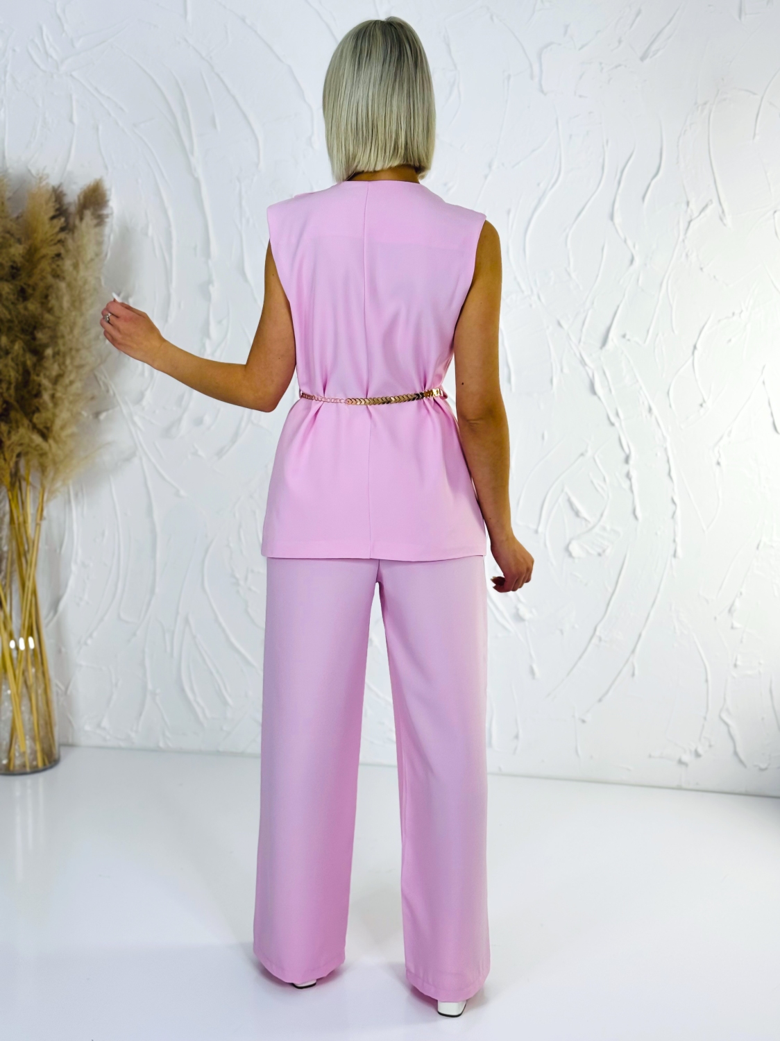 Elegantný dámsky kostým pozostávajúci z ľahkej vesty a pohodlných nohavíc predstavuje dokonalú kombináciu štýlu, ženskosti a moderného minimalizmu. Vesta má čistý, sofistikovaný strih bez rukávov, ktorý krásne zvýrazňuje líniu ramien a pôsobí veľmi vkusne a nadčasovo. Predĺžený strih vesty opticky zoštíhľuje postavu a zároveň dodáva celému outfitu jemnú eleganciu. Decentné zapínanie pri krku a precízne spracovanie detailov podčiarkujú luxusný vzhľad tohto kúsku. Nohavice sú navrhnuté s dôrazom na komfort a voľnosť pohybu, pričom ich splývavý materiál pôsobí ľahko a vzdušne. Širší strih nohavíc lichotí postave a vytvára harmonickú siluetu, ktorá je ideálna na rôzne príležitosti. Vysoký pás v kombinácii so zlatým opaskom nádherne zvýrazňuje ženské krivky a dodáva outfitu exkluzívny nádych. Práve zlatý opasok je výrazným detailom, ktorý celý kostým oživuje a robí z neho štýlový a neprehliadnuteľný kúsok. Celý komplet pôsobí veľmi elegantne a zároveň moderne, vďaka čomu je vhodný nielen na spoločenské udalosti, ale aj na rôzne oslavy, večere či štýlové denné nosenie. Jemná farebnosť dodáva outfitu sviežosť a ľahkosť, pričom sa jednoducho kombinuje s doplnkami a obuvou. Tento kostým je ideálnou voľbou pre ženy, ktoré chcú pôsobiť upravene, sebavedomo a zároveň si zachovať pohodlie počas celého dňa.