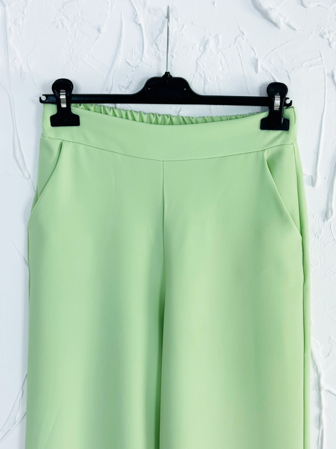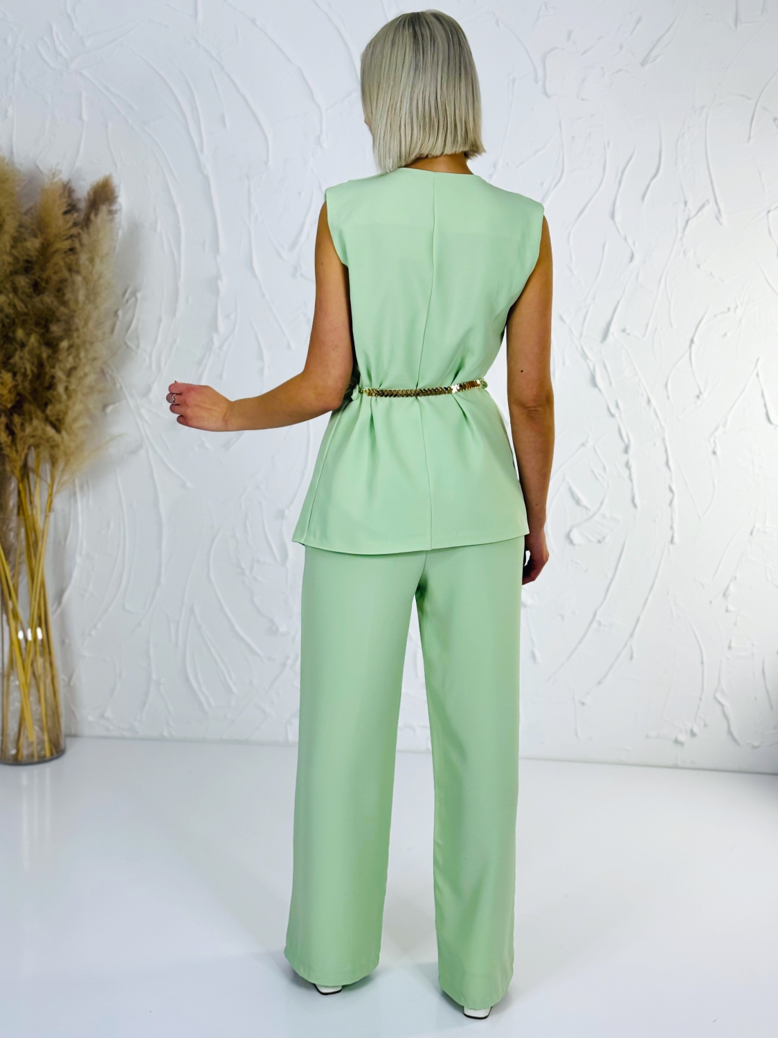 Elegantný dámsky kostým pozostávajúci z ľahkej vesty a pohodlných nohavíc predstavuje dokonalú kombináciu štýlu, ženskosti a moderného minimalizmu. Vesta má čistý, sofistikovaný strih bez rukávov, ktorý krásne zvýrazňuje líniu ramien a pôsobí veľmi vkusne a nadčasovo. Predĺžený strih vesty opticky zoštíhľuje postavu a zároveň dodáva celému outfitu jemnú eleganciu. Decentné zapínanie pri krku a precízne spracovanie detailov podčiarkujú luxusný vzhľad tohto kúsku. Nohavice sú navrhnuté s dôrazom na komfort a voľnosť pohybu, pričom ich splývavý materiál pôsobí ľahko a vzdušne. Širší strih nohavíc lichotí postave a vytvára harmonickú siluetu, ktorá je ideálna na rôzne príležitosti. Vysoký pás v kombinácii so zlatým opaskom nádherne zvýrazňuje ženské krivky a dodáva outfitu exkluzívny nádych. Práve zlatý opasok je výrazným detailom, ktorý celý kostým oživuje a robí z neho štýlový a neprehliadnuteľný kúsok. Celý komplet pôsobí veľmi elegantne a zároveň moderne, vďaka čomu je vhodný nielen na spoločenské udalosti, ale aj na rôzne oslavy, večere či štýlové denné nosenie. Jemná farebnosť dodáva outfitu sviežosť a ľahkosť, pričom sa jednoducho kombinuje s doplnkami a obuvou. Tento kostým je ideálnou voľbou pre ženy, ktoré chcú pôsobiť upravene, sebavedomo a zároveň si zachovať pohodlie počas celého dňa.