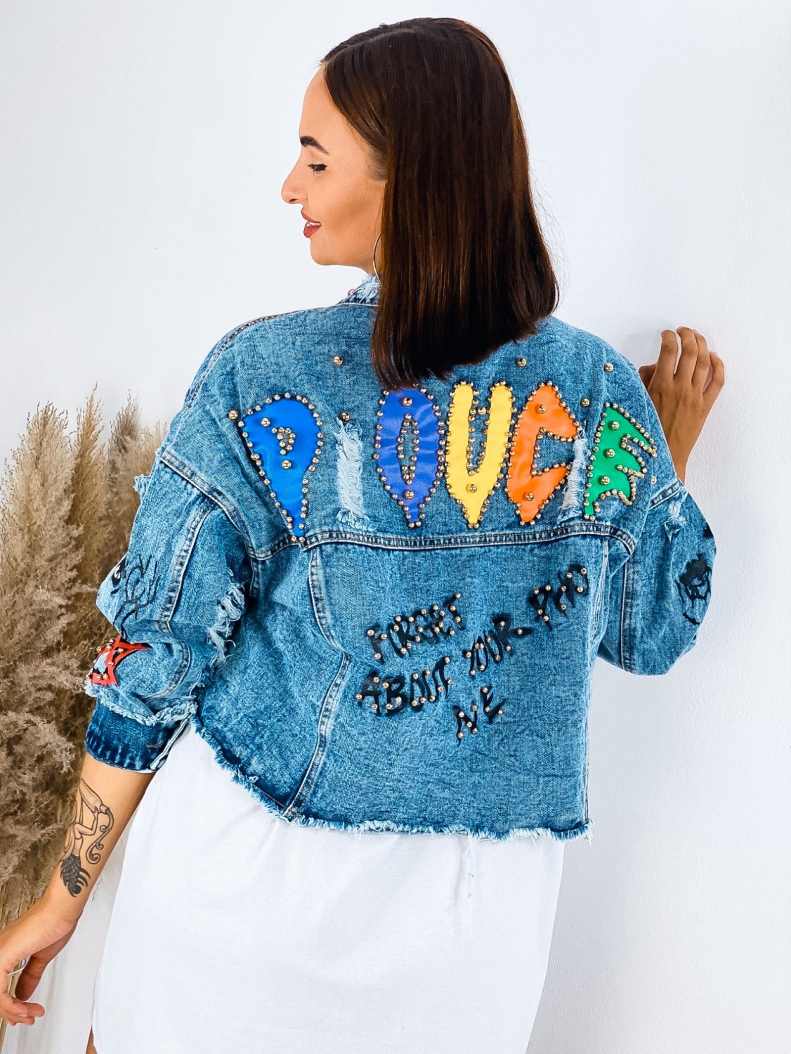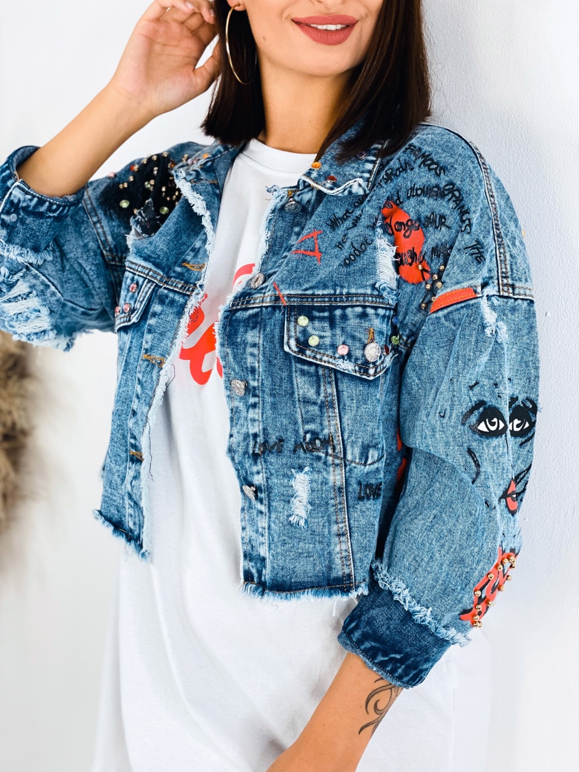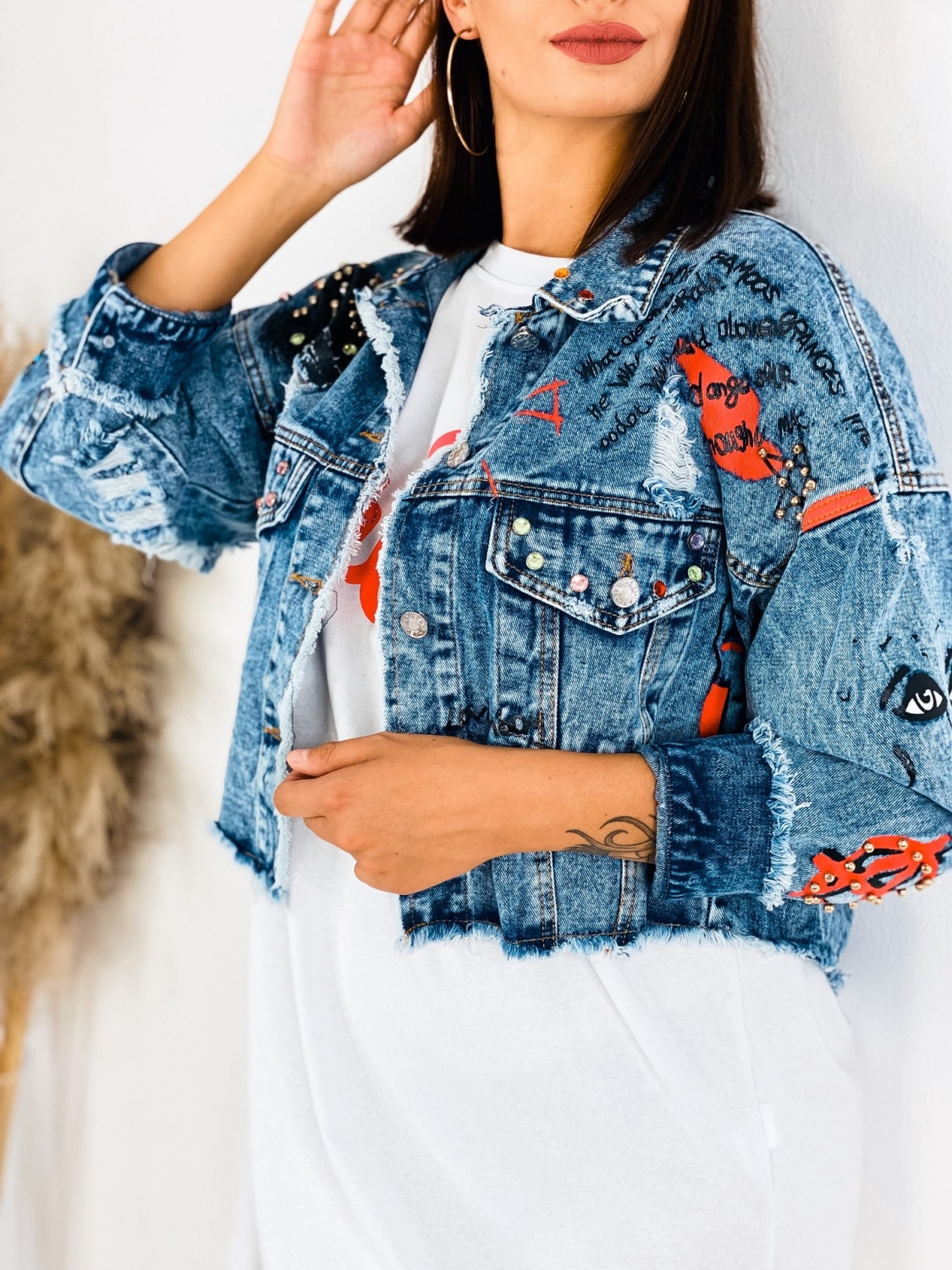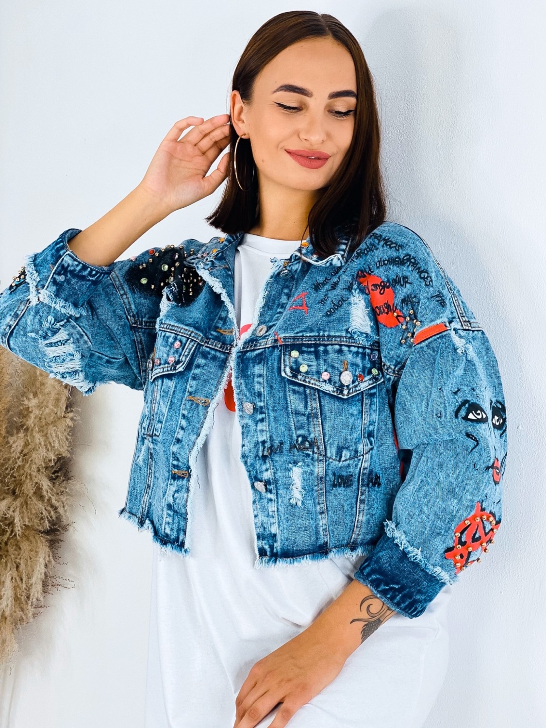 Milé dámy, predstavujeme Vám jednoznačný #musthave kúsok na túto sezónu. Rifľová krátka bunda GUELA, ktorá je doplnená nápismi a vybíjaním po celej dĺžke. Krátky strih. TOP kúsok do Vášho šatníka. Rifľová bunda je skvelým kúskom, ktorým doladíte akýkoľvek outfit. Hodí sa k šatám, rifliam, ale aj kraťasom. Je na Vás ako si ju nakombinujete. Jasné je len to, že rifľovina tu bola už dávno a ešte dlho tu s nami aj pobudne. Nesmrteľný kúsok, ktorý prichádza každú sezónu s malou obmenou. Modelka je vysoká 175 cm a oblečenú má veľkosť M/L.