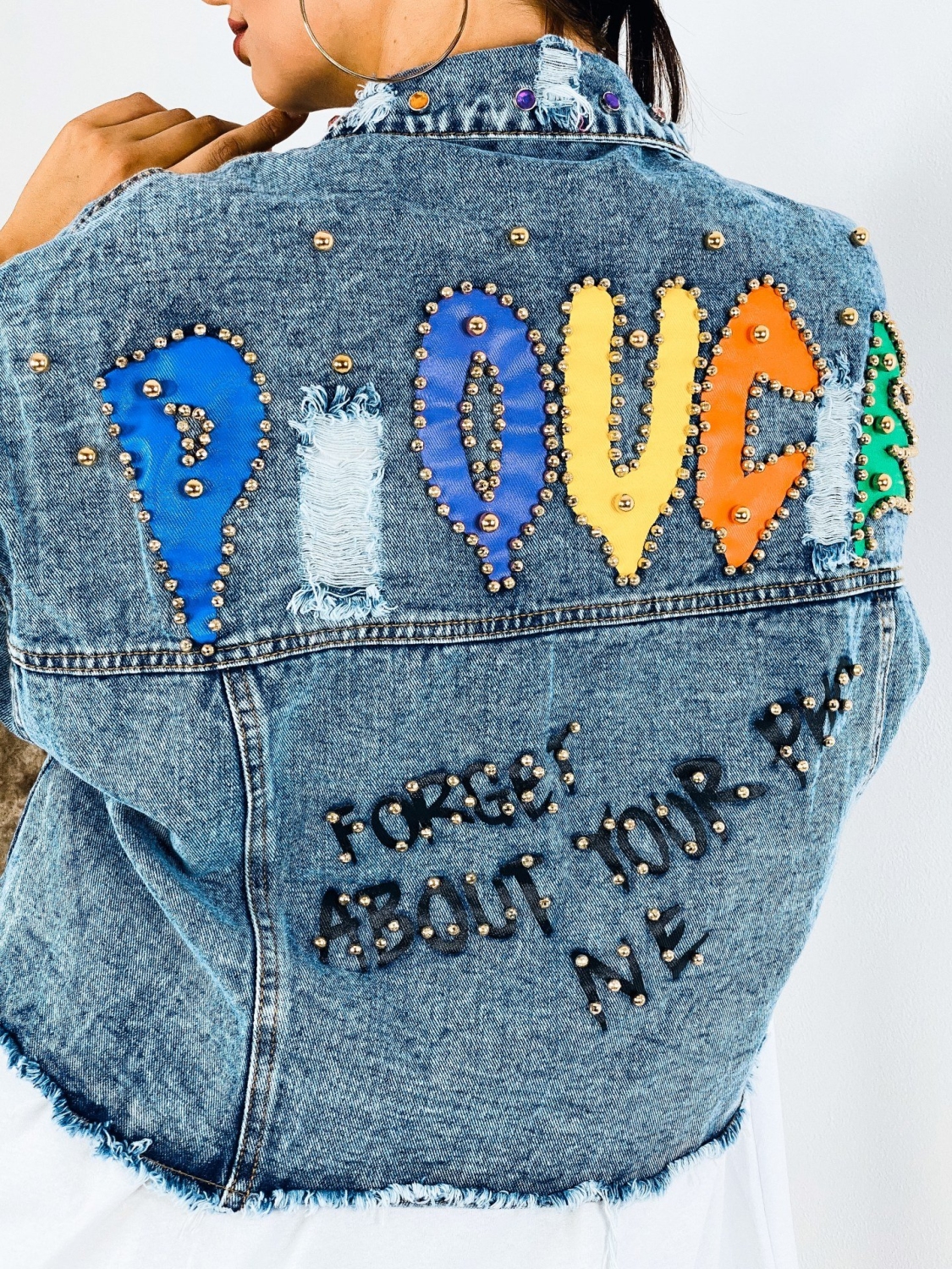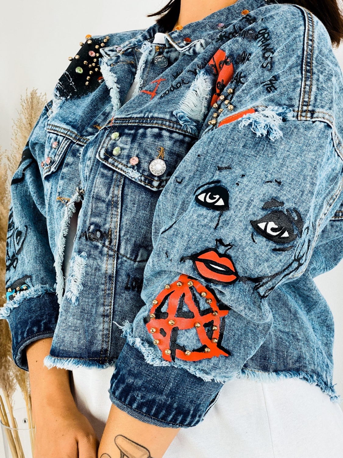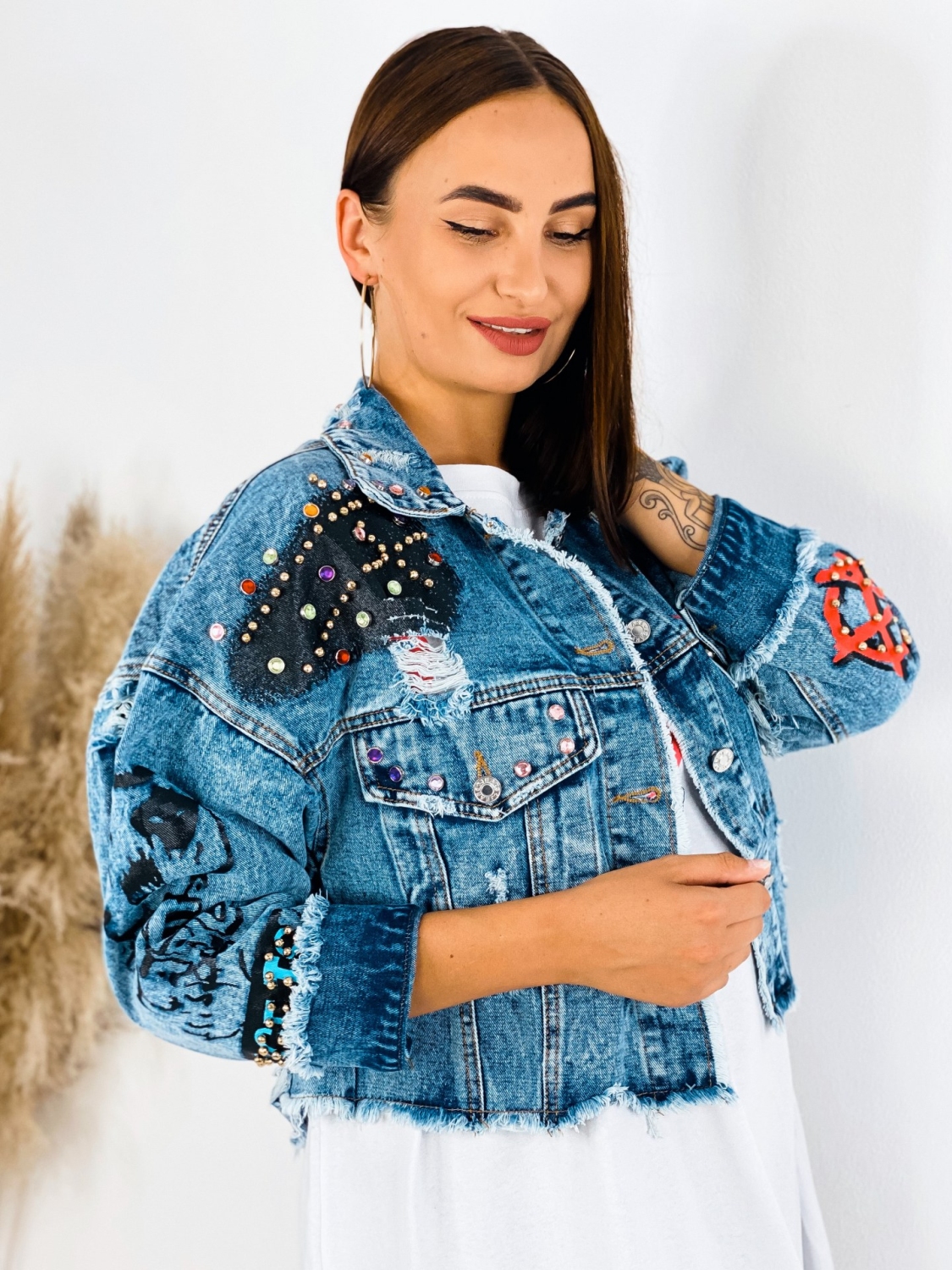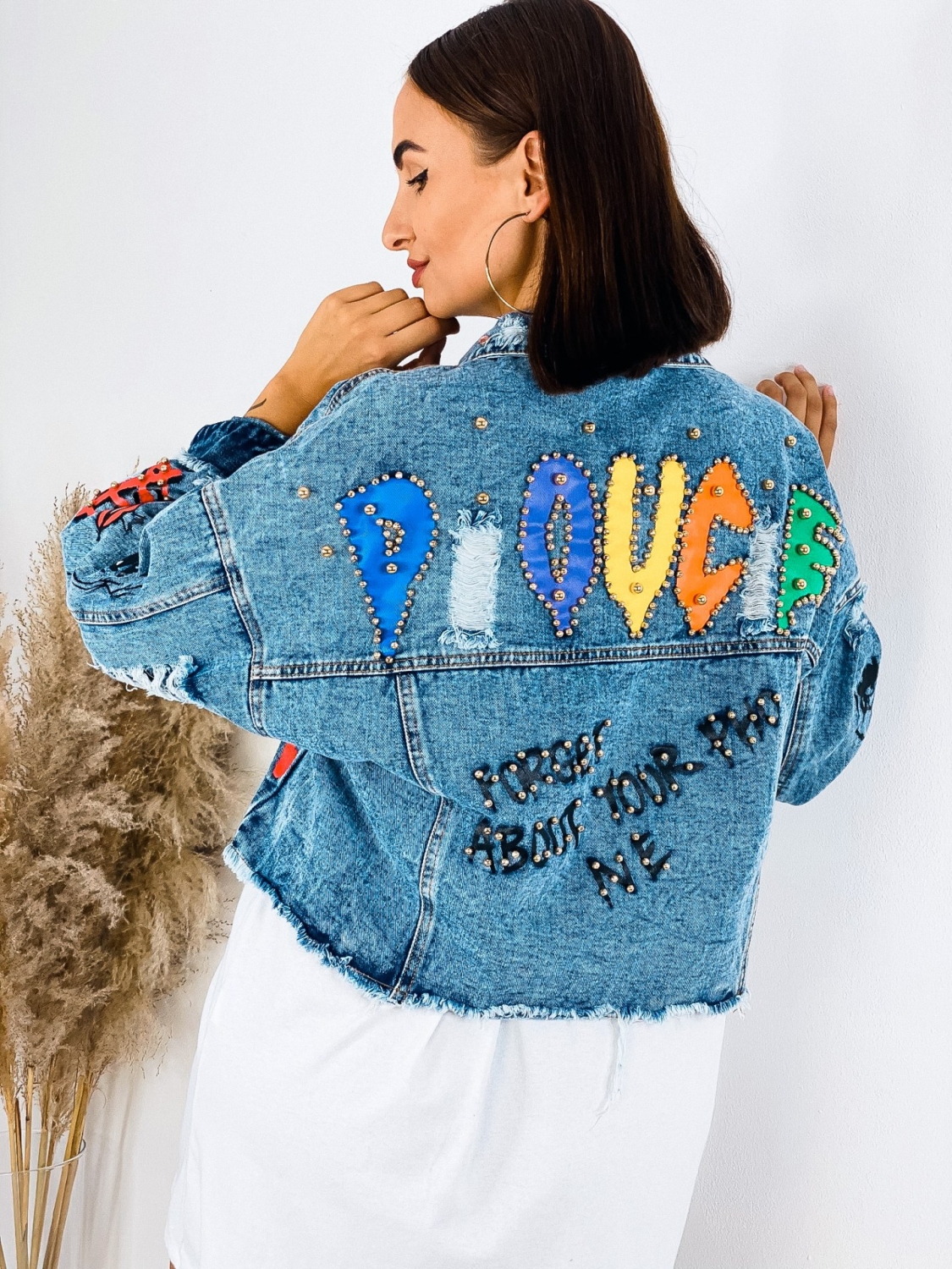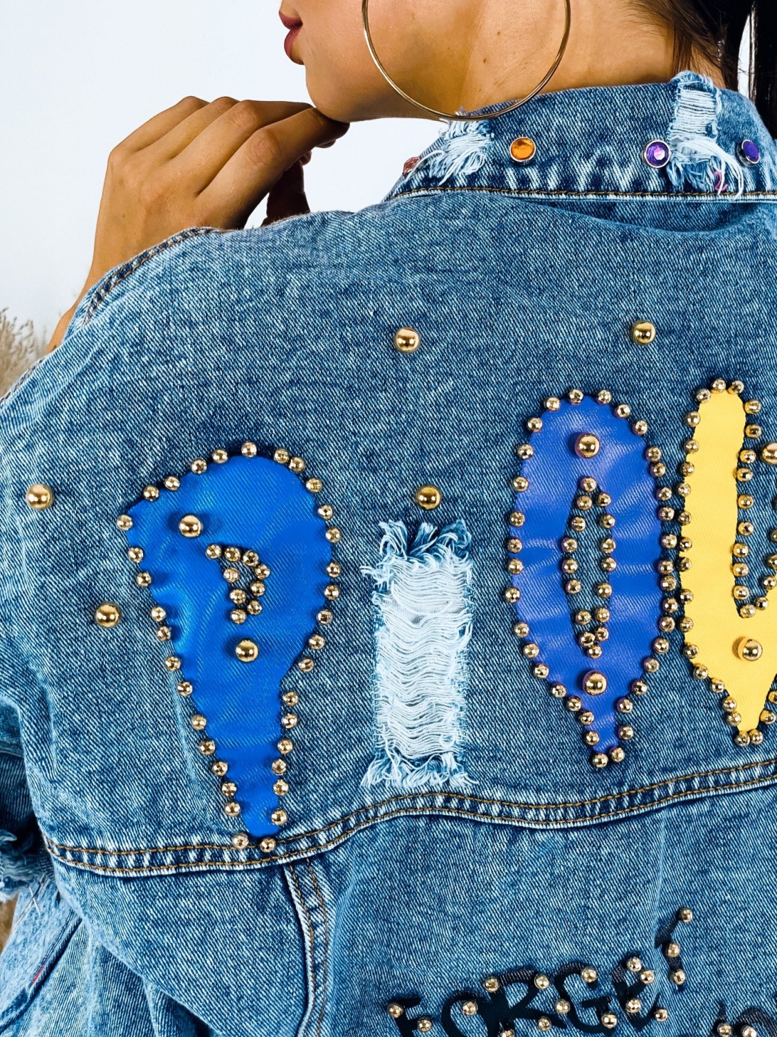Milé dámy, predstavujeme Vám jednoznačný #musthave kúsok na túto sezónu. Rifľová krátka bunda GUELA, ktorá je doplnená nápismi a vybíjaním po celej dĺžke. Krátky strih. TOP kúsok do Vášho šatníka. Rifľová bunda je skvelým kúskom, ktorým doladíte akýkoľvek outfit. Hodí sa k šatám, rifliam, ale aj kraťasom. Je na Vás ako si ju nakombinujete. Jasné je len to, že rifľovina tu bola už dávno a ešte dlho tu s nami aj pobudne. Nesmrteľný kúsok, ktorý prichádza každú sezónu s malou obmenou. Modelka je vysoká 175 cm a oblečenú má veľkosť M/L.