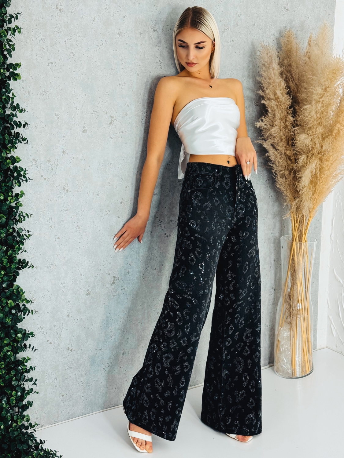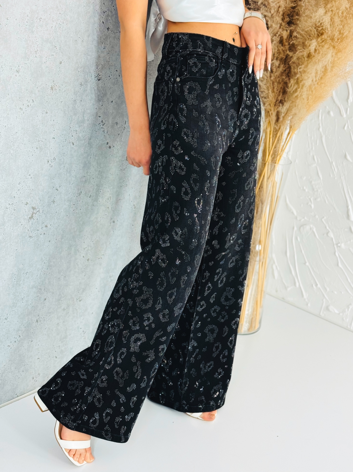Tieto exkluzívne čierne široké rifle s kamienkami po celej dĺžke sú dokonalým spojením štýlu, elegancie a moderného dizajnu. Vyrobené z kvalitného materiálu, ktorý sa jemne prispôsobí postave a poskytuje pohodlie počas celého dňa, tieto rifle sú vhodné na každodenné nosenie, spoločenské príležitosti alebo večerné výlety. Strih riflí je voľnejší a nohavice sa smerom nadol rozširujú, čím vytvárajú nadčasový a trendy vzhľad, ktorý zároveň lichotí postave a opticky predlžuje nohy. Kamienky po celej dĺžke riflí dodávajú outfitu luxusný a jemne trblietavý efekt, ktorý upúta pozornosť a pridáva rifliam sofistikovaný a moderný nádych. Vysoký pás alebo upravený strih zvýrazňuje ženskú siluetu, opticky zužuje pás a zabezpečuje, že rifle dokonale držia na svojom mieste, pričom poskytujú pohodlie a slobodu pohybu. Tieto široké čierne rifle s kamienkami sa ľahko kombinujú s elegantnými blúzkami, tričkami, topmi alebo svetríkmi, čím vzniká štýlový, moderný a zároveň pohodlný outfit.