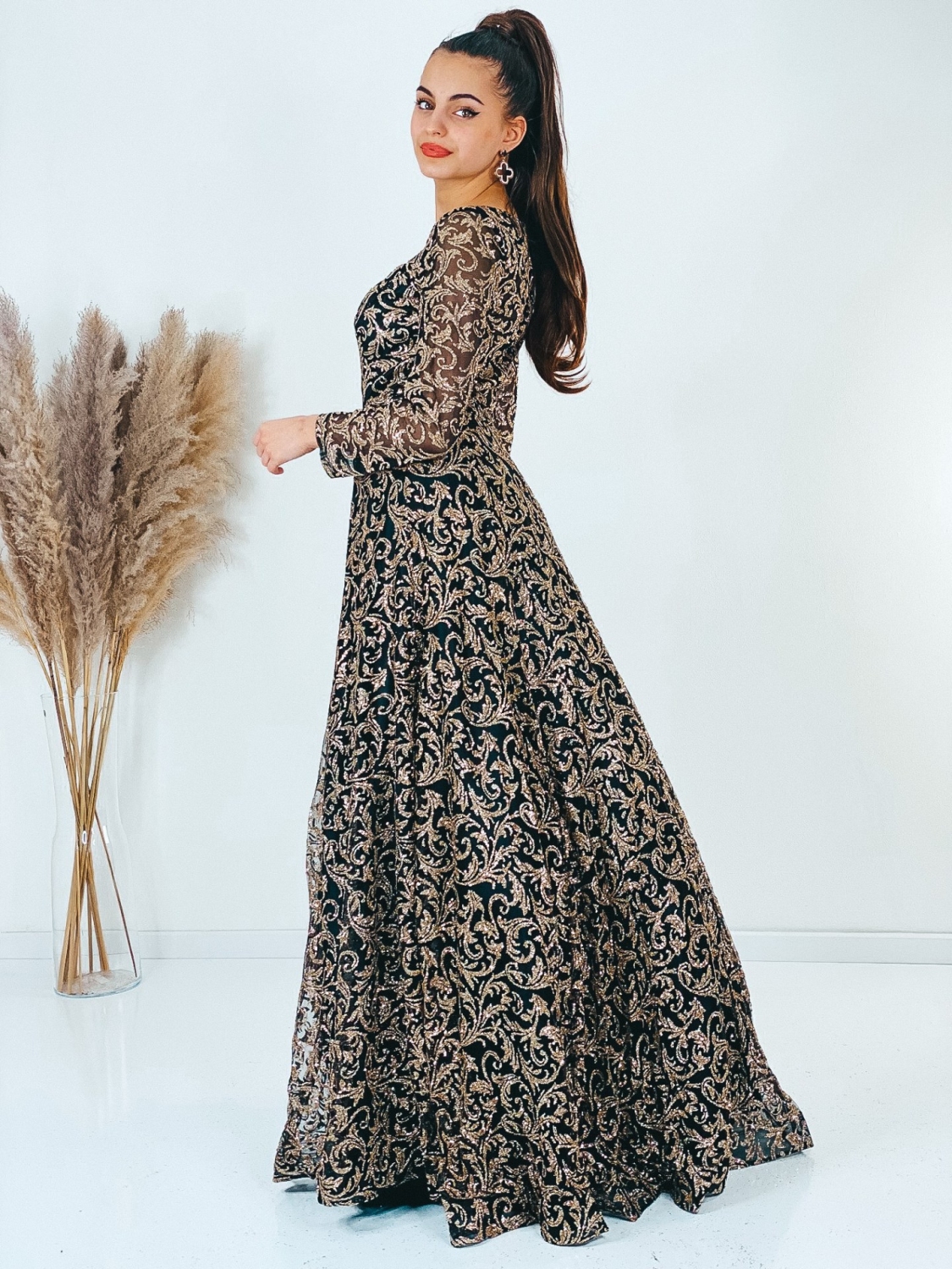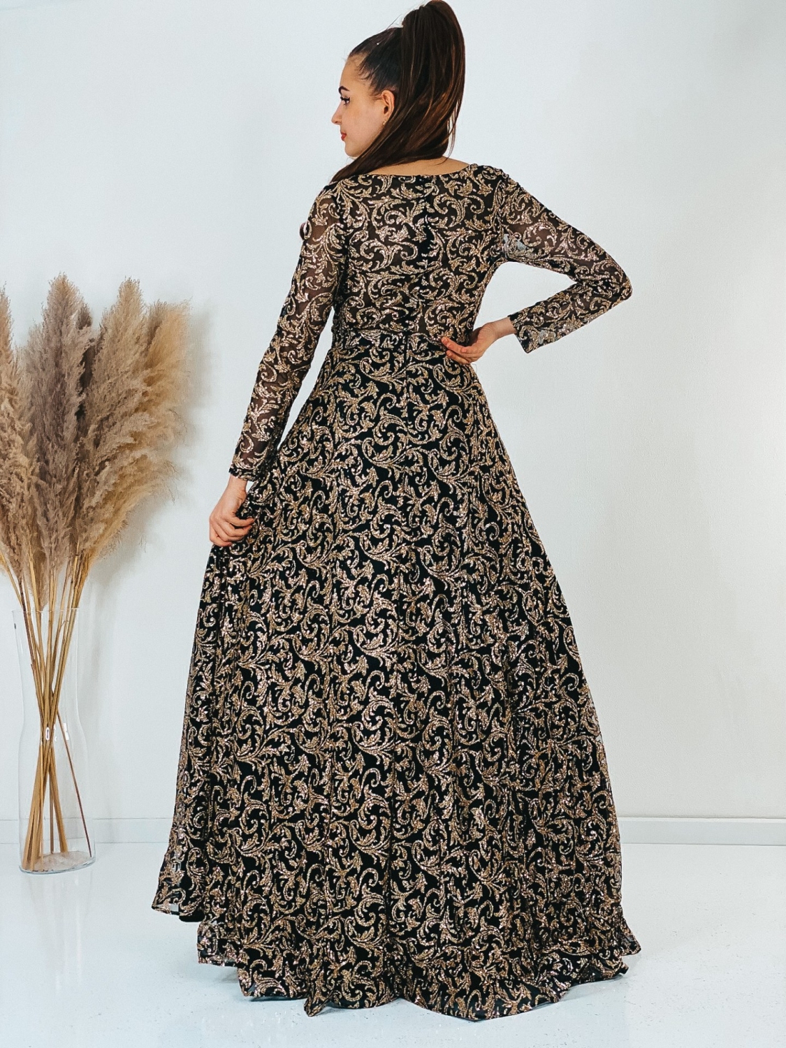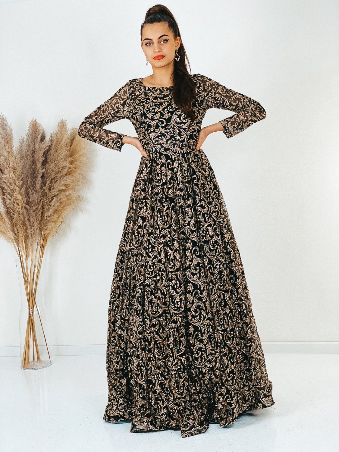 Exkluzívne dlhé spoločenské šaty, ktoré sú určené aj pre moletky v trblietavom prevedení, v ktorých zažiari každá dáma. Veľmi luxusný a zároveň neopakovateľný štýlový kúsok z našej ponuky, ktorý očarí každú z Vás a samozrejme aj ostatných okolo Vás. Vhodné sú na rôzne spoločenské udalosti ako je svadba, stužková slávnosť či ples. Spoločenské šaty majú vystužené prsia a nádherný vzor. Okruhlý výstrih so zapínaním vzadu na zips. Luxusný áčkový strih a TOP farba. Model šiat v ktorých budete skutočná prizncená. Šaty sa skvelo prispôsobia Vašej postave. Modelka meria 175 cm a má oblečenú veľkosť S.