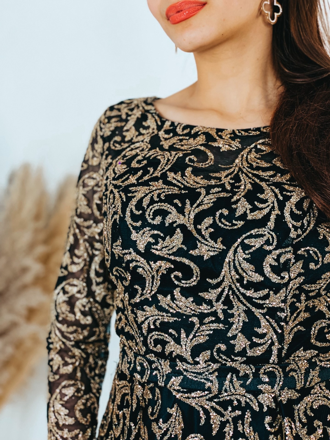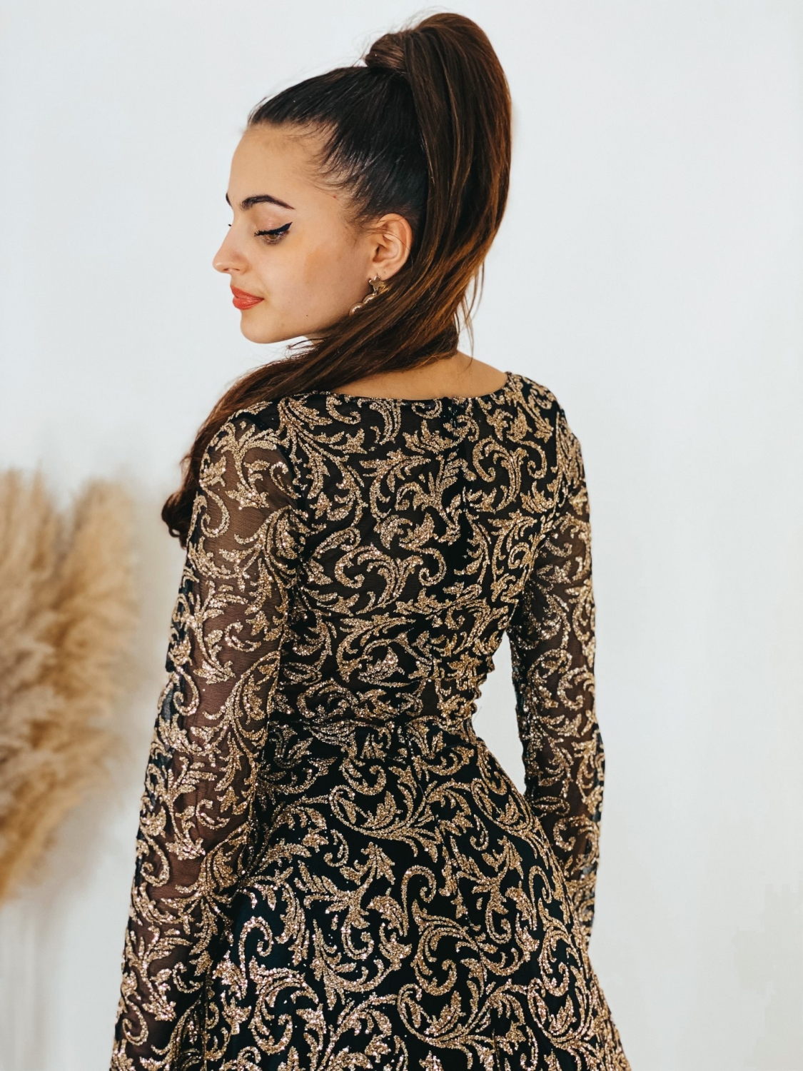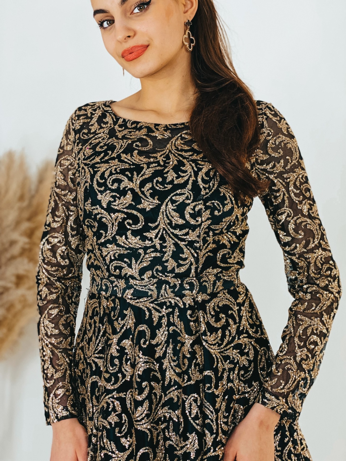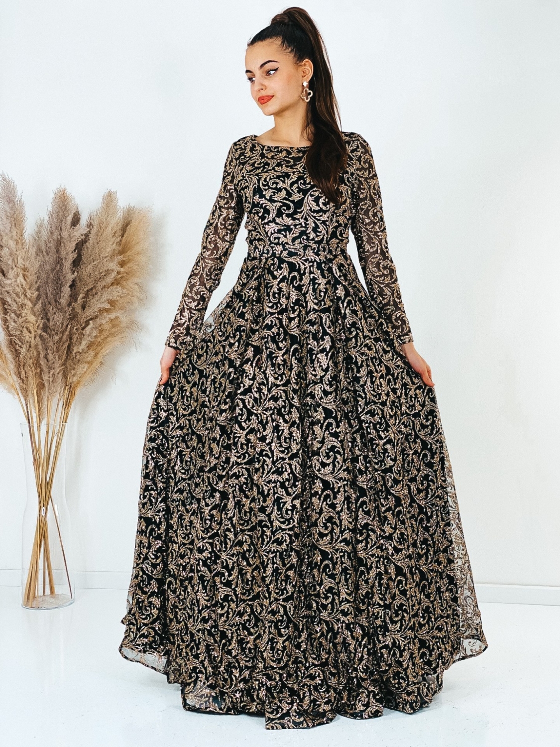 Exkluzívne dlhé spoločenské šaty, ktoré sú určené aj pre moletky v trblietavom prevedení, v ktorých zažiari každá dáma. Veľmi luxusný a zároveň neopakovateľný štýlový kúsok z našej ponuky, ktorý očarí každú z Vás a samozrejme aj ostatných okolo Vás. Vhodné sú na rôzne spoločenské udalosti ako je svadba, stužková slávnosť či ples. Spoločenské šaty majú vystužené prsia a nádherný vzor. Okruhlý výstrih so zapínaním vzadu na zips. Luxusný áčkový strih a TOP farba. Model šiat v ktorých budete skutočná prizncená. Šaty sa skvelo prispôsobia Vašej postave. Modelka meria 175 cm a má oblečenú veľkosť S.