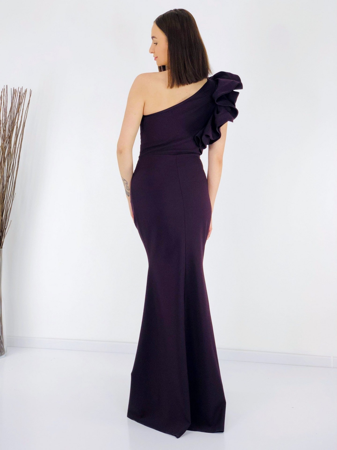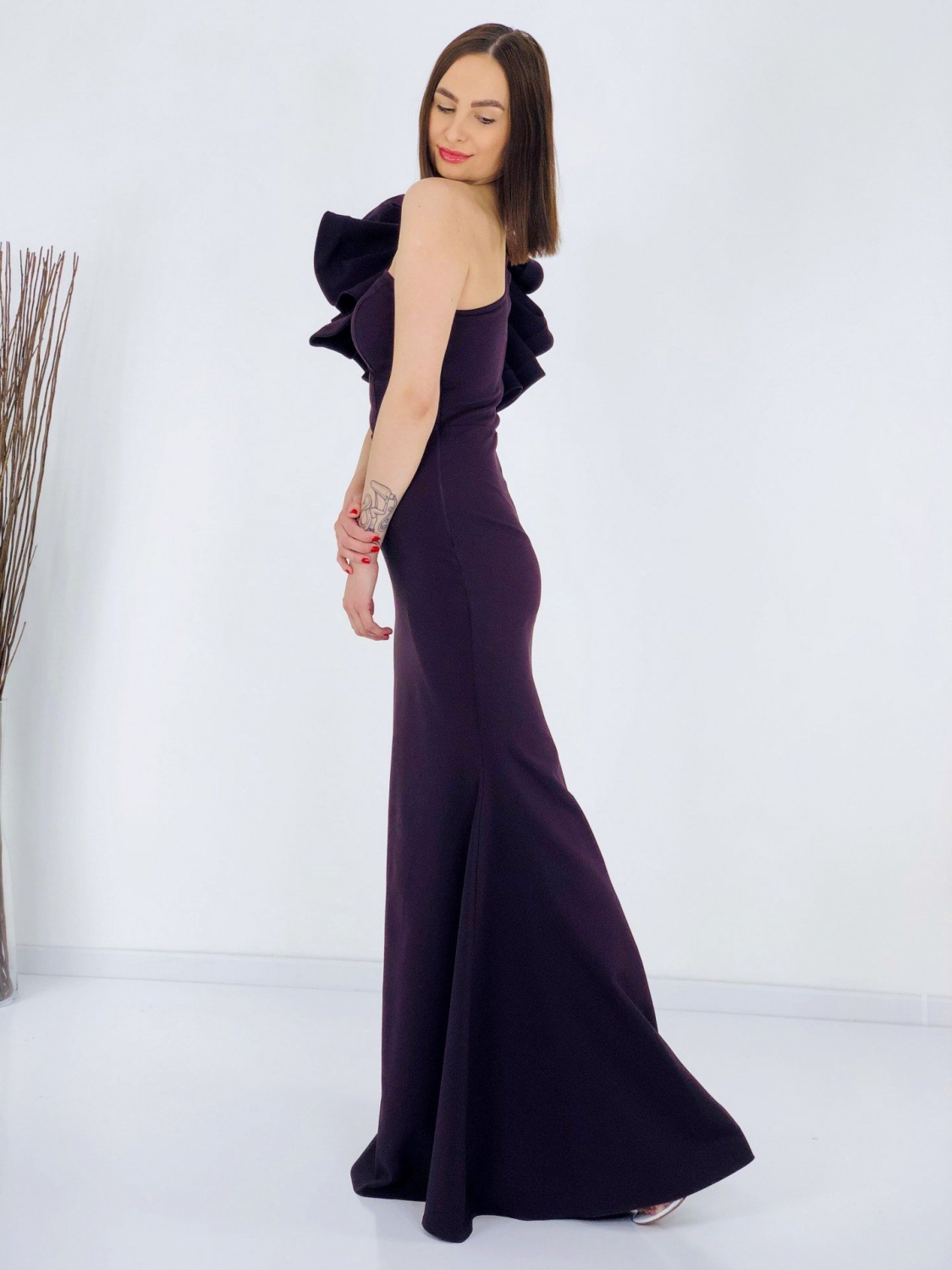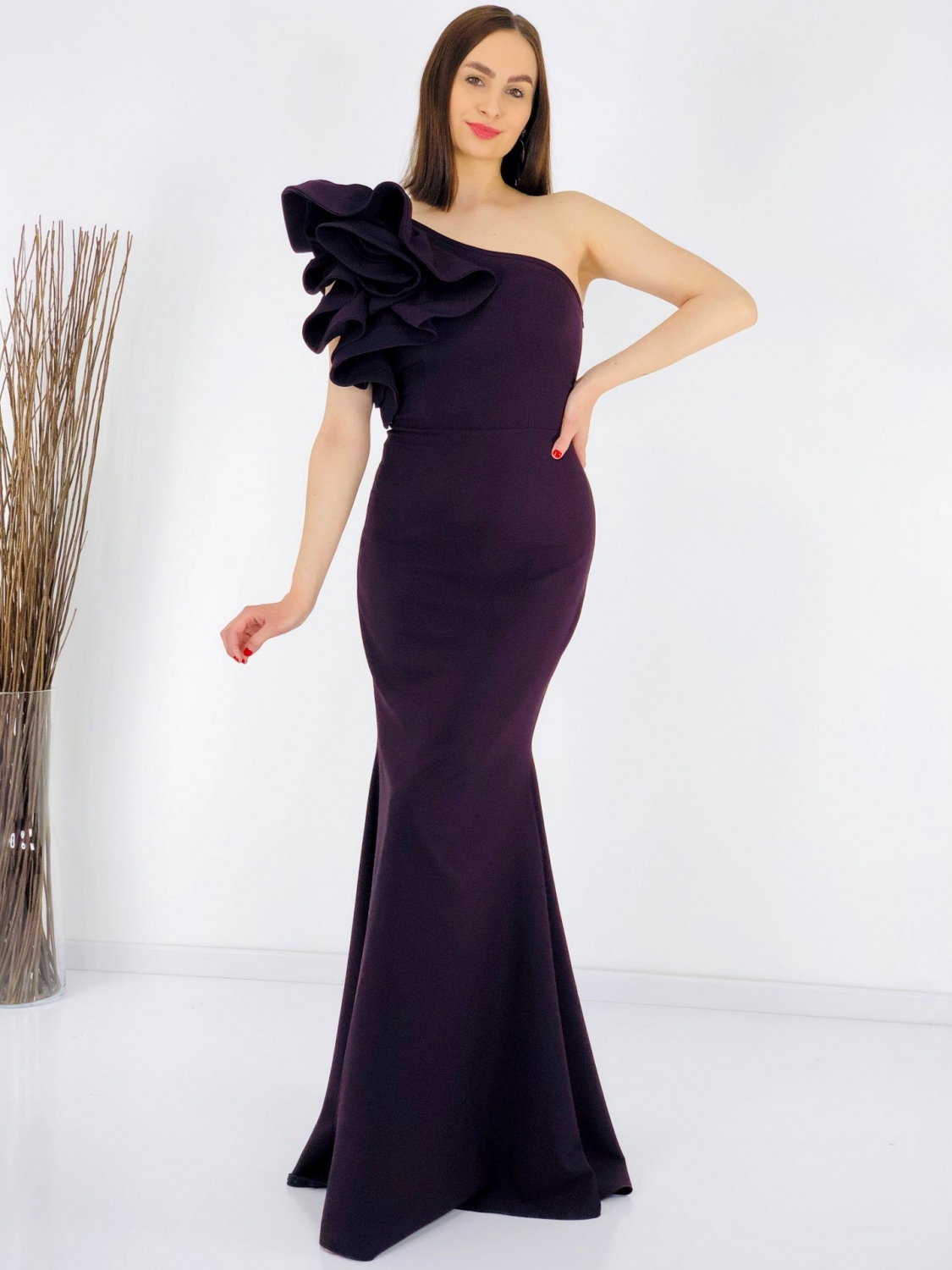 Dámske exkluzívne dlhé šaty s volánom na pravej strane. Šaty sú vyrobené z príjemného a mierne elastického materiálu. Tento model využijete na spoločenské príležitosti ako svadby a oslavy. Vhodné aj ako šaty pre družičky na svadbu. Môžete ich doplniť spoločenskou kabelkou a lodičkami. Využijete ich na akúkoľvek príležitosť a neostanú Vám visieť v skrini po jednej akcii, to Vám sľubujeme:). Šaty sa zapínaju zboku na zips. Módny kúsok pre moderné ženy. Modelka je vysoká 175 cm a má oblečenú veľkosť 40.