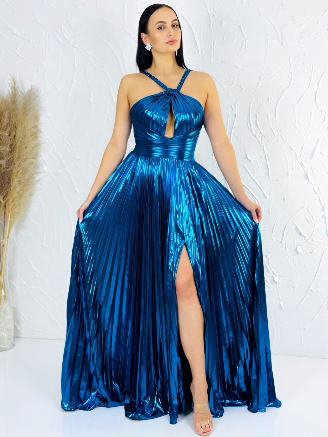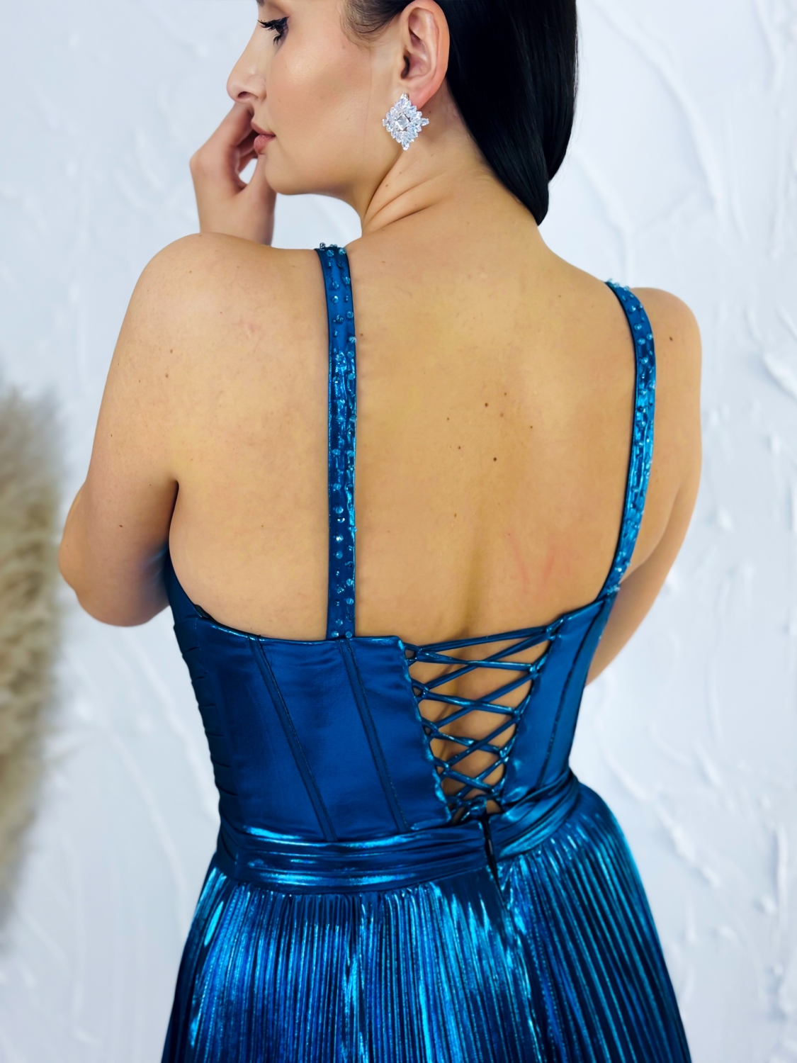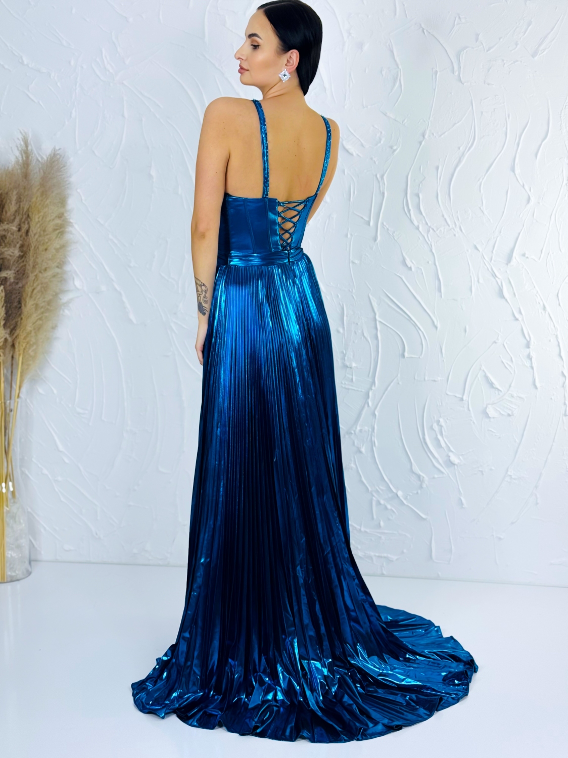 Tieto šaty sú stvorené pre ženy, ktoré milujú pocit výnimočnosti a chcú pri každom kroku pôsobiť ako hviezda večera. Lesklý povrch nádherne odráža svetlo, čo dodáva šatám luxusný efekt a elegantný nádych. Materiál splýva po postave s jemnou ľahkosťou, pričom ju prirodzene zvýrazňuje tam, kde je to najkrajšie. Dominantným prvkom šiat je vysoký rozparok, ktorý dodáva modelu zvodnosť a ženskú sebaistotu. Pri chôdzi či tanci vytvára krásny, dynamický pohyb látky a necháva jemne vyniknúť nohy – stále však veľmi vkusne a sofistikovane. Šaty majú šnurovačku na chrbte, vďaka ktorej sa prispôsobia postave ako na mieru. Tento detail nie je len estetický – umožňuje dokonale dotvarovať siluetu, zúžiť pás, spevniť vrchnú časť a zabezpečiť pohodlné nosenie počas celého večera. Šnurovanie jemne odhaľuje chrbát, čo dodáva šatám romantický a zároveň exkluzívny vzhľad. Strih šiat je navrhnutý tak, aby pôsobil štíhlo, elegantne a opticky predlžoval postavu. Hodí sa na vyššie aj nižšie postavy, pretože dĺžka a lesk nádherne vytvárajú efekt „večernej kráľovnej“.